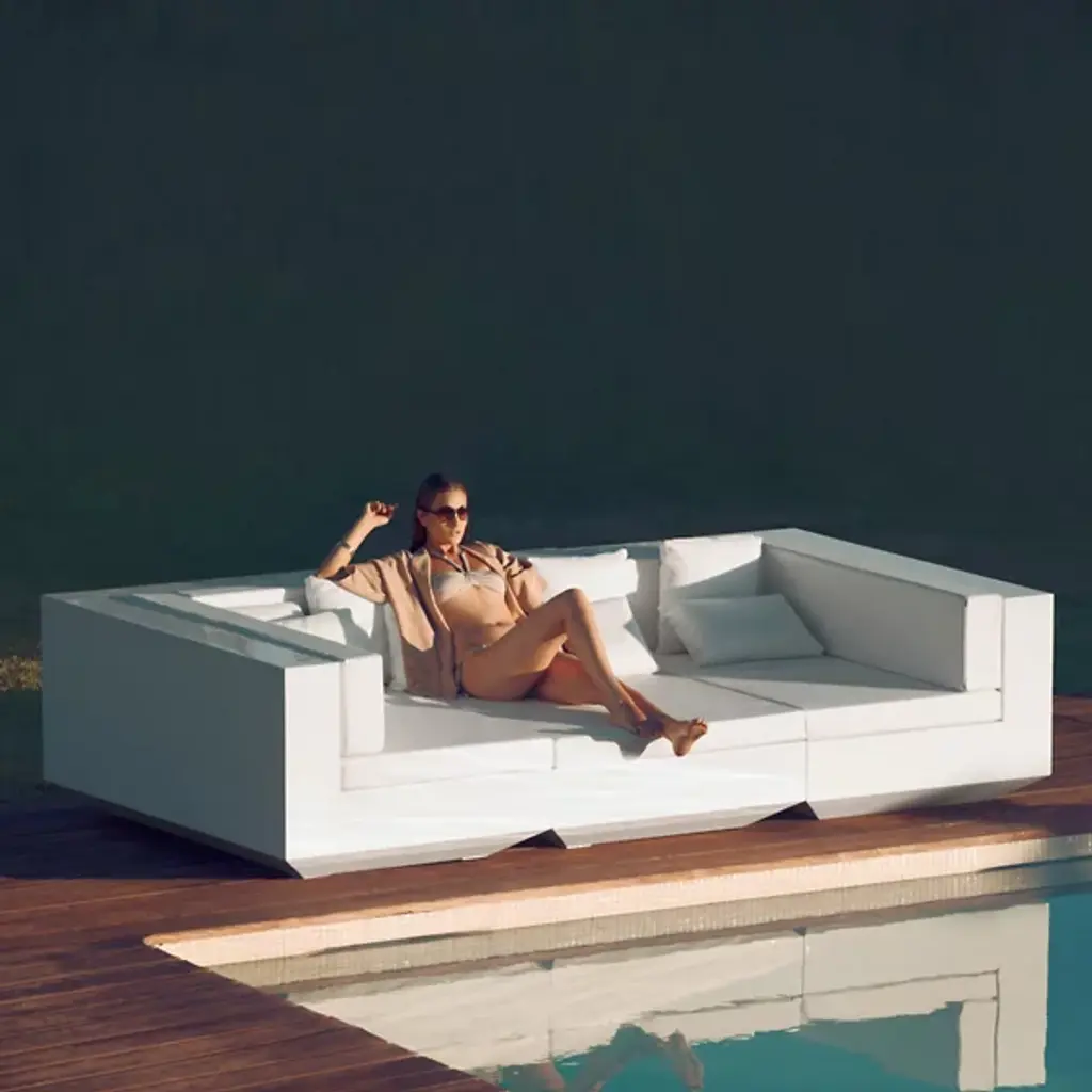 To an indoor or outdoor lounge area, the Vela Outdoor Sofa Armless Chaise Section adds comfort and contemporary style all its own, or as a component of a larger Vela sectional sofa. The molded matte white polyethylene base is thick, yet light-looking with its inwardly angular form. The two cushions for the seat and back are upholstered in matching white all-weather vinyl.