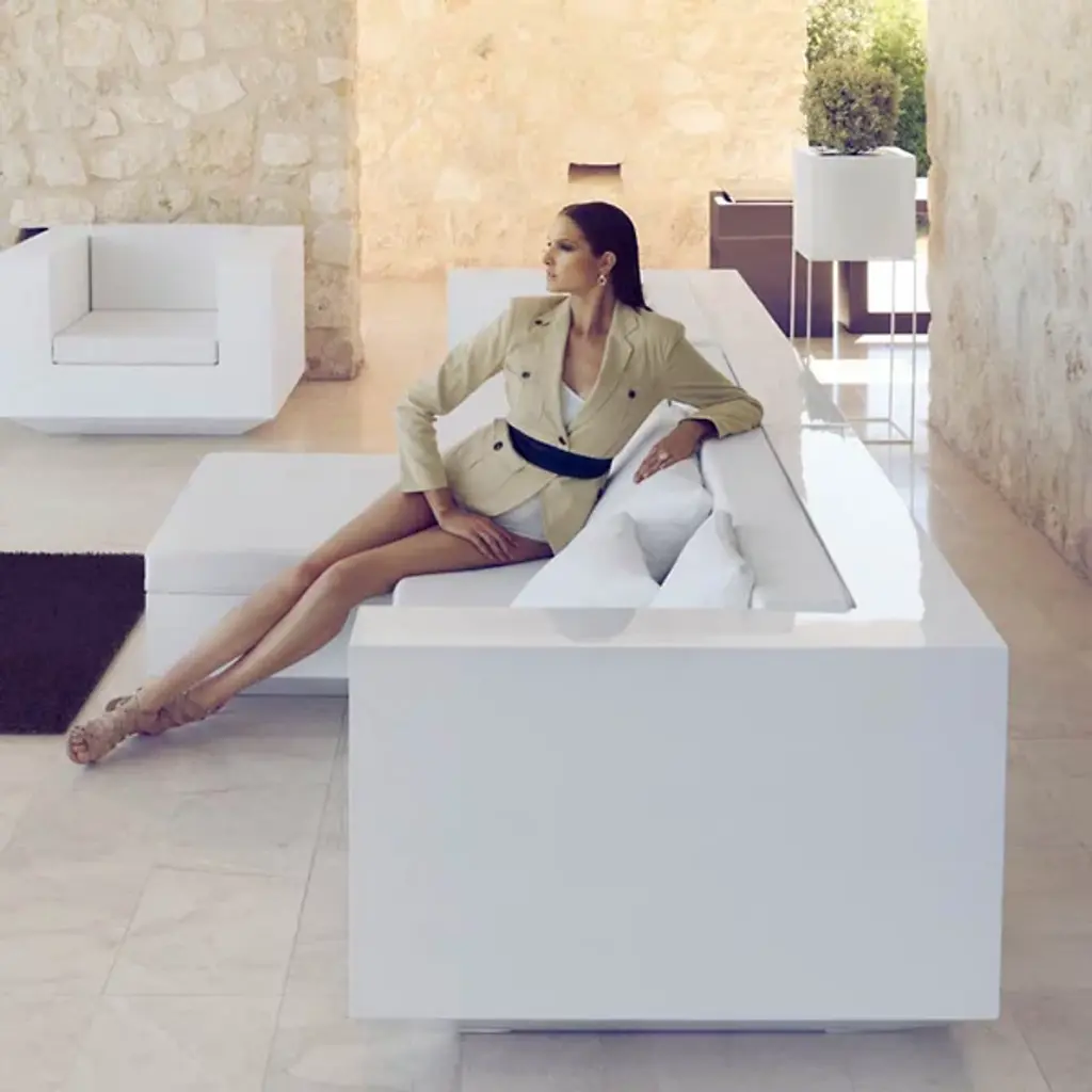 If you like a little more room in your sectional, the Vela Outdoor Sofa XL Left Arm Section is there to provide it. This modular component of the Vela sectional sofa is nearly 2 feet longer than the standard Vela Left Arm Section. It includes the same angular base made out of matte white polyethylene and sharply tailored--yet soft-feeling--cushions in matching white all-weather vinyl.