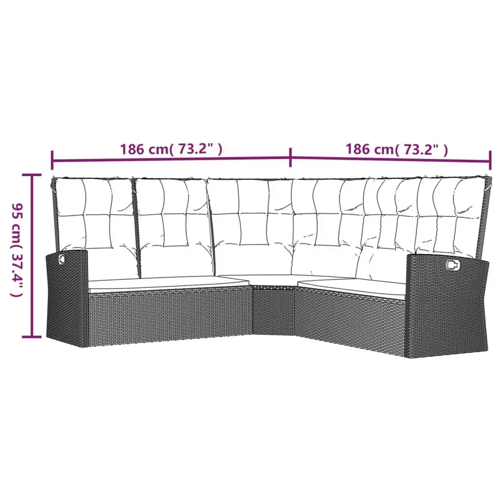 The reclining patio corner sofa is an ideal choice for you to relax and enjoy the weather, take a nap, or chat with your family or friends.Durable material: PE rattan, also known as poly rattan, is weather resistant and easy to clean. It remains beautiful on the outside for a long period of time. It's more economical than other materials while offering great quality, convenience and an aesthetic look.Sturdy and stable frame: The powder-coated steel frames make the garden sofa sturdy and stable for daily outdoor use.Adjustable backrest: Thanks to the gas lift mechanism, the outdoor sofa's backrest is adjustable to fit your positions. By touching the button on the side, the backrest can recline, for a comfortable position.Comfortable seating: These thickly padded and removable cushions of the garden seating are highly comfortable that add an extra comfortable seating experience. Good to know:To make assembly as easy as possible, each product is delivered with a manual.Note:To make sure your outdoor furniture stays beautiful, we recommend protecting it with a waterproof cover.Color: GrayCushion color: Dark grayMaterial: PE rattan, powder-coated steelCushion cover material:Fabric (100% polyester)Cushion filling material: FoamBack cushion filling material: Fiber cottonDimensions (not reclined): 73.2" x 73.2" x 37.4" (L x W x H)Dimensions (reclined): 73.2" x 84.6" x 31.9" (L x W x H)Corner sofa seat cushion dimensions:43.3" x 19.7" x 1.2"/ 21.7" x 21.7" x 1.2" (L x W x T)Back cushion dimensions:21.7" x 25.6" x 3.9" (L x W x T)Seat height from the ground: 11.8"Maximum load capacity (per seat): 220.5 lbDelivery contains:1 x Reclining corner sofa3 x Seat cushion6 x Back cushion