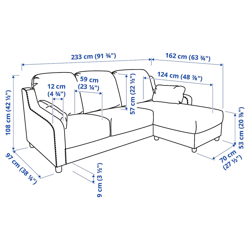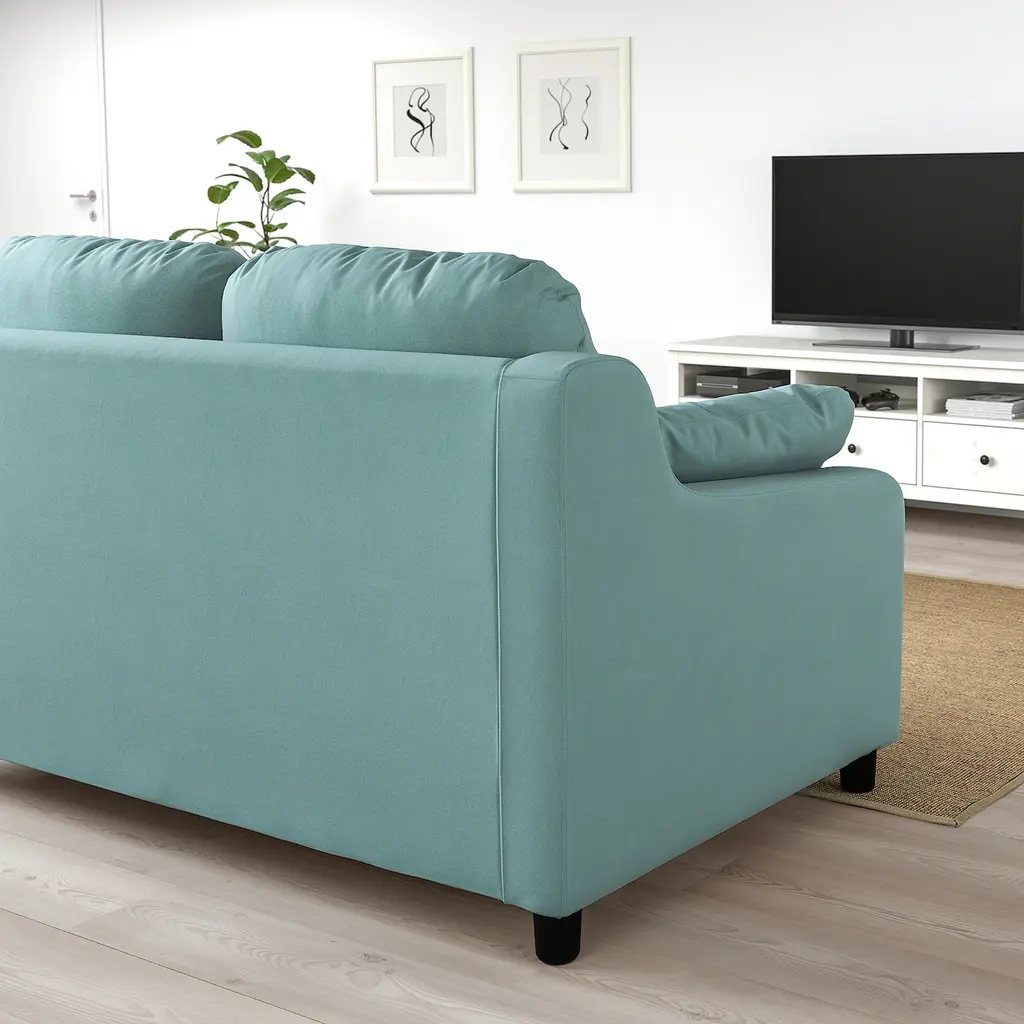 VINLIDEN Sofa with chaise - Hakebo light turquoise. VINLIDEN sofa has generous proportions with a high back and large, soft cushions that allow you to sink into the sofa. Hakebo cover feels soft and smooth and has a nice texture that makes the sofa comfortable and inviting.