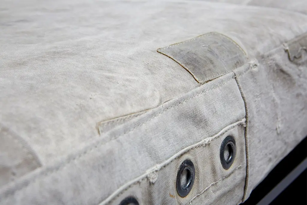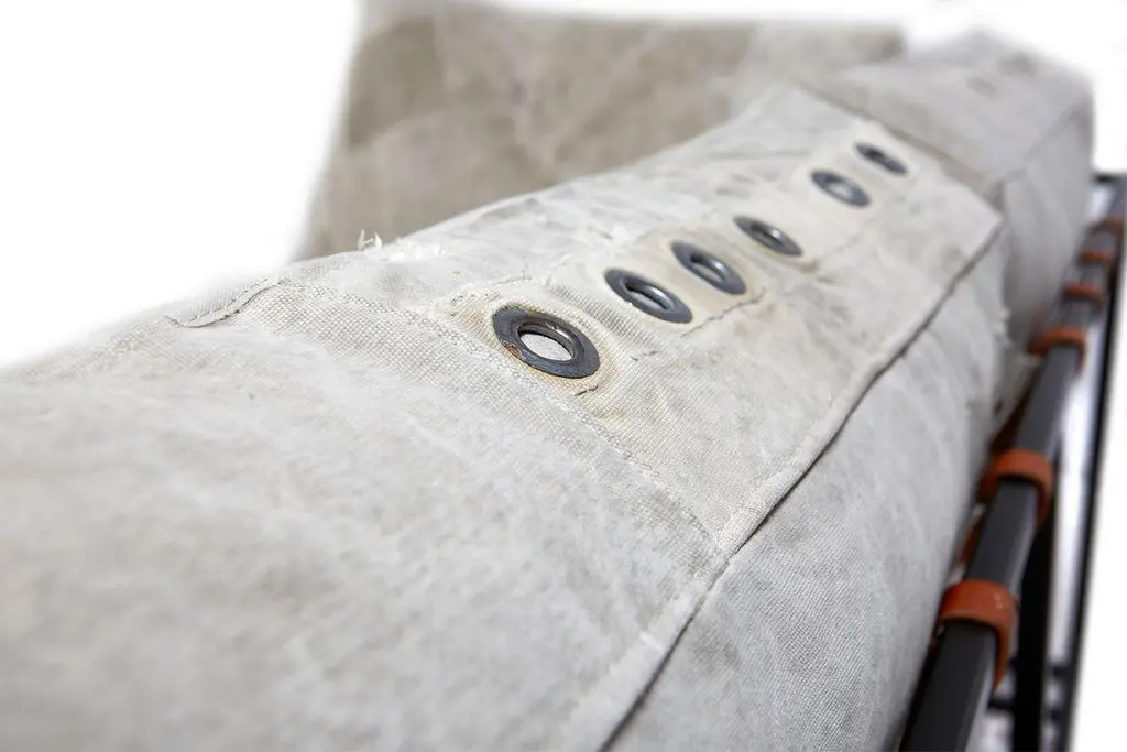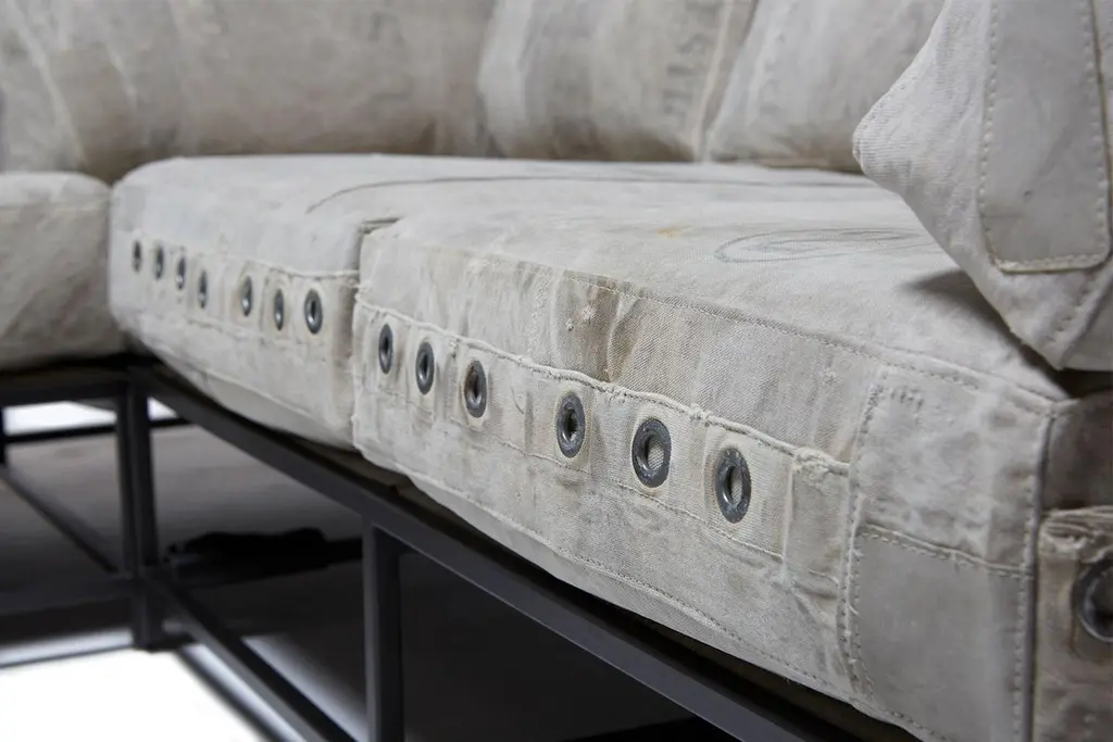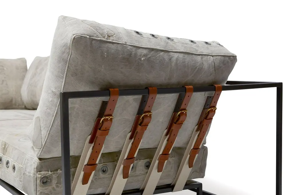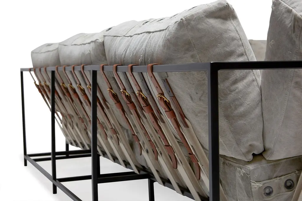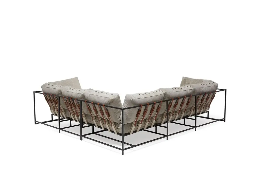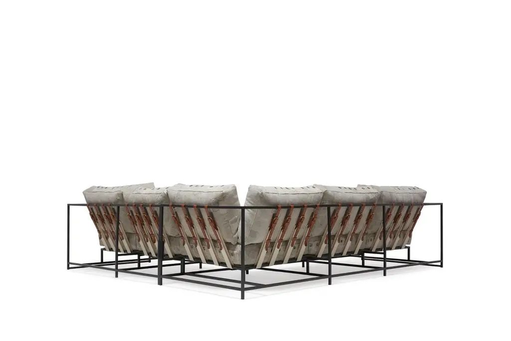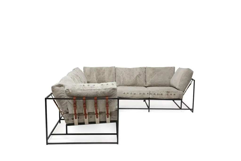 Stephen Kenn's Inheritance Collection sectionals are a great to customize your space and create the ultimate lounge environment.Since first designing Inheritance Collection, Stephen Kenn has been inspired by the inherent history in vintage materials. Each piece of washed canvas used in this upholstery is distinctive and will have unique markings from its long history of use as a mailbag. The foam seat cushions have been wrapped in polyfiber, allowing for a soft and comfortable lounge experience. Sitting atop a blackened steel frame, the piece has support belts featuring natural cotton webbing, aged veg tan leather, and antique buckles. This variation is composed of two separate pieces that can be linked together with a coordinating leather cuff or used independently if desired. Our US mailbag canvas is a vintage material, and as such has some small imperfections, stamps, lettering. There is also shade variation in greys and creams.Every Stephen Kenn piece is made to order through our Los Angeles studio. We create these pieces utilizing a number of small businesses and fabricators in the LA area.