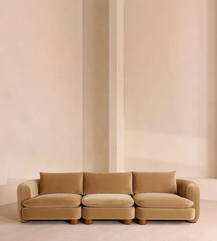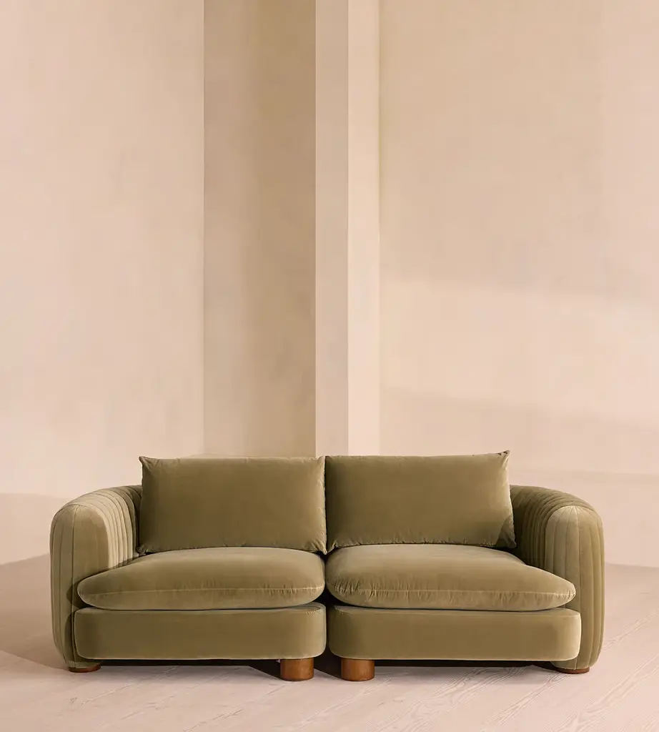 The eighth floor at White City House forms the inspiration for the Vivienne modular sofa. Upholstered in rich velvet, it features pleated stitch detailing, cylindrical legs and a wraparound back. Low lounge sitting makes this piece ideal for cosy evenings. Coordinate and configure with other pieces in the Vivienne collection for the sofa shape of your choice.