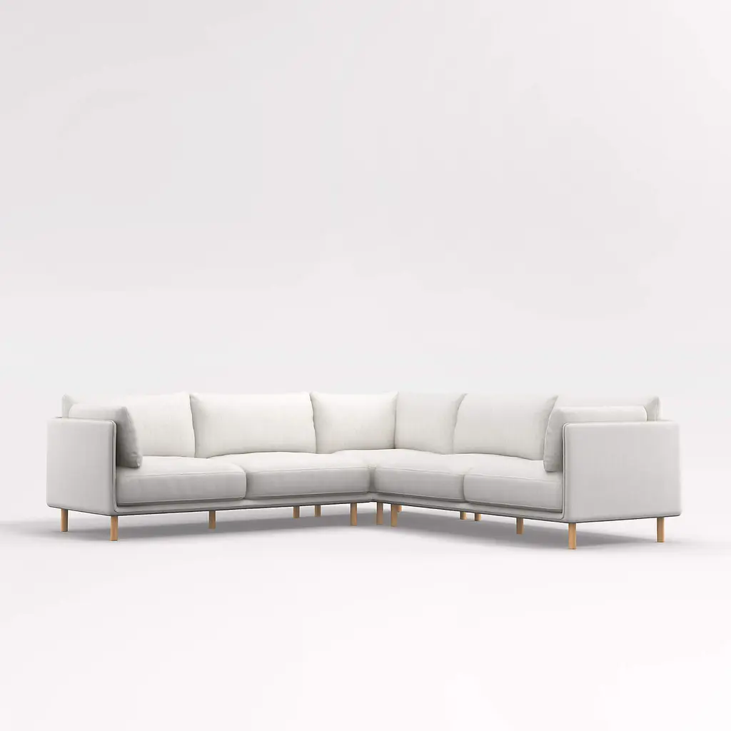 Modern, sophisticated and undeniably inviting, our Wells L-shaped sectional tucks plump cushions onto a slim frame supported by sustainably sourced solid wood legs with a natural finish. Low decks allow plenty of room for indulgent seat cushions that encourage you to linger. Tailored with top stitching and French seams on the cushions and a crisp micro-flange outlining the frames, the soft twill fabric suits active family life and cleans up beautifully. Joining right- and left-arm sofas with a corner, our Wells three-piece sectional is a Crate & Barrel exclusive.