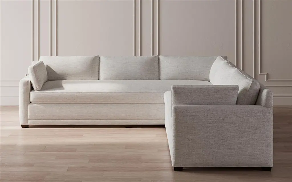 With a generous profile and plush box cushions, the right 123” Weybridge corner sectional is perfect for large gatherings. Streamlined track arms and tapered wood legs elevate the simple, modern silhouette. Soft and supportive cushioning offers plush, cloud-like comfort, with a foam core surrounded by a blend of fiber, down, and feather fill. The long bench seat provides uninterrupted comfort. Choose from a variety of upholstery options, including linen, velvet, and performance fabrics.