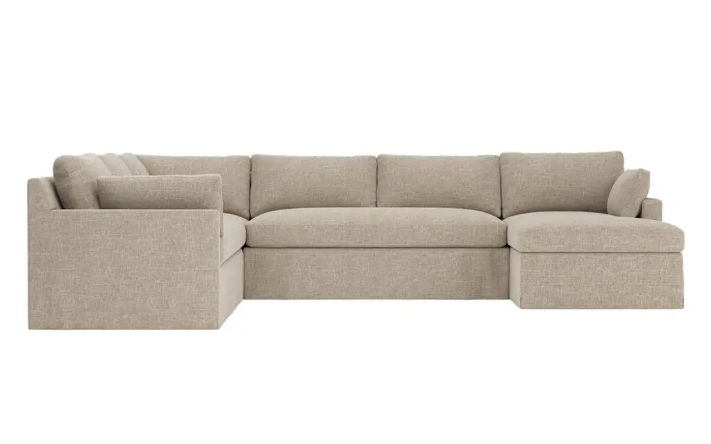 With a generous profile and plush box cushions, the right 110” Weybridge corner sectional is perfect for large gatherings. Streamlined track arms and tapered wood legs elevate the simple, modern silhouette. Soft and supportive cushioning offers plush, cloud-like comfort, with a foam core surrounded by a blend of fiber, down, and feather fill. The long bench seat provides uninterrupted comfort. Choose from a variety of upholstery options, including linen, velvet, and performance fabrics.