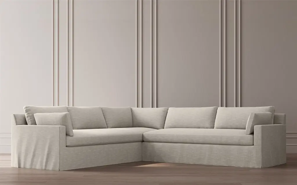 The right 110” Weybridge slipcovered corner sectional is a cozy foundation for the heart of any family room. A gently draped slipcover softens the look of its clean-lined, modern silhouette. Soft and supportive cushioning offers plush, cloud-like comfort, with a foam core surrounded by a blend of fiber, down, and feather fill. The long bench seat provides uninterrupted comfort. Choose from washable slipcover fabrics in a variety of serene hues.