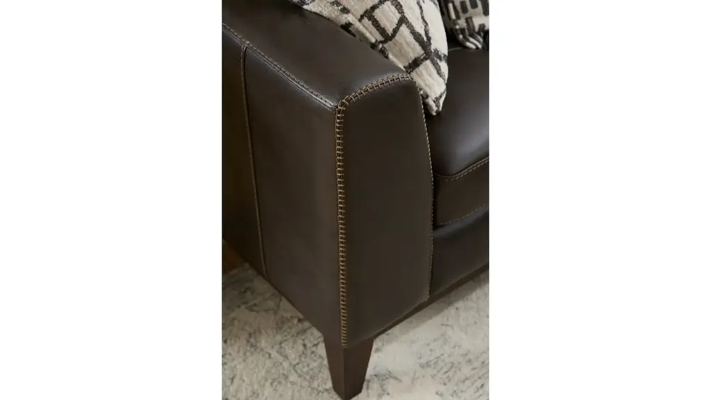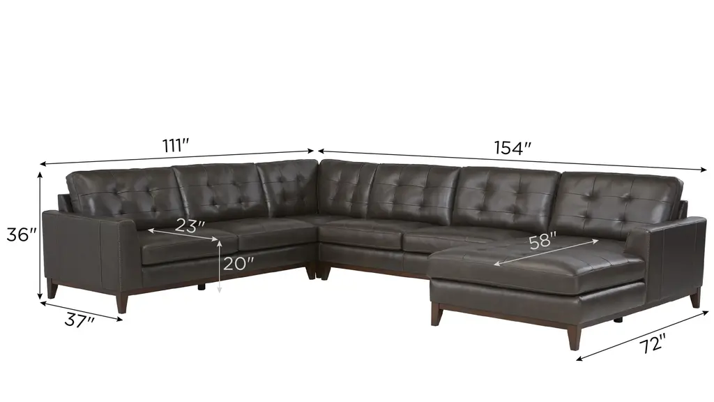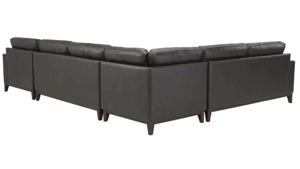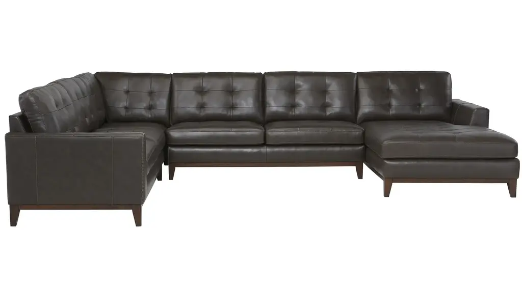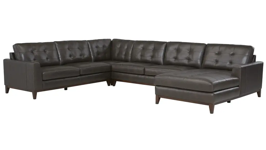With an upscale rustic style, the Wheaton sectional is a beautiful centerpiece for a contemporary or transitional living space. Deep, tufted cushions and clean, angular lines bring a refined mid-century vibe, while the spacious seating area invites you to stretch out and unwind. Exposed and tapered wood legs and distinctive character add rich, warm character you'll love. Includes (left to right) left arm facing loveseat, corner, armless loveseat, right arm facing chaise.
