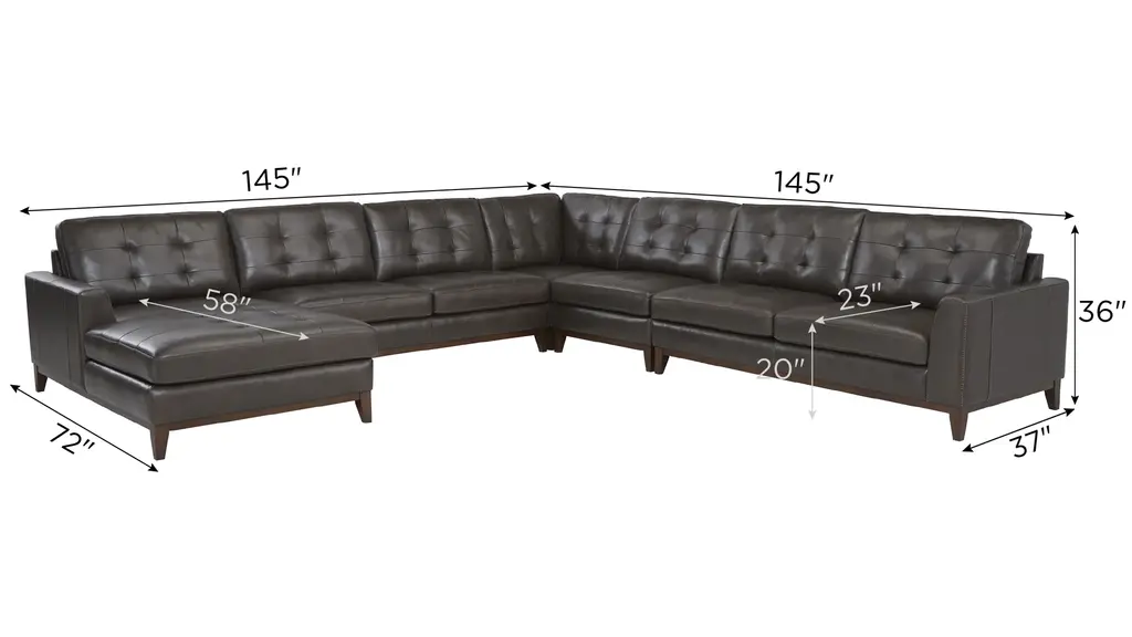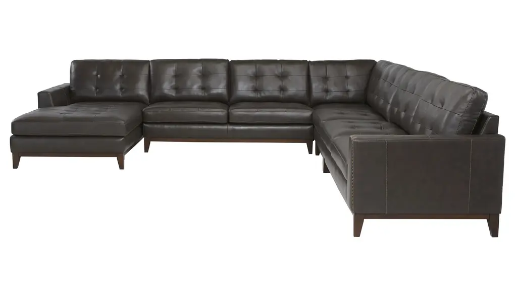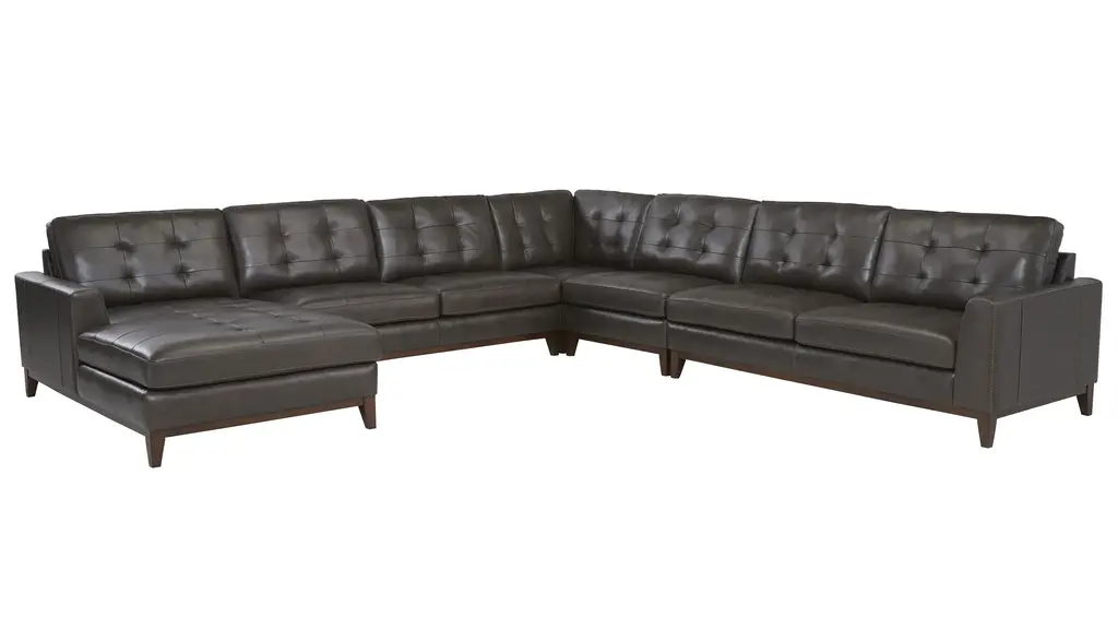With an upscale rustic style, the Wheaton sectional is a beautiful centerpiece for a contemporary or transitional living space. Deep, tufted cushions and clean, angular lines bring a refined mid-century vibe, while the spacious seating area invites you to stretch out and unwind. Exposed and tapered wood legs and distinctive character add rich, warm character you'll love. Includes (from left to right) left arm facing loveseat, armless chair, corner, armless chair, right arm facing loveseat.