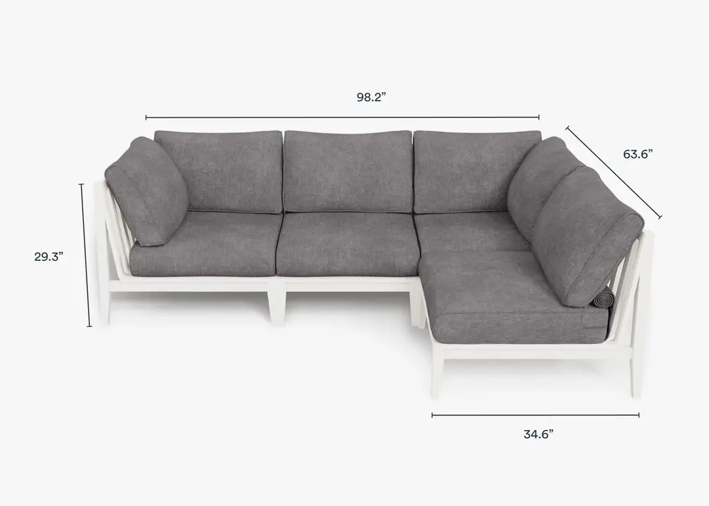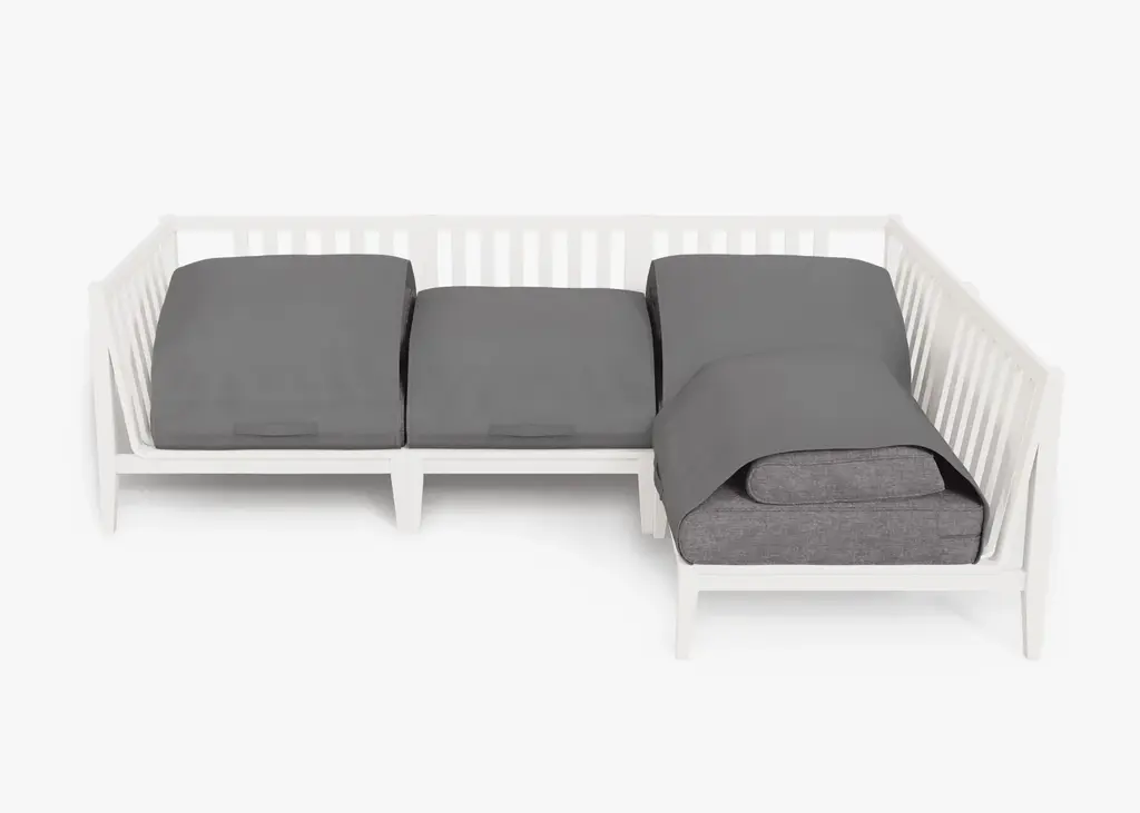 Enjoy indoor comfort outside. Sleek, lightweight, and durably designed with weatherproof aluminum, Outer’s modular furniture invites you to relax on luxuriously comfortable memory foam cushions. The built-in, easy to use OuterShell® cover protects the cushions when not in use, and features Velcro to secure it in place and a handle for convenient transport and storage. Includes 2 armless chairs, 1 corner chair, and 1 sectional chair.