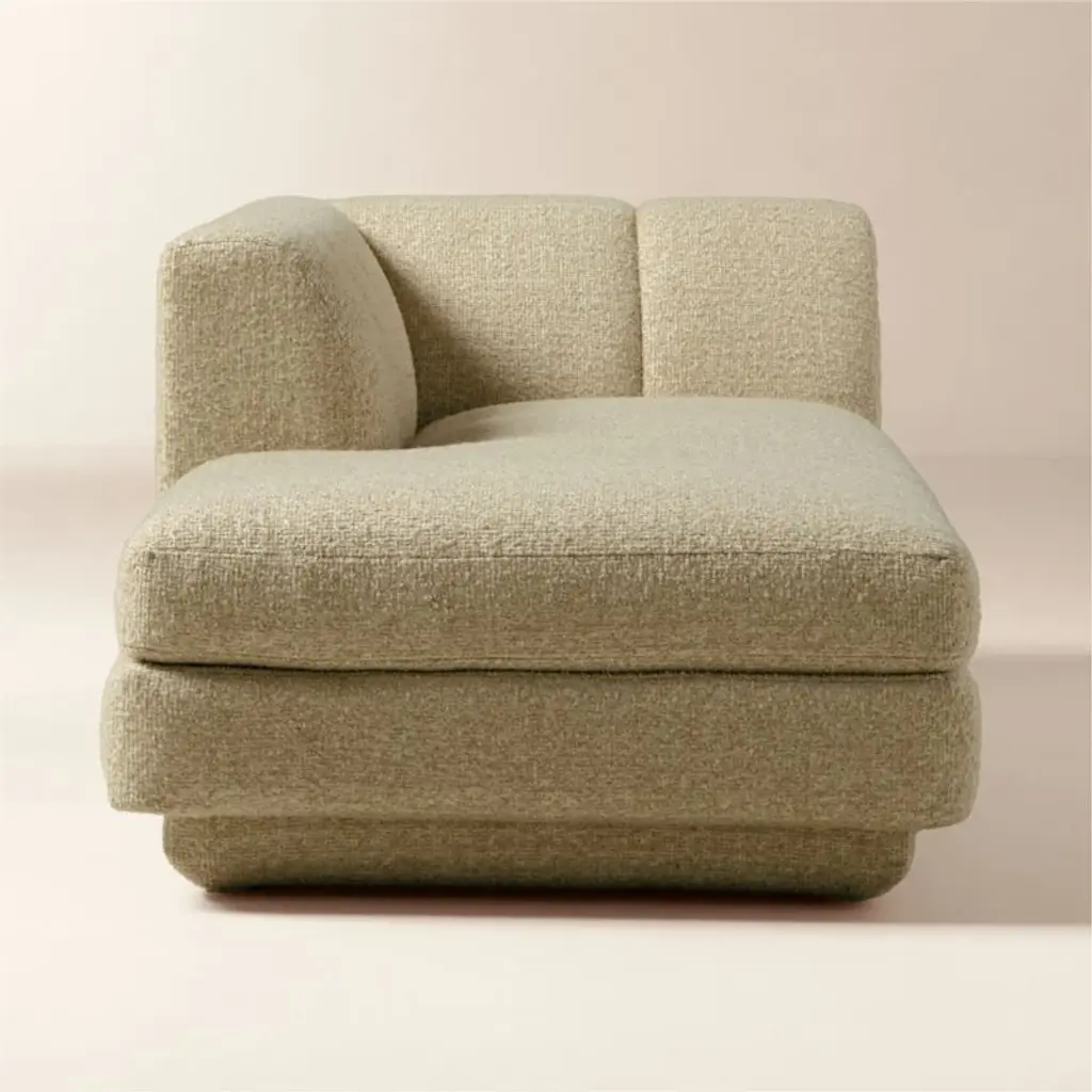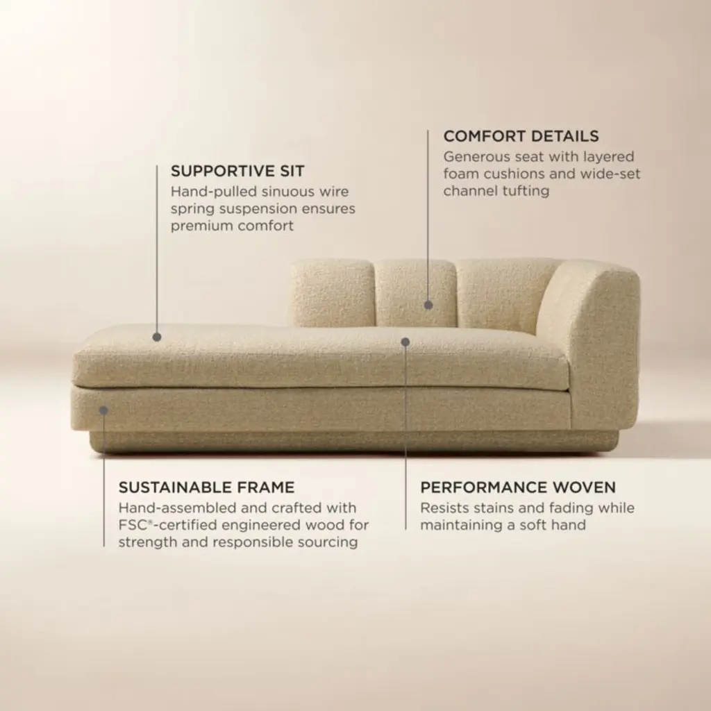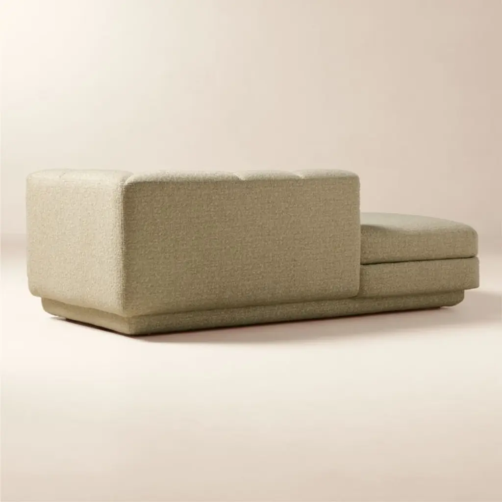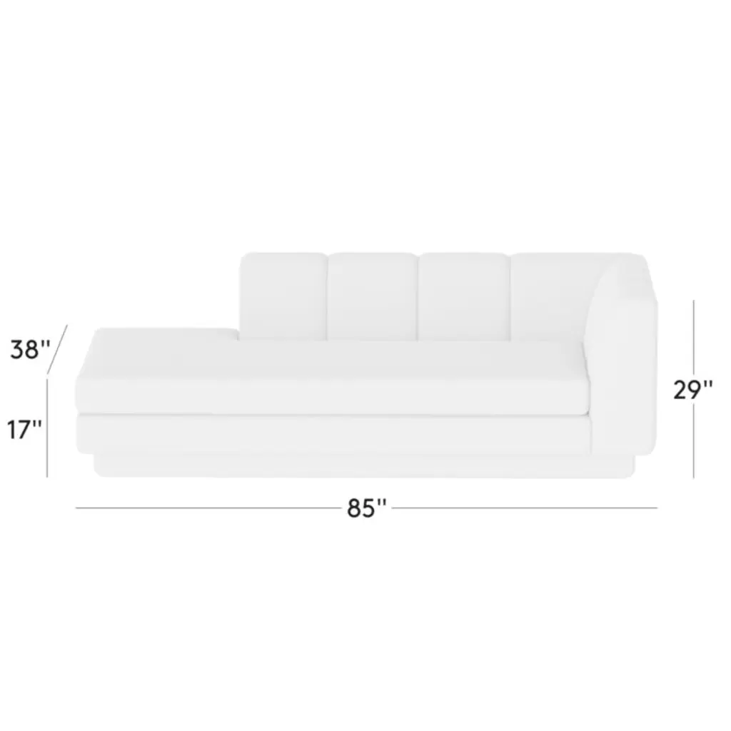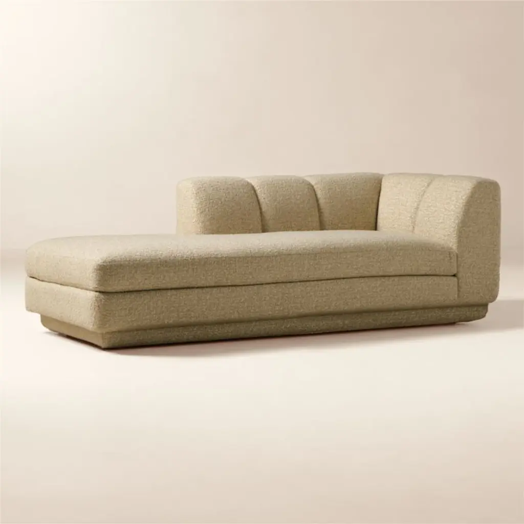 Taking stylistic nods from 1970s Italian design and the designers' own laid-back Southern California aesthetic, left-arm chaise by Lawson-Fenning has generous proportions for gathering and relaxing. A deep seat is complemented by a relaxed back with wide-set channel tufting that highlights the rich texture of the easy-care textured woven performance upholstery. Each piece is assembled by hand to ensure a level of quality befitting the design. Coordinates with other pieces from the Yarrow collection to create a sectional sofa. CB2 exclusive.