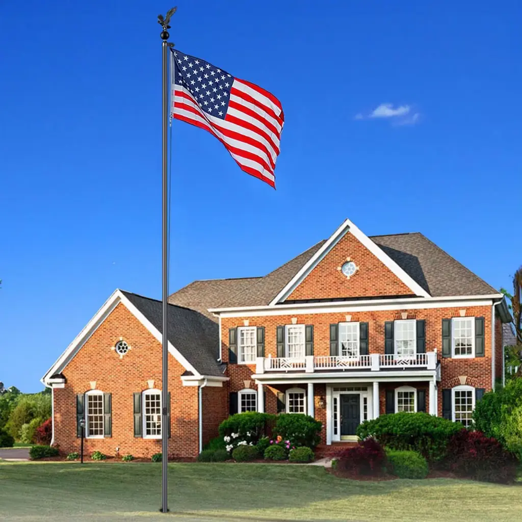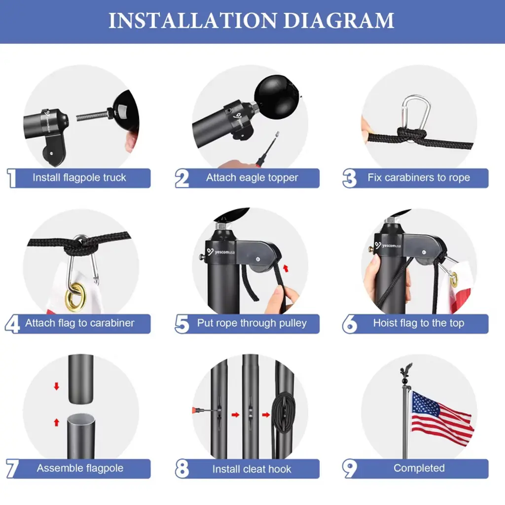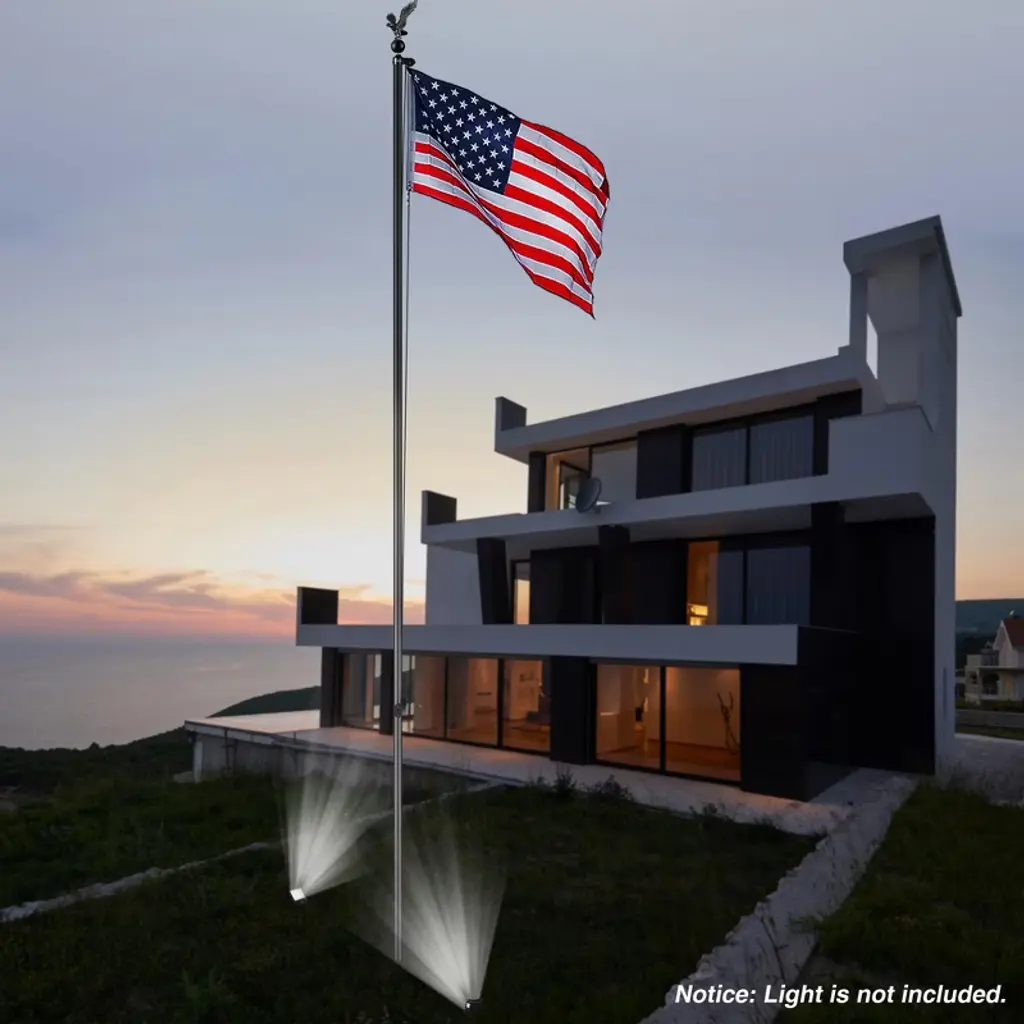 Features:- Solid Aluminum Construction - 20 ft Sectional Flag Pole Kit includes a flagpole, a black eagle topper, a 5x3 ft US flag, a rope, and 4 carabineers; flag pole constructed of heavy-duty Lightweight aluminum with anodized finish for increased resistance to corrosion and wear, strong enough to withstand outdoor weather conditions- Unique Flying Eagle - The black flying eagle design with a ball makes it look catching, combining with the sleek appearance of the flagpole to ensure a decent display of your flag with honor and pride- Fly 2 Flags - Equipped with 4 carabineers for hanging 2 pcs 3x5 ft flags at the same time or a single pack of 4x6 ft flag, and you can fly the national flag at half-mast to mark a special day or show your respect for someone- Adjustable Height - Easy to install by connecting 6 sections of poles tightly, and you can easily customize the flagpole height by assembling different numbers of sectional poles- Proudly Show Your Pride - Ideal for showing patriotic spirits at both residential and commercial places such as front porches, backyards, gardens, museums, and organizations, also suitable for holding a cell booster antenna at the top & for tailgating/camping decorationSpecifications:- Overall Dimension(LxWxH) 8 1/4" x 5 7/8" x 21 5/12 ft (21 x 15 x 654 cm)- American Flag Dimension(LxW) 4 11/12 ft x 2 11/12 ft (151 x 90 cm)- Sectional Pole Dimension(Dia.xL) 2" x 44 1/8" (5.1 x 112 cm)- Top Pole Dimension(Dia.xL) 1 13/16" x 44 1/8" (4.6 x 112 cm)- PVC Sleeve Length 19 11/16" (50 cm)- Material Aluminum- Net Weight 6.6 Lbs (3 kg)Package Contents:- 1x Flagpole- 1x Flag- 1x Eagle Topper- 1x PVC Sleeve- 1x Flagpole Trunk- 1x Screwdriver- 1x Cleat- 4x Carbineers- 1x Rope- 3x Screws- 1x Manual