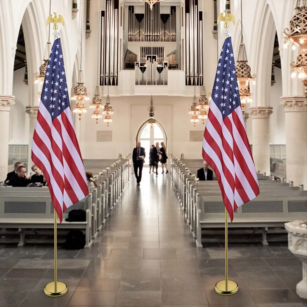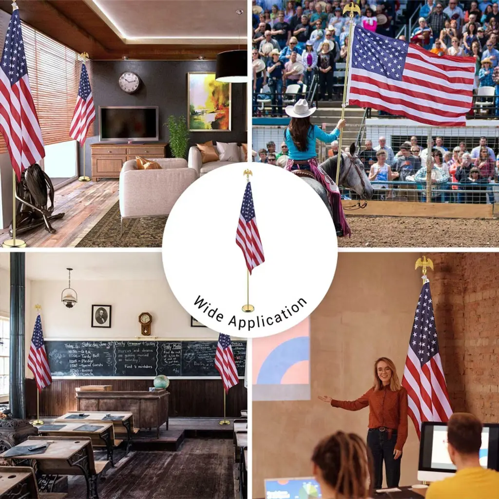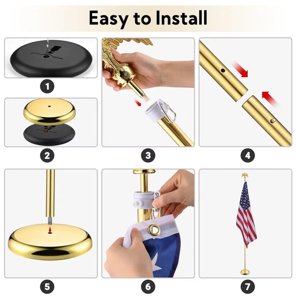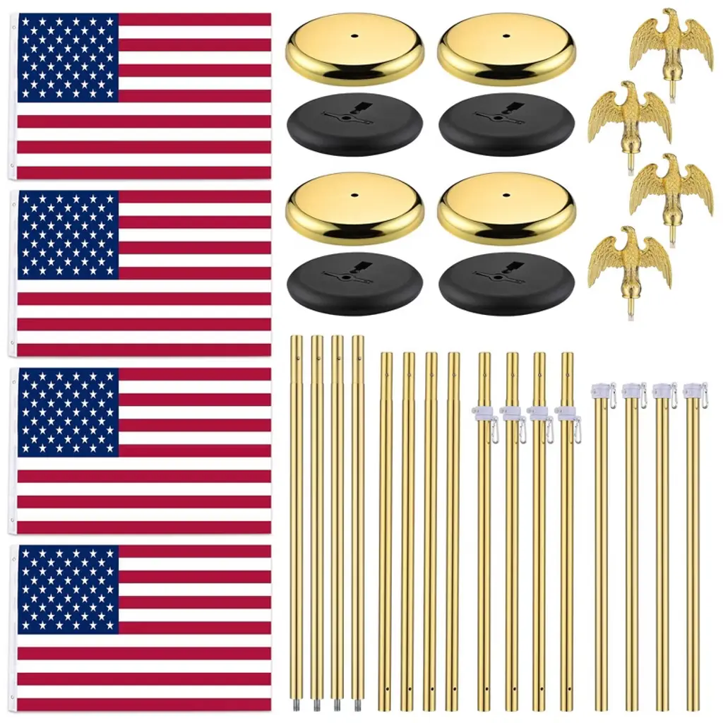 Features:- Complete Flagpole Kit - Includes 4 pcs 8 ft indoor sectional flagpoles, 4 pcs gold eagle finials, 4 pcs American national flags, 4 pcs base stands and accessories, one package for everything you need to display national flag indoors, perfect decoration for government agencies, institutions, corridor, hallway, office, embassy, school, city hall, church, military ceremony for veterans- Durable Construction - High-quality aluminum flagpole features premium rust and erosion resistance for long-term use, and strong base stand can be filled with water for added stability to keep the flagpole in place- Easy Assembly - Easy to set up without using any tool, just connect sectional poles, attach flag to the flagpole using carabiners, add water into the base, and finally rotate the flagpole into the base firmly; Detachable design for space-saving storage when not in use- Tangle Free Design - Flagpole features 360-degree rotatable rings to prevent the flag from being tangled or furled for keeping the flag neat and tidy; Upper ring is pre-mounted on the flagpole for saving installation time, while the bottom ring can be easily adjusted to any position & fastened by a knob- Fly Your American Proud - Show your independence, democracy and strong patriotic spirit and be proud of the Great American; Lightweight and portable, also can be hand-held for parade in President's Day, Memorial Day, Independence Day, etc. to publicize your pride to the countrySpecifications:- Overall Dimension(Dia.xH): 9 13/16" x 8 5/6 ft (25 x 270 cm)- Base Dimension(Dia.xH): 9 13/16" x 1 5/16" (25 x 3.3 cm)- Flag Size(LxW): 5 ft x 2 11/12 ft (152 x 90 cm)- Top Pole Size(Dia.xL): 1" x 26 3/8" (2.5 x 67 cm)- Middle Pole Size(Dia.xL): 1" x 27 3/8" (2.5 x 69.5 cm)- Bottom Pole Size(Dia.xL): 1" x 28 3/8" (2.5 x 72 cm)- Net Weight: 12.3 Lbs (5.6 kg)Package Contents:- 4x American National Flags- 4x Bases- 4x Base Covers- 4x Eagle Toppers- 4 Sets of Sectional Poles (4 pcs for each set)- 2x Manuals- Package Content:- 4x American National Flags- 4x Bases