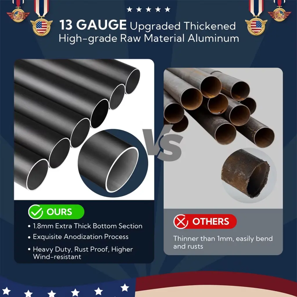 Features:- 13 Gauge Solid Construction: 20ft Aluminum Sectional Flagpole Kit with golden ball finial features upgraded 13 Gauge aluminum tubes for higher wind resistance, durability and rust resistance, ensuring longtime use in front yard, beside house, garden, patio as well as commercial use like company, government buildings and railway station, etc.- Easy Installation: Easy to install by attaching 6 sections tightly, then attach the flag to the rope with the carabiners and pulling the rope to raise and lower the flag- Fly 2 Flags: Can fly 2 flags at the same time and lower to half-staff when needed, allowing you to fly national flag and state flag at once, or fly team or other kinds of flag as your like- Ideal for home use as well as commercial use like company, government buildings, railway station, museum, square, shopping mall- What You Get: 1-Year Warranty for quality assurance; Unpack to use, includes flag poles, ball finial, American National Flag, carabiners, screws, screwdriver, rope and PVC sleeve for protecting the bottom of the pole against corrosionSpecifications:- Overall Dimension with Ball (LxWxH) 4 5/16" x 2 3/4" x 20 1/4 ft (11 x 7 x 617.5 cm)- Ball Dia. 2 3/4" (7 cm)- Flag Dimension(LxW) 5ft x 3ft- PVC Pipe Outer Diameter 2 3/16" (5.5 cm)- PVC Pipe Inner Diameter 2" (5.1 cm)- PVC Pipe Length 19 5/8"(49.8 cm)- Material Aluminum Alloy, Plastic, Polyester- Import Designation Imported- Net Weight 10.1 Lbs (4.6 kg)Package Contents:- 6x Pole Sections- 1x American National Flag- 1x Gold Ball- 1x Set of Screws- 1x Screw Driver- 1x Rope- 4x Carabiners- 1x PVC Sleeve- 1x Rotating Collar- 1x Rope Winder- 1x ManualNotice: - Please detach the flagpole for protection in extreme weather condition.