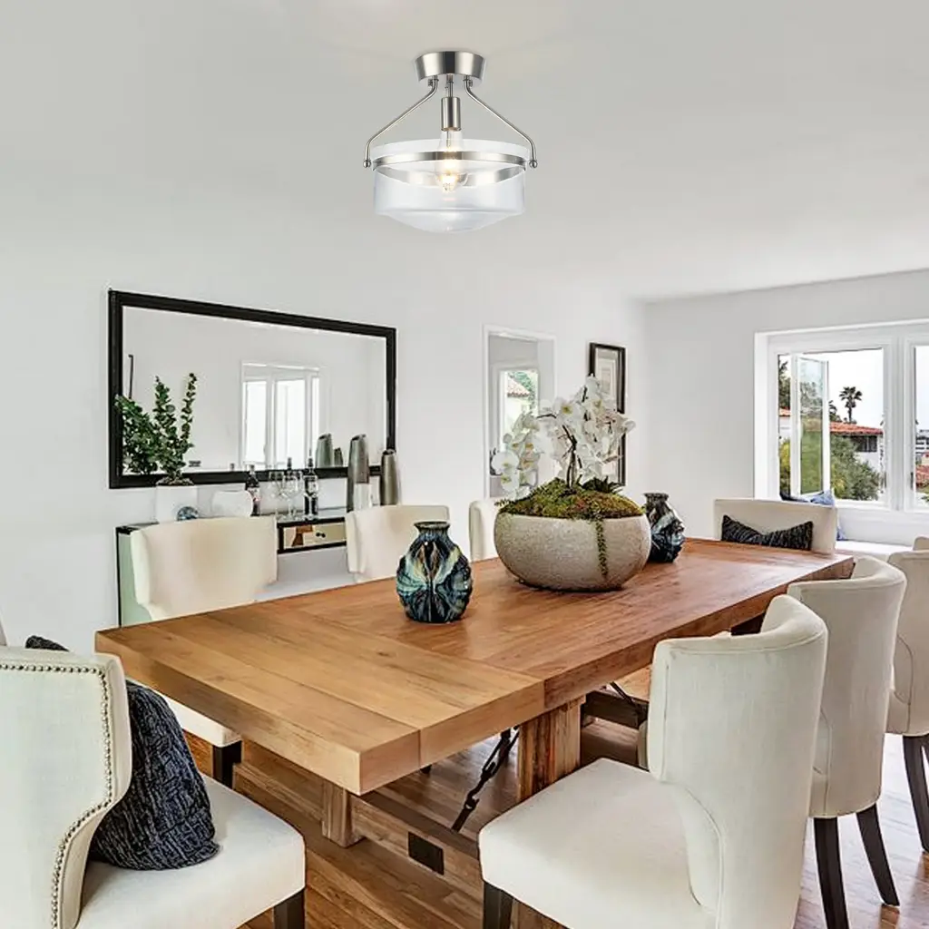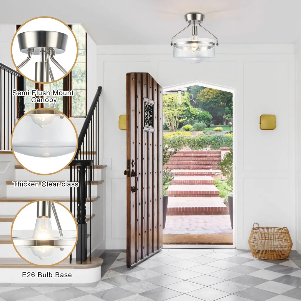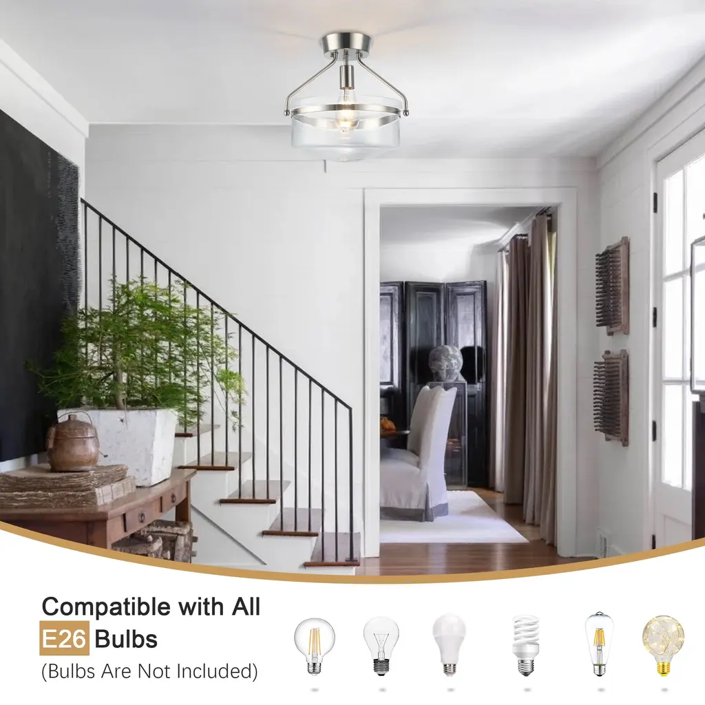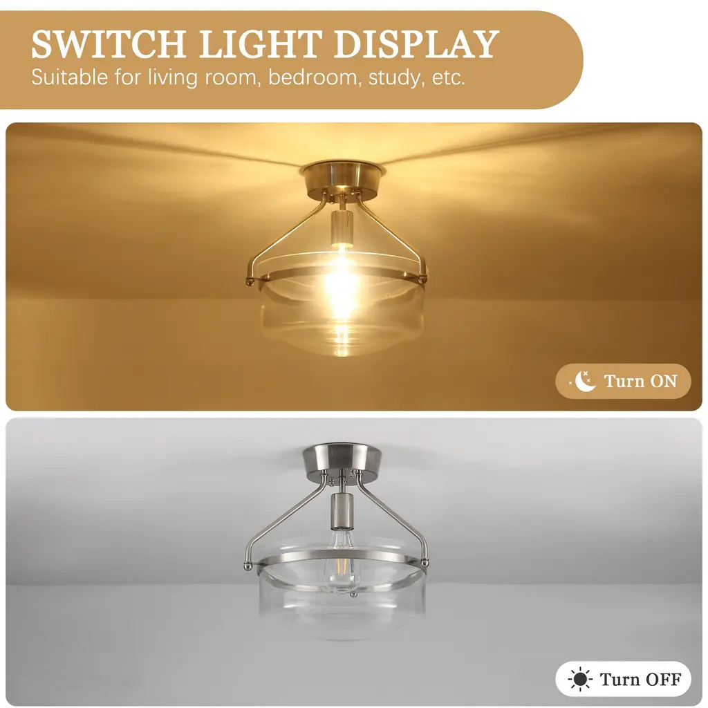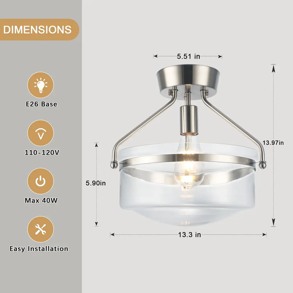 This Modern Semi-Flush Mount Ceiling Light with Clear Drum Glass offers a sleek and minimalist design that complements contemporary interiors. The light features a clear glass drum shade paired with a durable metal frame, creating a crisp, open look that allows the bulb to be a central design element. With one E26 bulb base (max 40W, not included), this fixture provides focused, ambient lighting and is dimmer-compatible, allowing you to adjust the light level to fit any occasion or mood.Features: