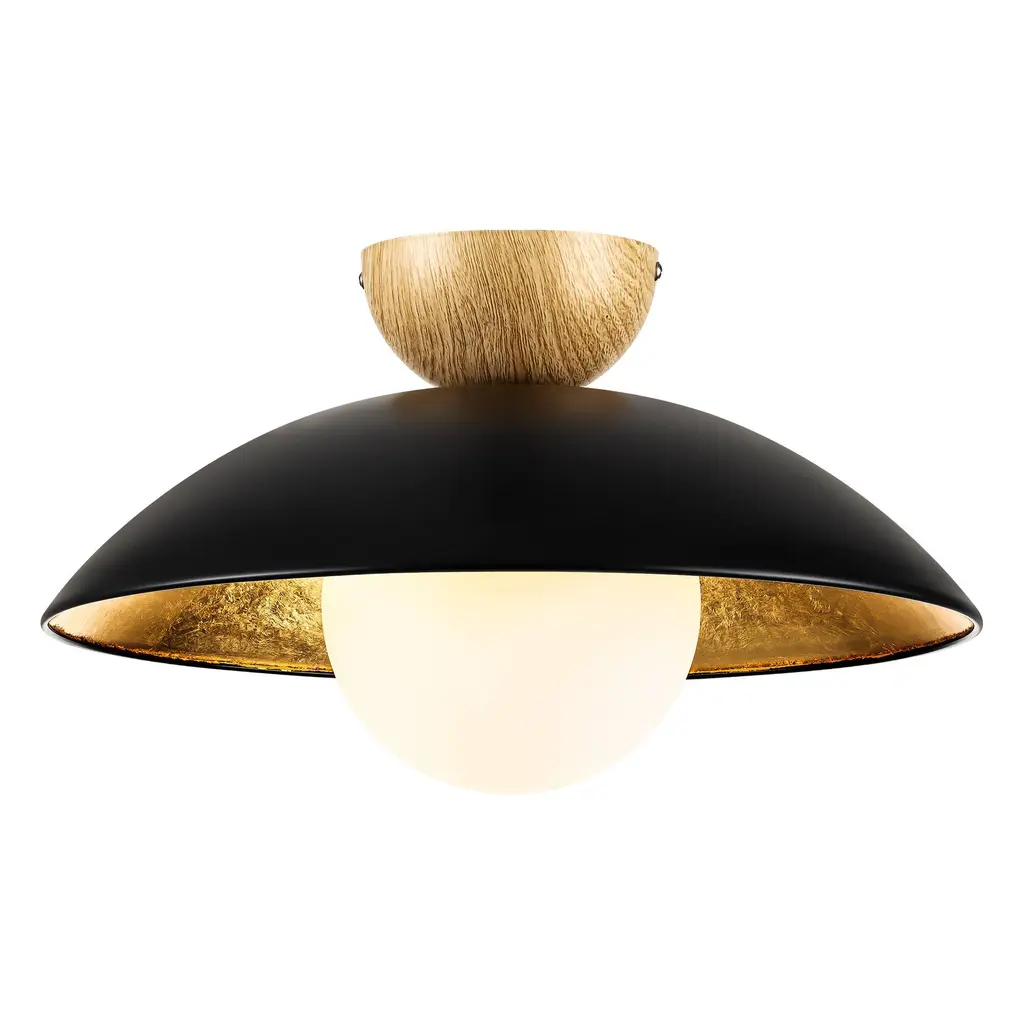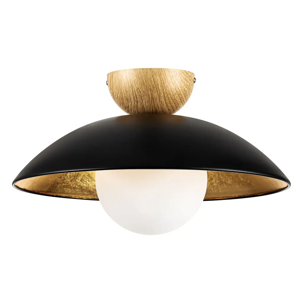 1-Light Wood Dome Gold Leaf Bowl Shape Opal Bubble Globe Glass Semi-Flush Mount Light - Black