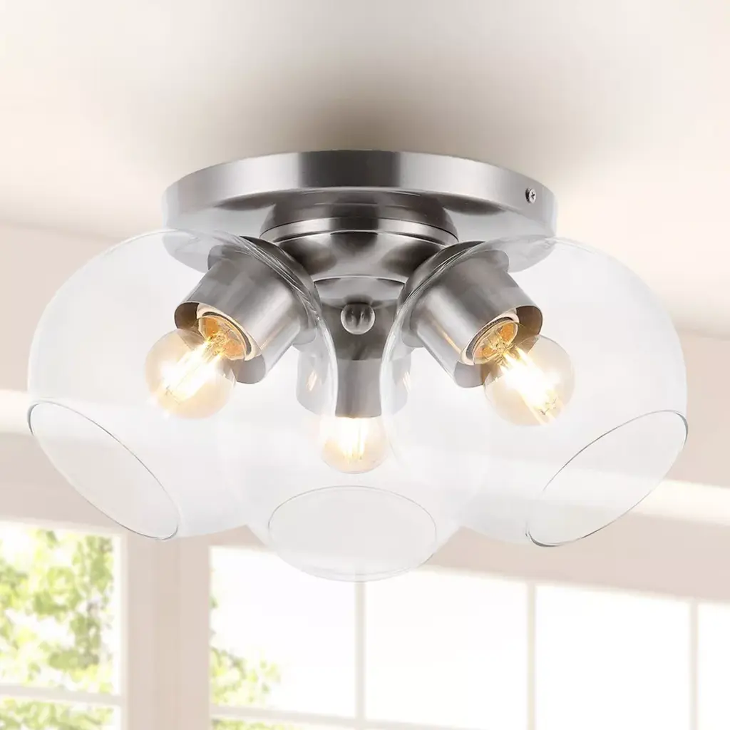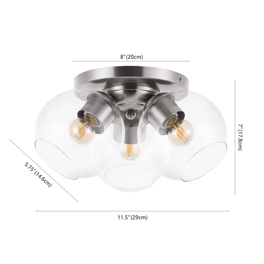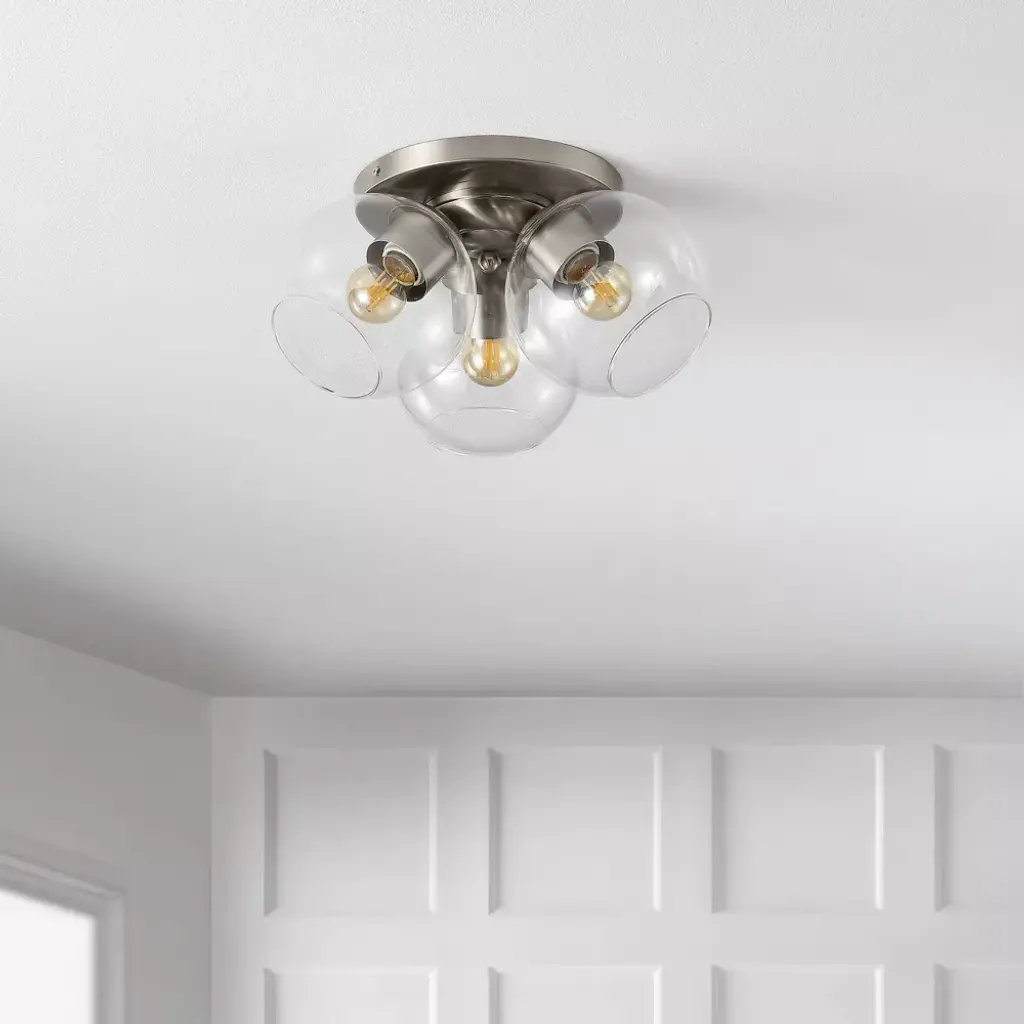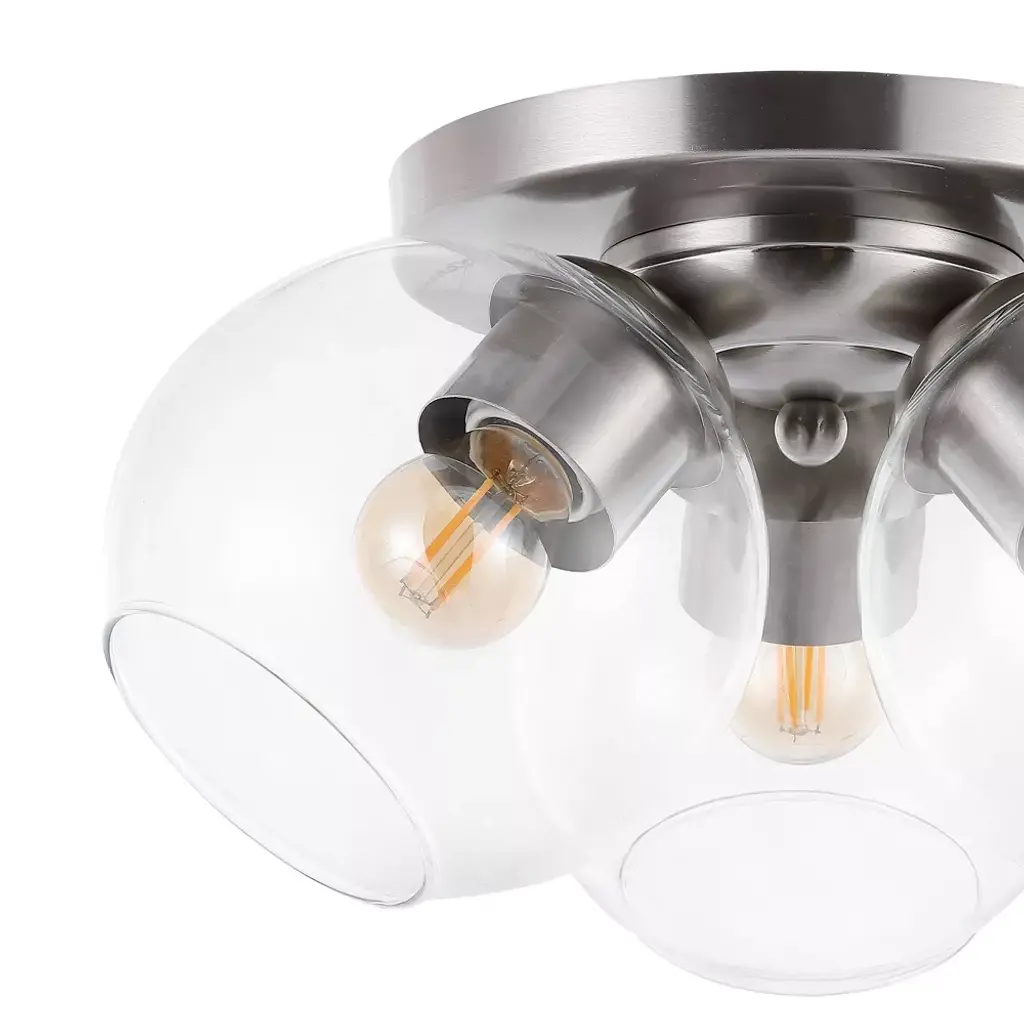 Our minimalist ceiling light has clear globes and a sleek nickel finish for a fresh, modern farmhouse perspective. Hanging at only 7" down, this modern light fixture is perfect for low ceilings. Three Edison bulbs create soft, warm lighting, while the clear glass globes add a mid-century touch. Eco-friendly 4W LED bulb included. Takes 3 bulbs and compatible with TYPE "A" 40W or CFL 13W or LED 9W. Color Temperature: 2700K. CRI: 80. Before cleaning any lamp shade or fixture, disconnect the power source. Wipe with a soft, dry cloth. Avoid the use of chemicals and household cleaners as they may damage the finish.