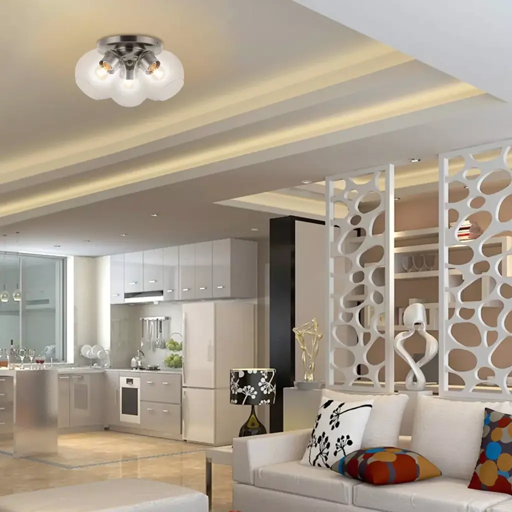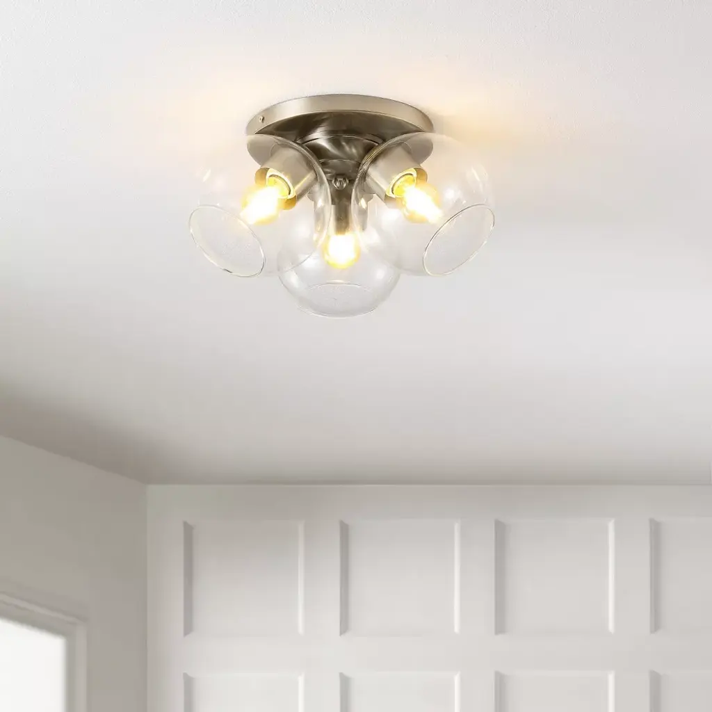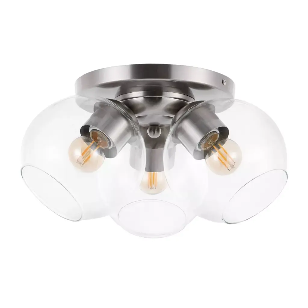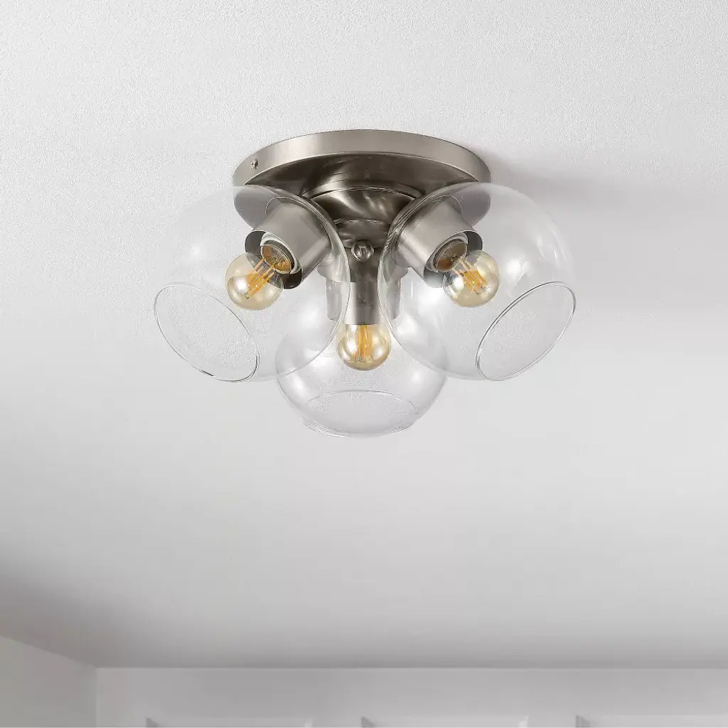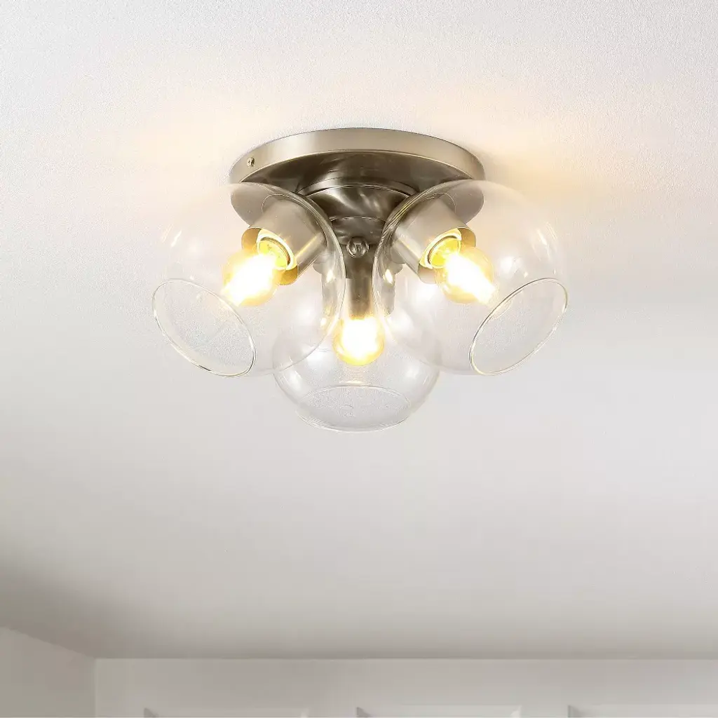 Our minimalist ceiling light has clear globes and a sleek nickel finish for a fresh, modern farmhouse perspective. Hanging at only 7" down, this modern light fixture is perfect for low ceilings. Three Edison bulbs create soft, warm lighting, while the clear glass globes add a mid-century touch. Eco-friendly 4W LED bulb included. Takes 3 bulbs and compatible with TYPE "A" 40W or CFL 13W or LED 9W. Color Temperature: 2700K. CRI: 80. Before cleaning any lamp shade or fixture, disconnect the power source. Wipe with a soft, dry cloth. Avoid the use of chemicals and household cleaners as they may damage the finish.