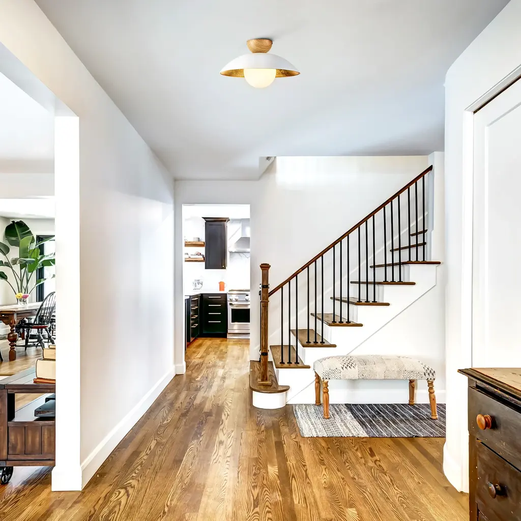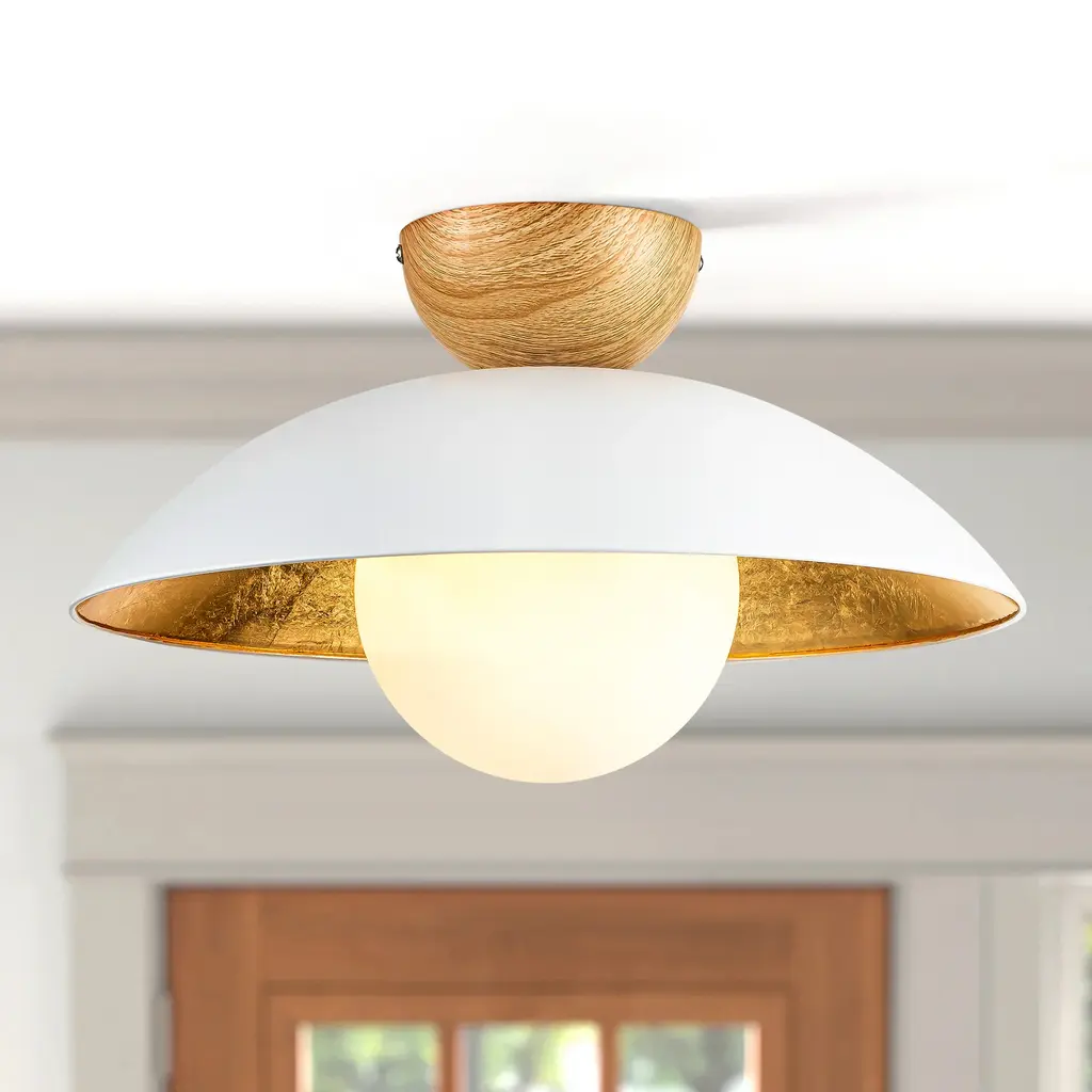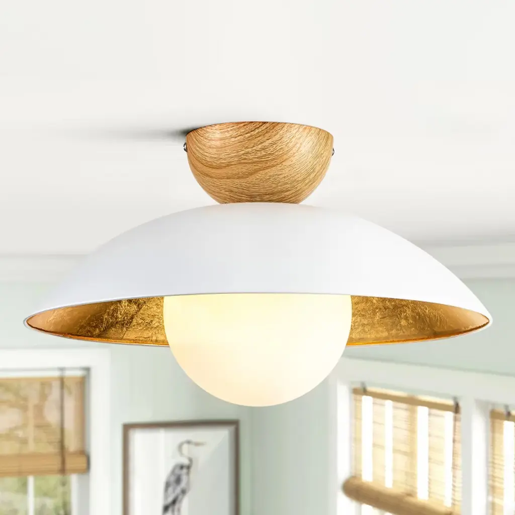 This farmhouse industrial vintage bowl dome Semi-flush light features a metal dome shade, an opal glass globe bubble, and a wood finish top that looks classic yet modern. Gold leaf gives this piece extra luster and texture. These textures of the gold leaf finish give rich contrast to the matte black and white finishes on the exterior, while also making so beautifully reflective the light. This pendant light features an opal frosted glass globe bubble and requires a single 60W E26 standard-medium base bulb (not included), bringing a modern twist to its Avant-garde retro design.Features:Product Detail