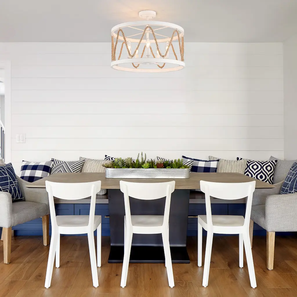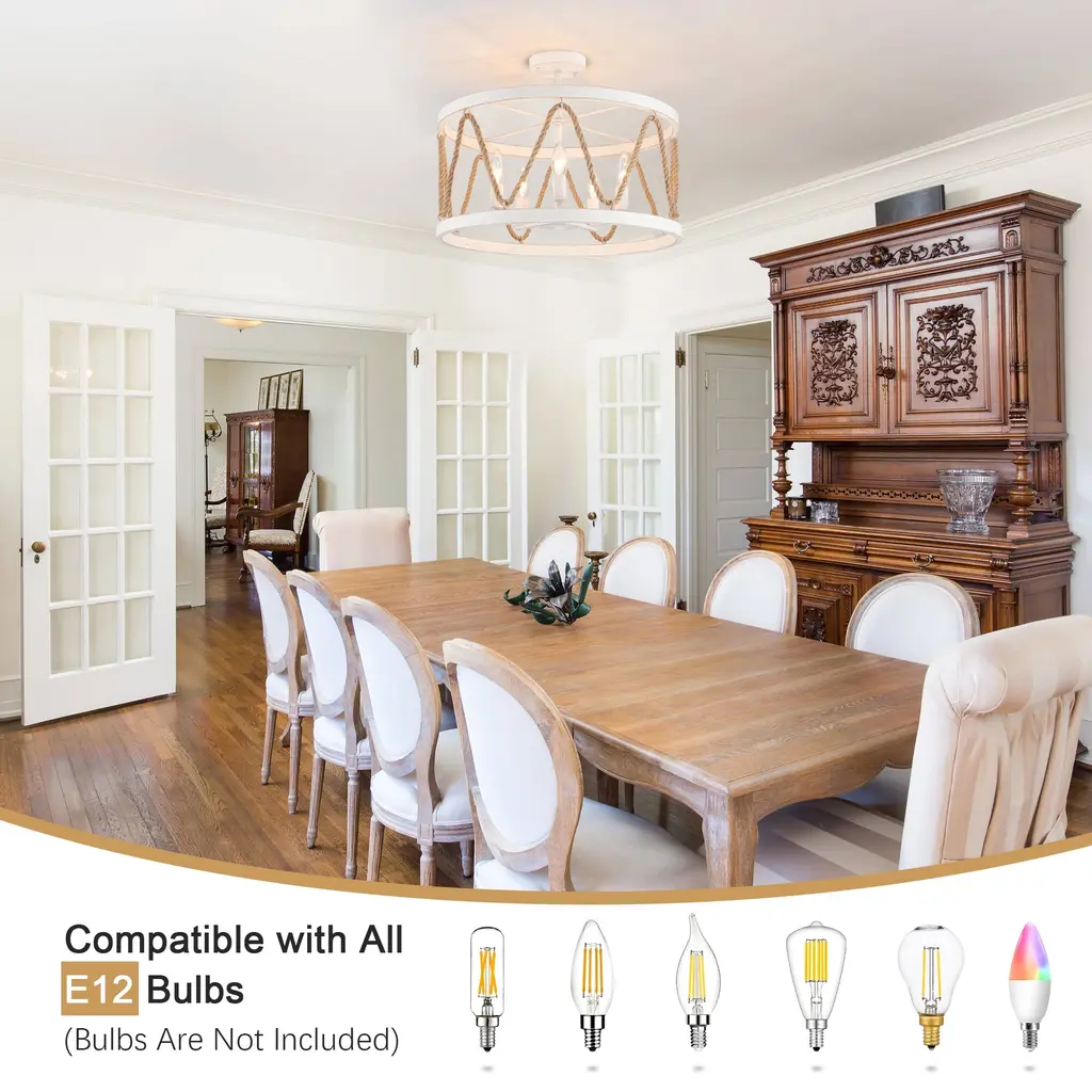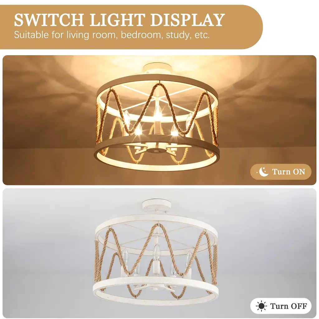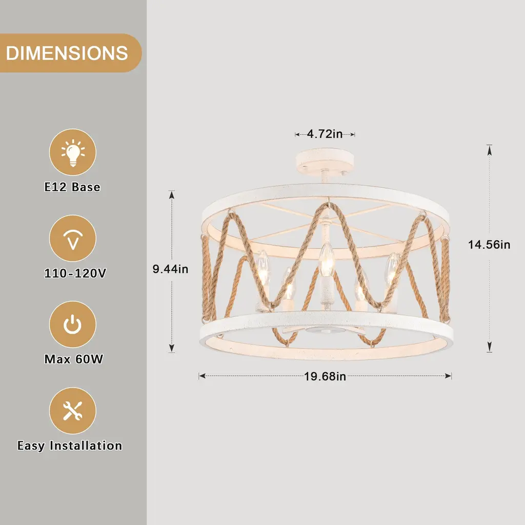 Enhance your home's ambiance with the 5-Light Metal Hemp Rope Hanging Semi-Flush Mount Light. This fixture combines industrial design with rustic elements to add sophistication and warmth to any room. Its semi-flush mount design sits snugly against the ceiling, providing a stylish visual touch. Made from durable iron and featuring decorative hemp rope accents, it blends modern and traditional aesthetics seamlessly. Each bulb can handle up to 60W (bulbs not included), offering versatile lighting options. Ideal for creating a cozy atmosphere in living rooms, dining rooms, or entryways.Features:Light features a classic drum shape that adds a refined and stylish touch to your home decor, making it a versatile fit for various interior stylesDecorative hemp rope detailing adds a rustic, natural element to the design, blending industrial chic with country charm for a unique aesthetic.Constructed from high-quality iron, this fixture ensures lasting durability and stability, offering both beauty and functionality.The semi-flush mount design offers a sophisticated look while ensuring the fixture stays close to the ceiling, ideal for rooms with lower ceilings.Designed for E12 bulbs (not included), giving you the flexibility to choose the perfect bulb type for your desired lighting effect, from warm incandescents to energy-efficient LEDs.With a maximum power rating of 60W per bulb, this fixture provides ample lighting for various spaces while allowing you to select the brightness level that suits your needs.Ideal for a variety of settings, including dining rooms, kitchens, and home offices, this pendant light adds a touch of sophistication and functionality to any space.This semi-flush mount is ETL listed for safety, ensuring that it meets rigorous electrical standards for your peace of mind.