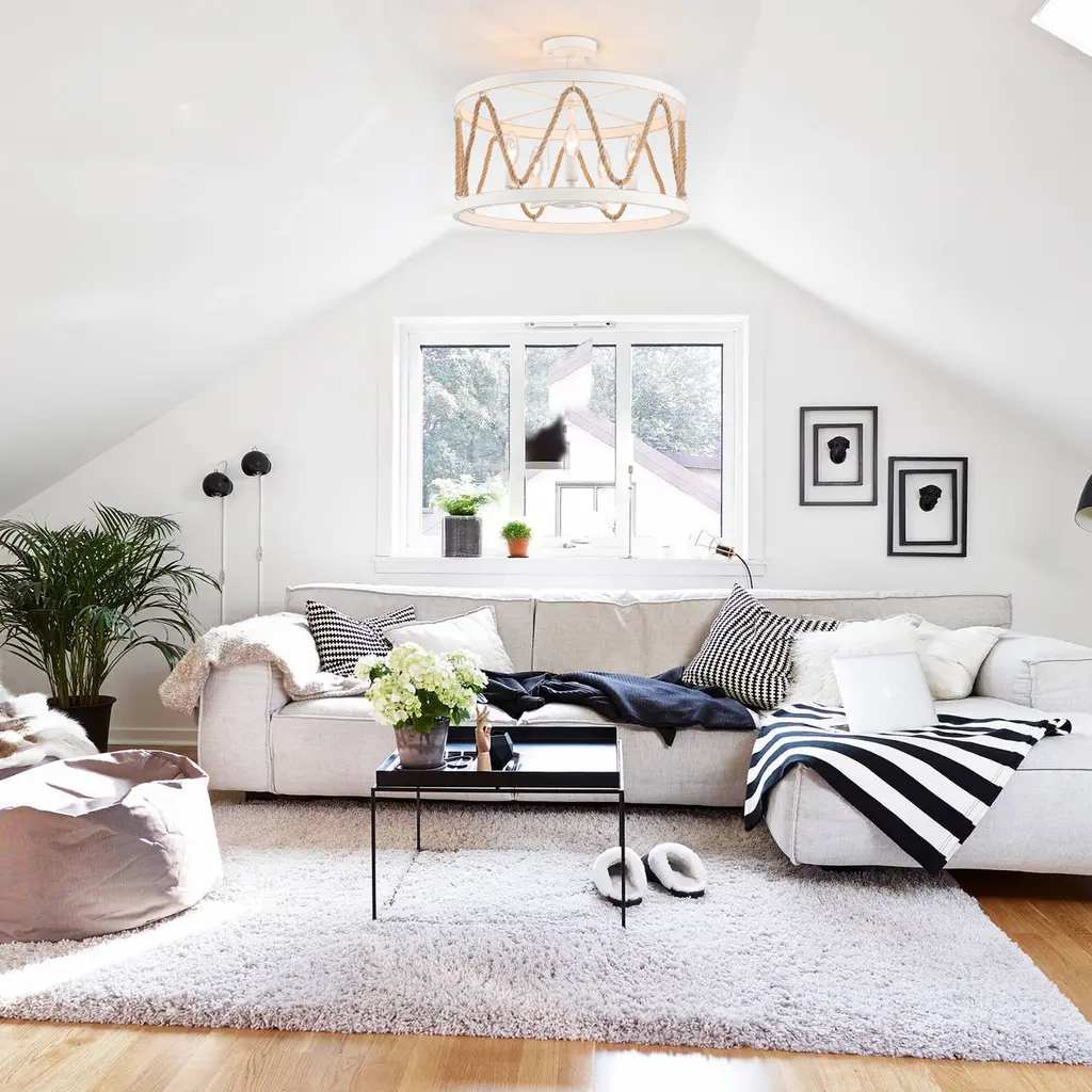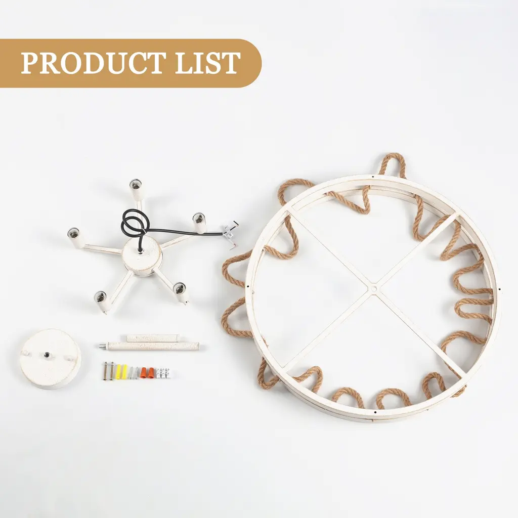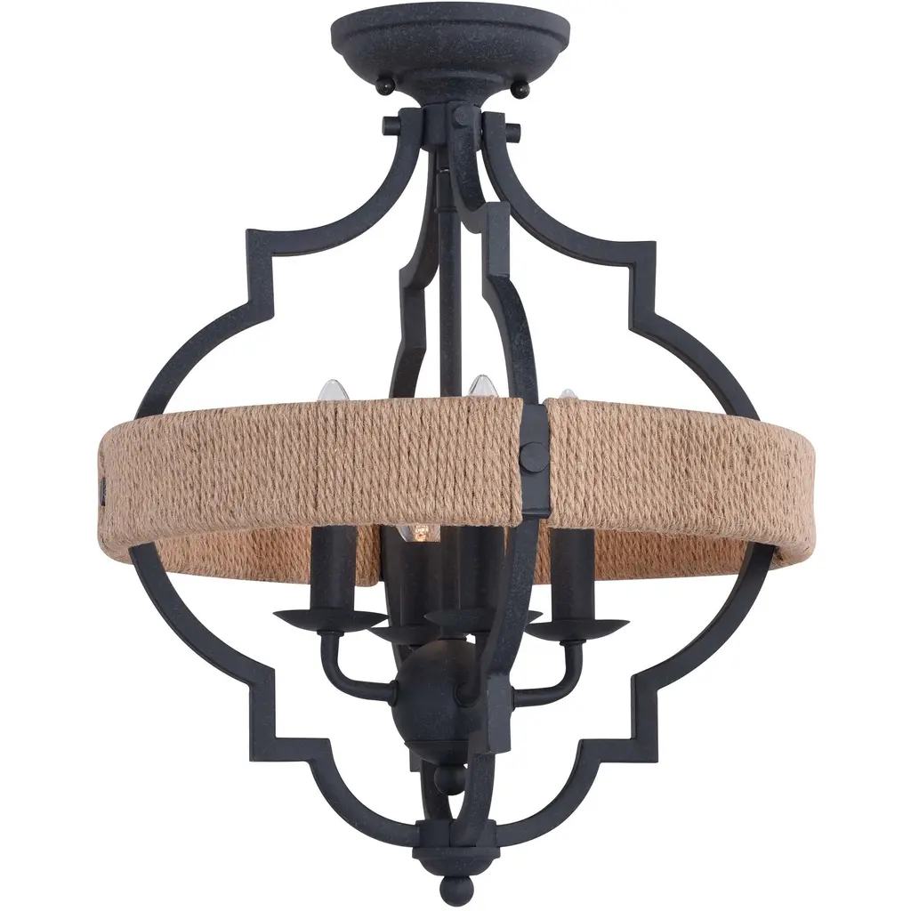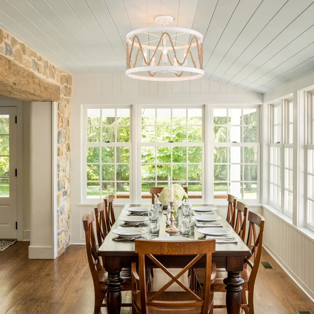 Enhance your home's ambiance with the 5-Light Metal Hemp Rope Hanging Semi-Flush Mount Light. This fixture combines industrial design with rustic elements to add sophistication and warmth to any room. Its semi-flush mount design sits snugly against the ceiling, providing a stylish visual touch. Made from durable iron and featuring decorative hemp rope accents, it blends modern and traditional aesthetics seamlessly. Each bulb can handle up to 60W (bulbs not included), offering versatile lighting options. Ideal for creating a cozy atmosphere in living rooms, dining rooms, or entryways.Features:Light features a classic drum shape that adds a refined and stylish touch to your home decor, making it a versatile fit for various interior stylesDecorative hemp rope detailing adds a rustic, natural element to the design, blending industrial chic with country charm for a unique aesthetic.Constructed from high-quality iron, this fixture ensures lasting durability and stability, offering both beauty and functionality.The semi-flush mount design offers a sophisticated look while ensuring the fixture stays close to the ceiling, ideal for rooms with lower ceilings.Designed for E12 bulbs (not included), giving you the flexibility to choose the perfect bulb type for your desired lighting effect, from warm incandescents to energy-efficient LEDs.With a maximum power rating of 60W per bulb, this fixture provides ample lighting for various spaces while allowing you to select the brightness level that suits your needs.Ideal for a variety of settings, including dining rooms, kitchens, and home offices, this pendant light adds a touch of sophistication and functionality to any space.This semi-flush mount is ETL listed for safety, ensuring that it meets rigorous electrical standards for your peace of mind.