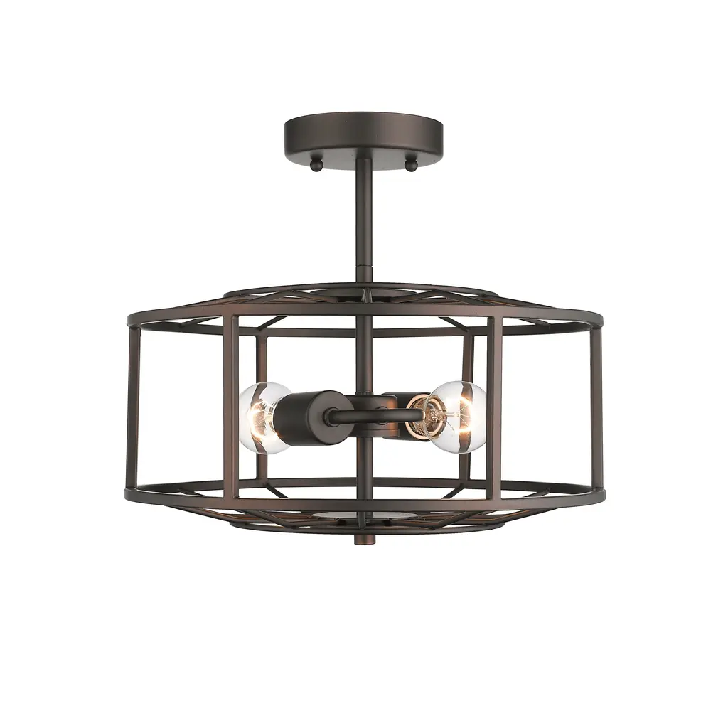 This 2-light semi-flush mount fixture features an oil rubbed bronze finish that will complement many industrial and transitional decors throughout your home. The exposed bulbs inside the steel cage frame add interest while providing ample light to any space. Use vintage "Edison" bulbs to create a timeless look. Beautiful Oil Rubbed Bronze finish. Requires: Two (2) 100 W medium based bulbs (Not Included). Dimensions: 12 inches high x 14 inch diameter.
