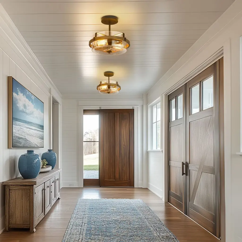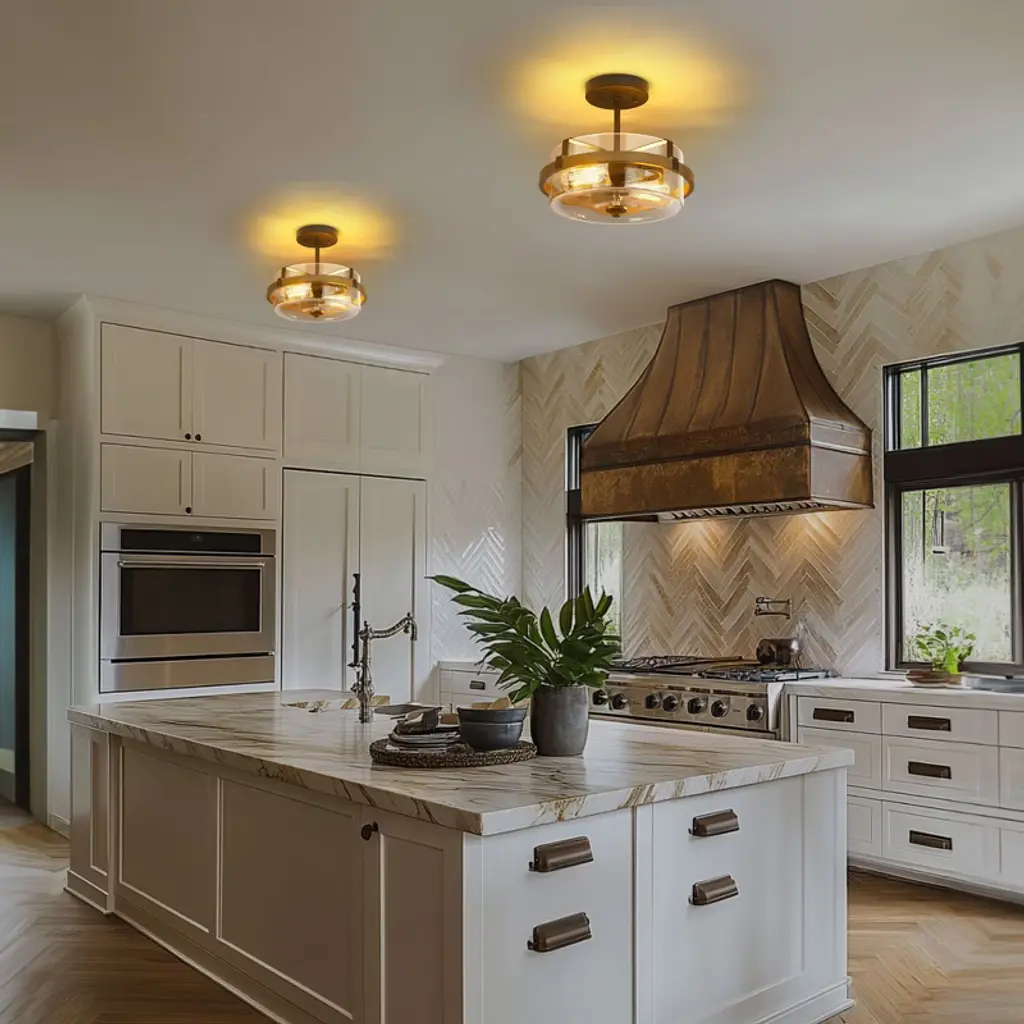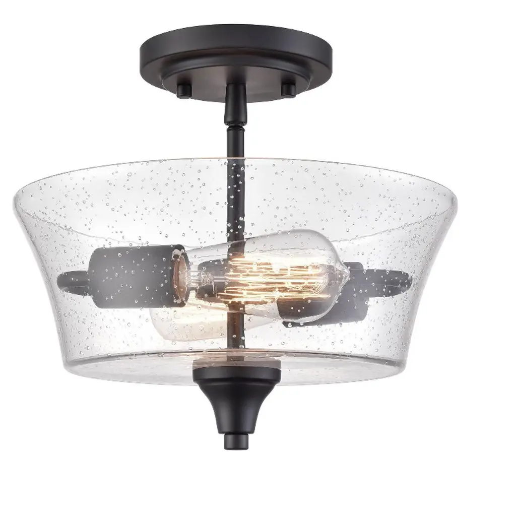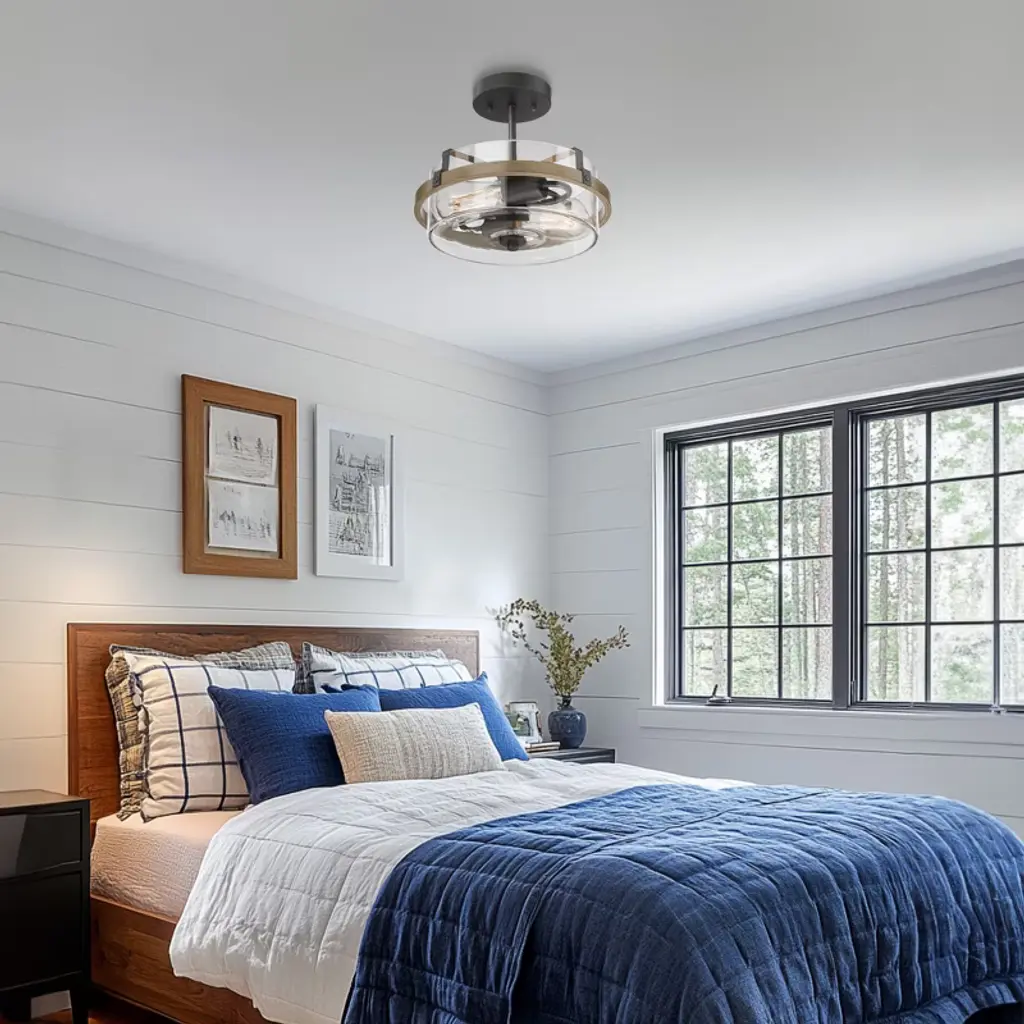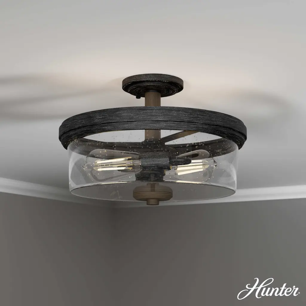 Add a touch of industrial charm to your interior decor with the Semi-Flush Mount Ceiling Light. Its painted wood-tone metal combination and clear glass caged design create a retro look that complements traditional, vintage, and farmhouse styles. This sturdy mental fixture is built to last and is UL dry location listed.