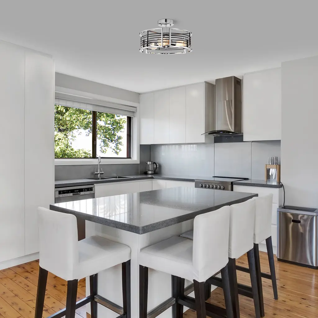 This 3-light semi-flush mount features a chrome finish that will complement many transitional decors throughout your home. The clean lines of the steel frame add interest while enhancing many spaces. Beautiful Chrome finish. Wipe clean with a dry cloth. Requires: Three (3) 100 W medium base bulbs (Not Included). Fixture Dimensions: 8.75 inches high x 15 inch diameter. Since these are hand crafted products, the exact color of glass pieces may vary. Colors of the glass will appear darker and less vibrant when not illuminated. Handmade glass will vary from one piece to the other; glass made at different times will also vary. Light bulbs used in lamps or ambient lighting may affect the appearance of the products.
