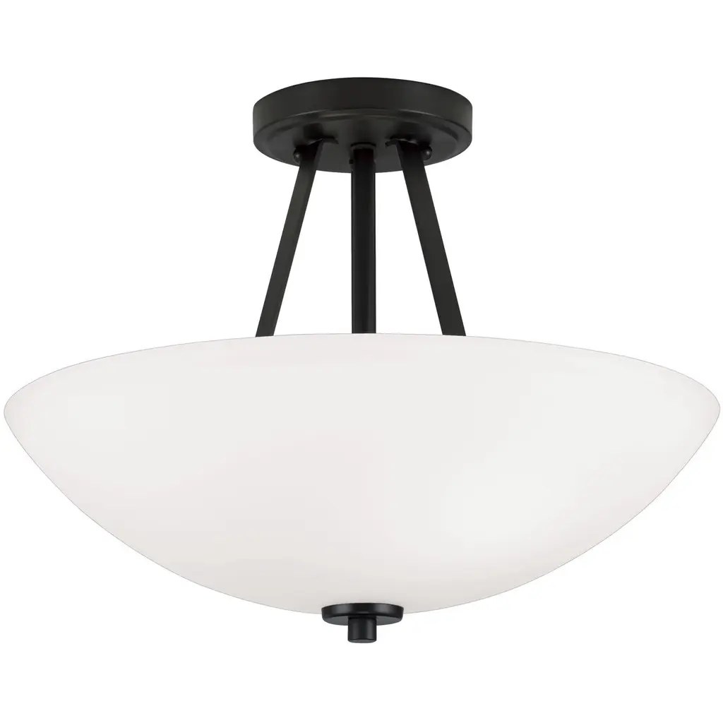 This 3-light semi-flush mount fixture features a beautifully hand painted matte black finish that will complement many modern and contemporary decors throughout your home. The clean lines of the metal frame add interest while the frosted glass softens the light creating a warm ambiance for many spaces. Beautifully hand painted Matte Black finish. Frosted Glass shade. Requires: Three (3) 60 watt Medium base bulbs (Not Included). Fixture Dimensions: 11.75 inches high x 14 inch diameter. Capital Lighting is a family owned business just outside Atlanta, Georgia. We pride ourselves by delivering high quality products at affordable pricing. Beginning with design concepts from popular home fashions, we transform our ideas into lighting fixtures that blend timeless beauty with today's styling. From casting and forging to the hand painted finishes and fine details we strive to make our products the finest in the industry.