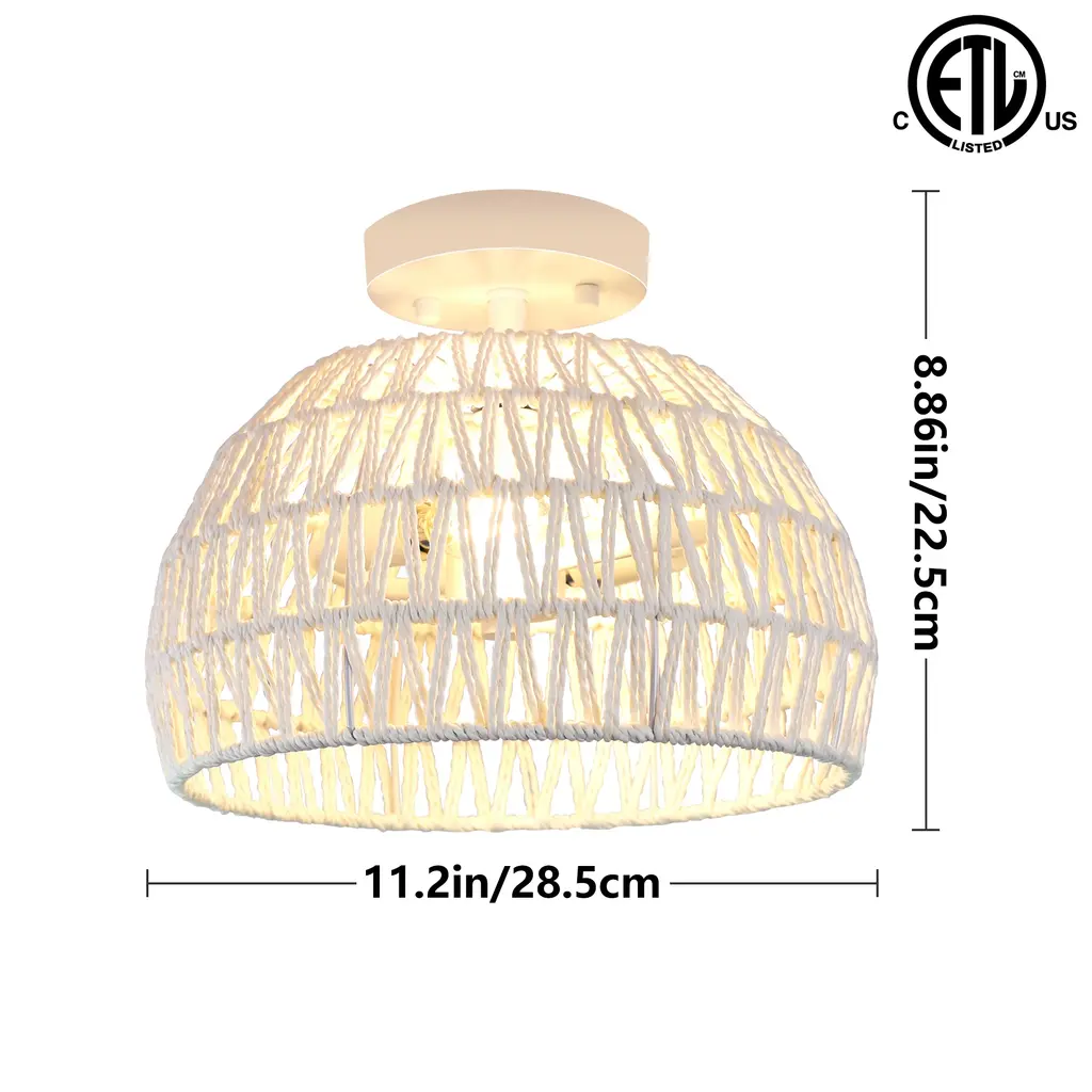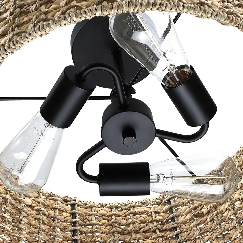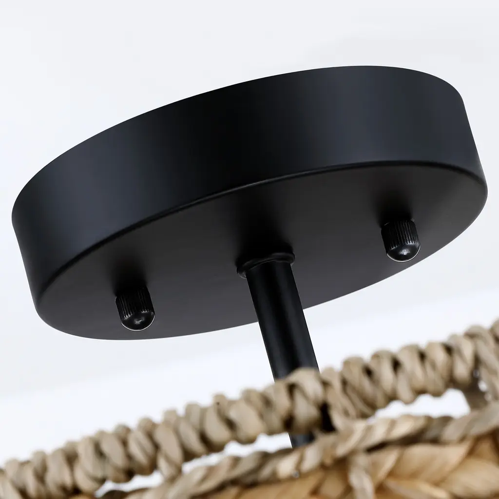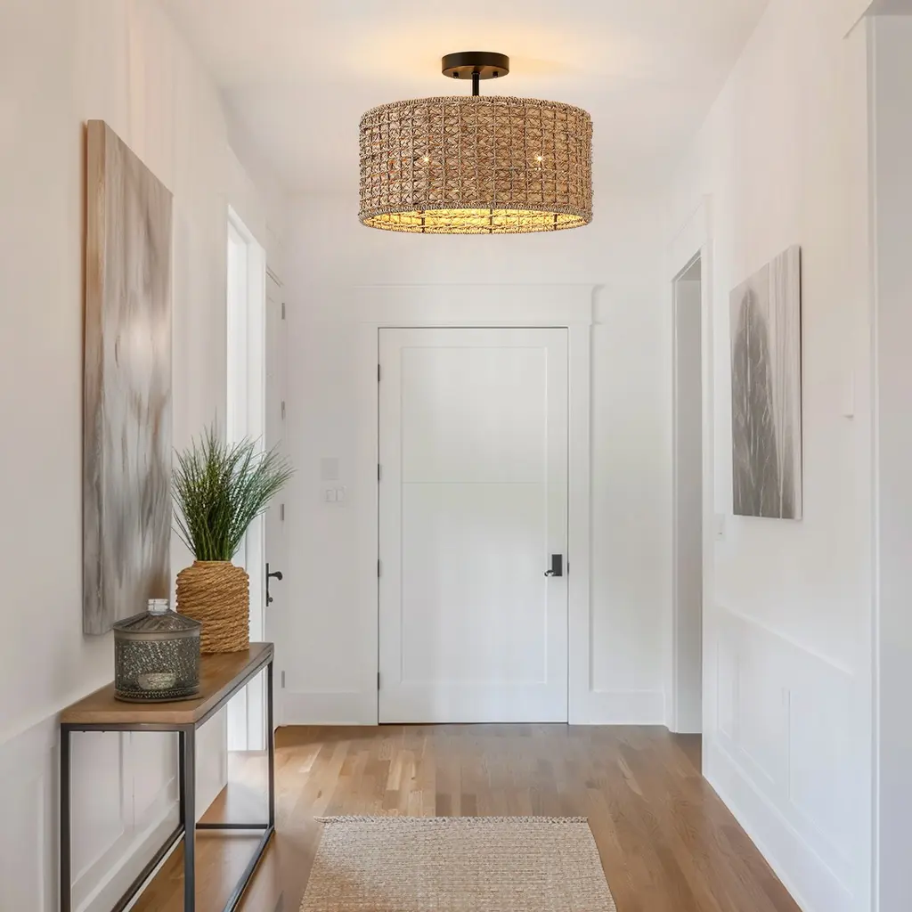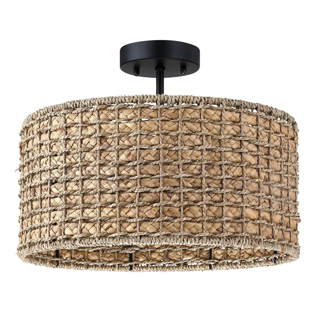 Nothing adds warmth and a casual inviting vibe like a natural woven semi-flush mount ceiling light. This flush mount is meticulously hand woven of natural rattan and seagrass in a drum silhouette. Inside, a 3-light cluster in matte black casts generous light and creates interesting shadow patterns on the walls of your entry, dining room or bedroom. This collection can work with a variety of decors, from boho, bohemian, coastal, eclectic, farmhouse to traditional styling, which is an ideal selection for hallway, entryway, stairway, door way, or a foyer to bring warmth to a living room, dinning room or bedroom.
