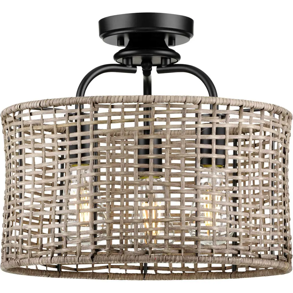 3-Light Semi Flush Mount Ceiling Light With Handmade Wicker Lampshade