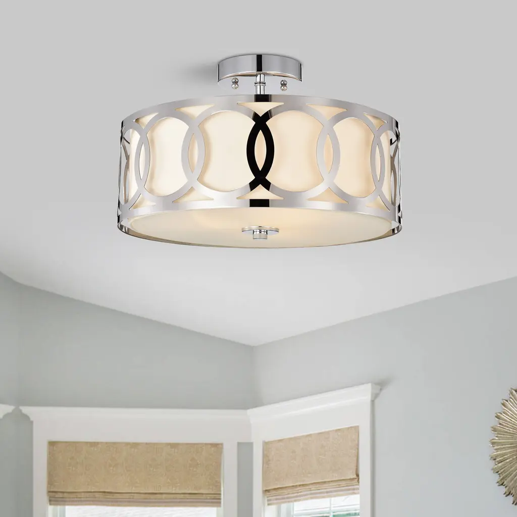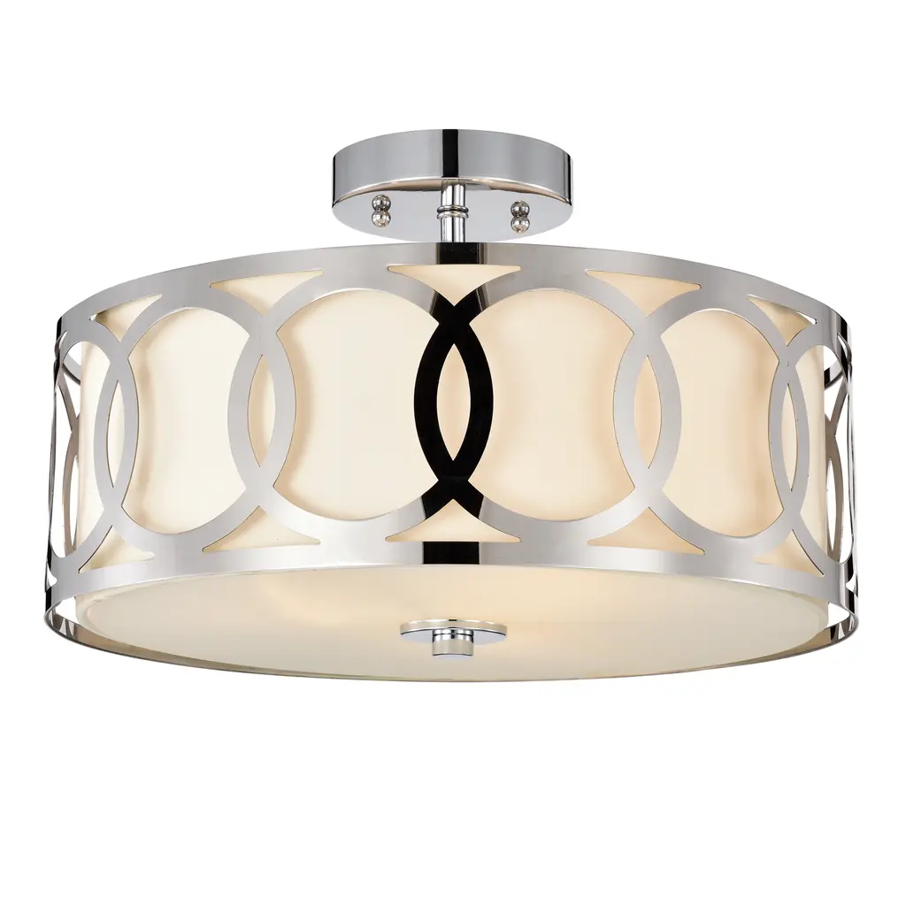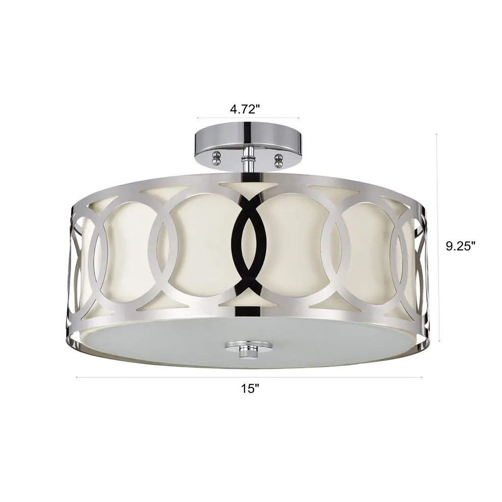 This 3-light semi-flush mount will complement many transitional decors throughout your home. The clean lines of the steel frame add interest while the combination of the fabric drum shade and frosted diffuser softens the light providing a relaxing atmosphere for many spaces. Beautiful Oil Rubbed Bronze or Chrome finishes. Wipe clean with a dry cloth. Requires: Three (3) 100 W medium base bulbs (Not Included). Fixture Dimensions: 9.25 inches high x 15 inch diameter. Since these are hand crafted products, the exact color of glass pieces may vary. Colors of the glass will appear darker and less vibrant when not illuminated. Handmade glass will vary from one piece to the other; glass made at different times will also vary. Light bulbs used in lamps or ambient lighting may affect the appearance of the products.