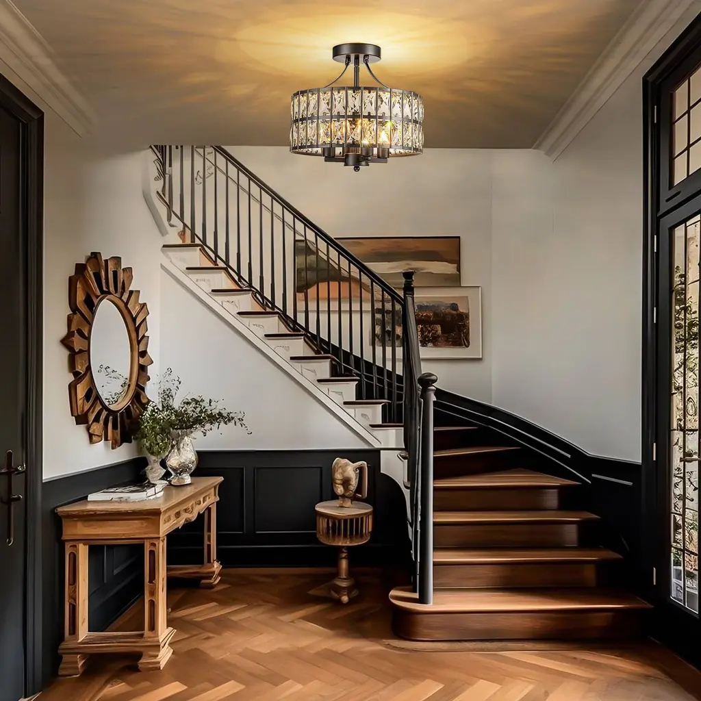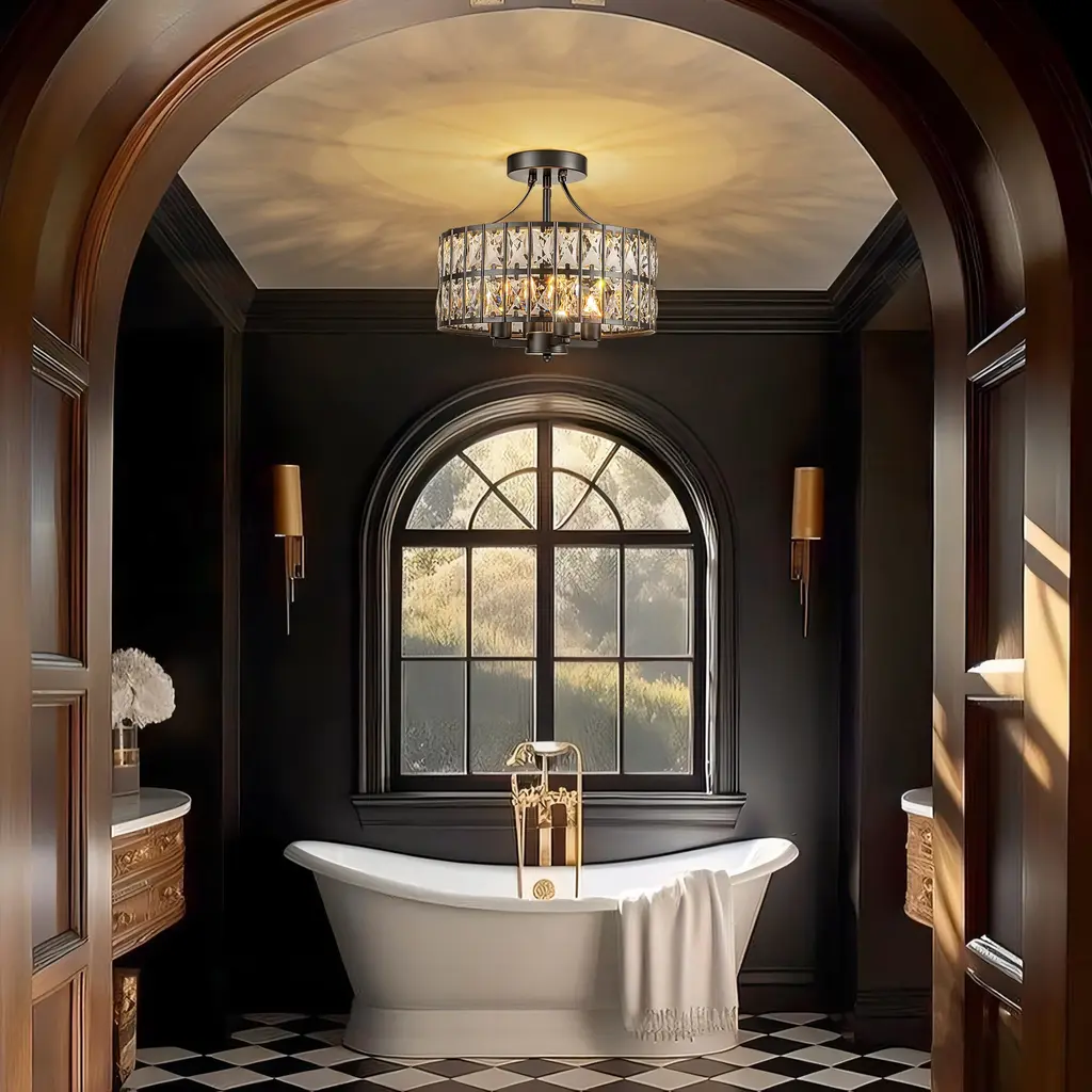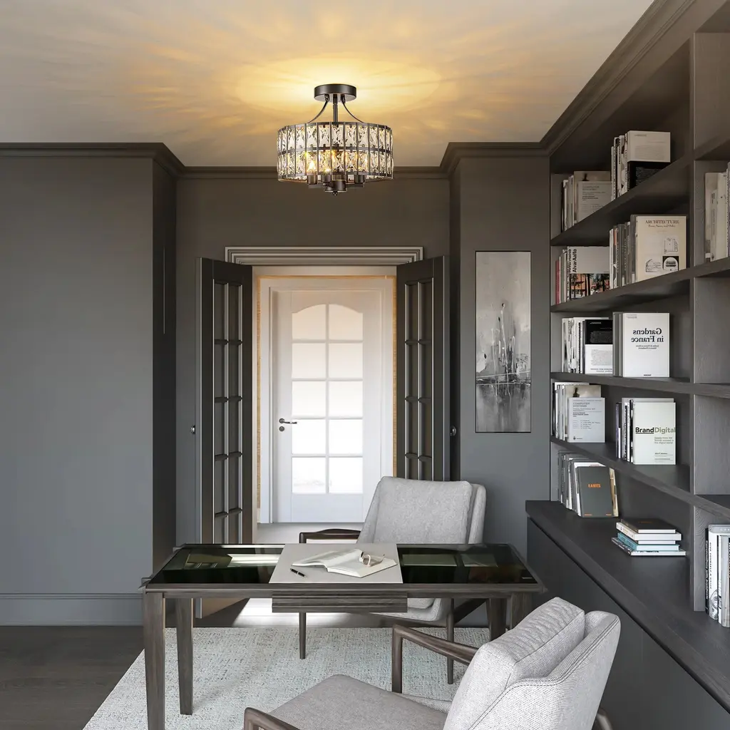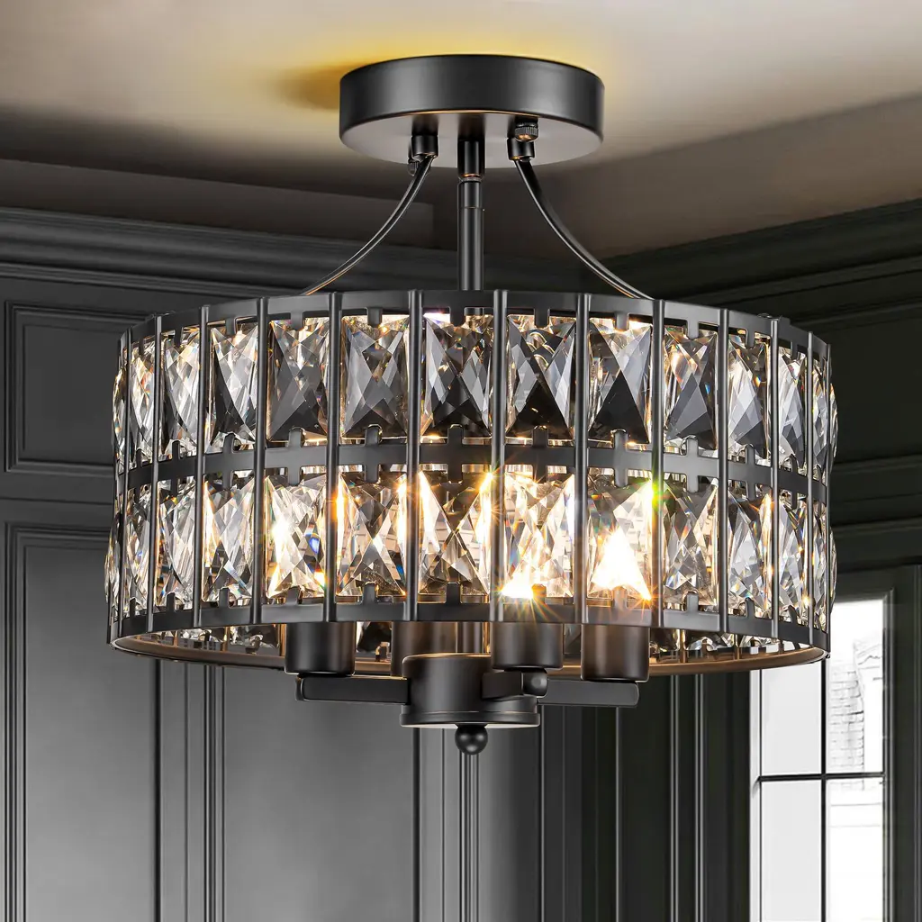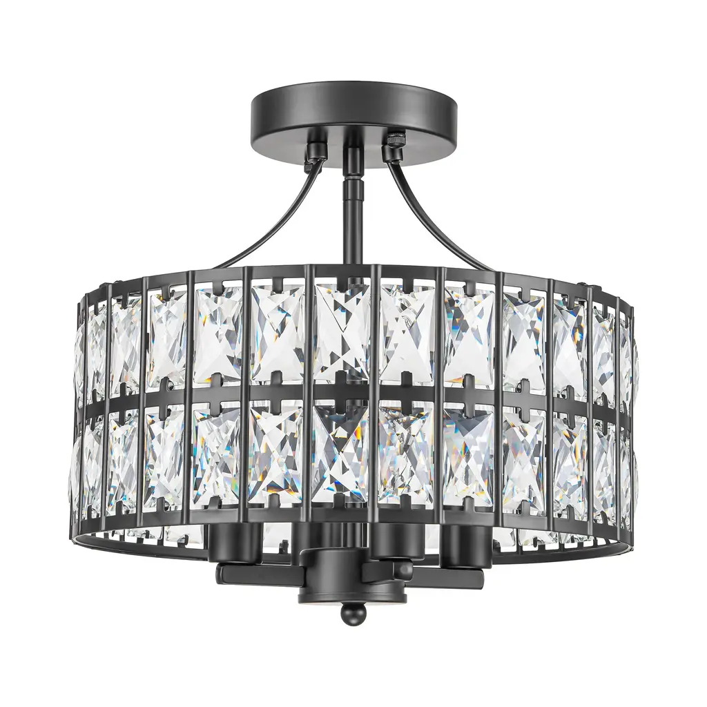 4-Light Modern Vintage Drum Crystal Semi-Flush Mount Ceiling Light - Black