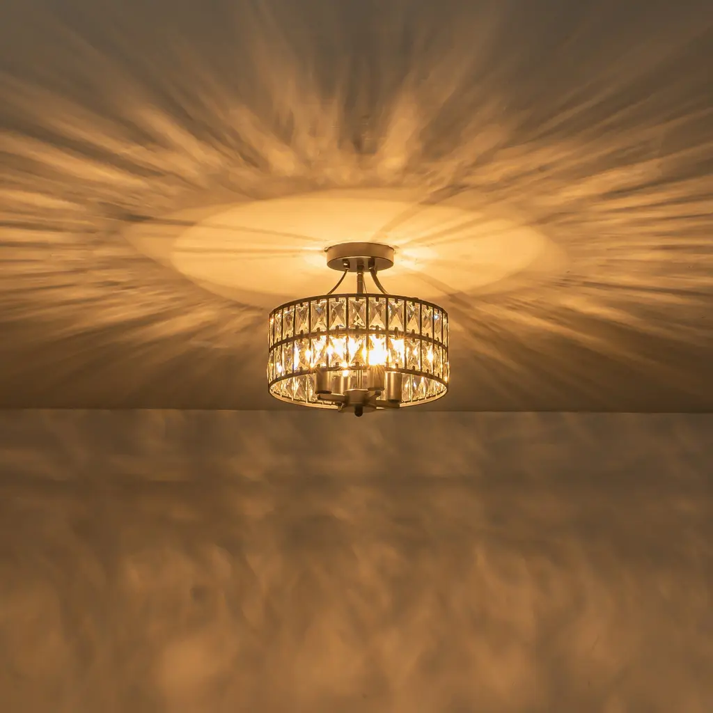 Transform your space into a luxurious haven with our 4-light mid-century modern glam crystal drum semi-flush mount light. Crafted from exquisite square crystals elegantly nestled within a sturdy metal lantern frame, this modern industrial crystal cage lantern ceiling light exudes resplendent opulence while casting a romantic and ethereal glow and shadow across the ceiling. Its striking cone drum-shaped design adds architectural intrigue and unparalleled brilliance to your living environment. Features: Product Details: Dimensions: (see image gallery for dimensional drawing)