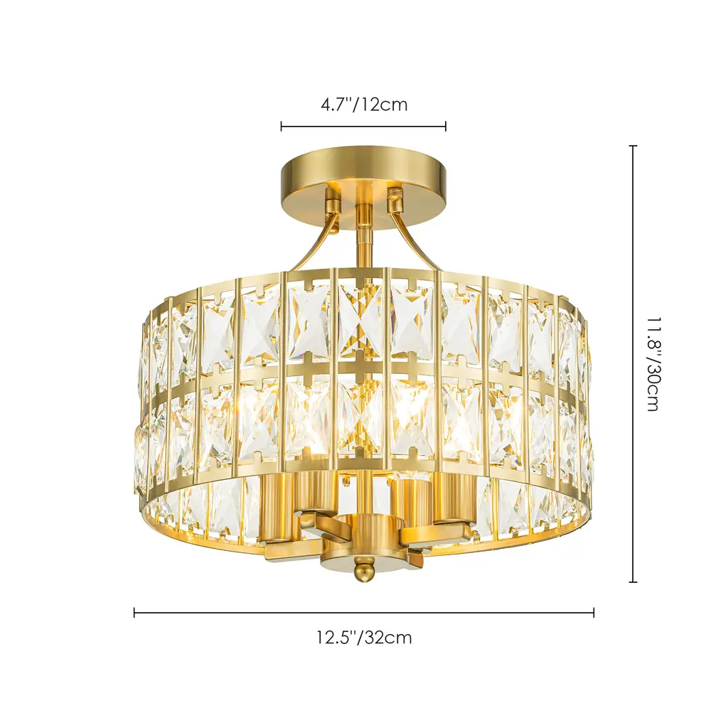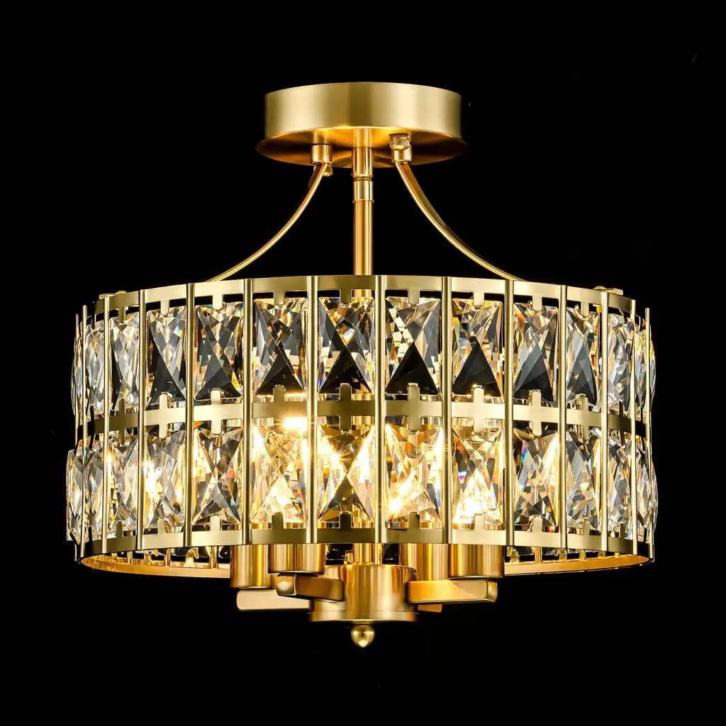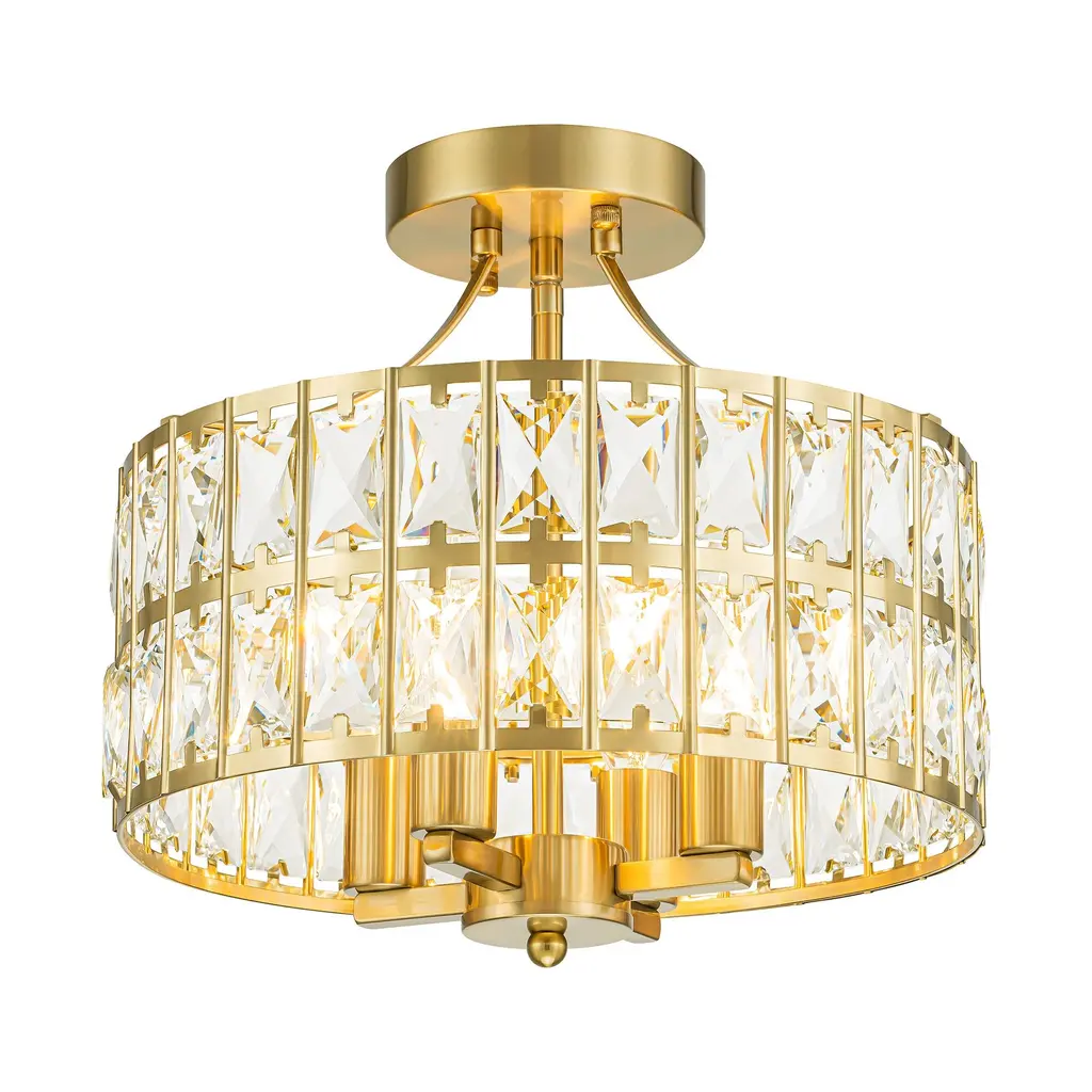 4-Light Modern Vintage Drum Crystal Semi-Flush Mount Ceiling Light - Brushed Brass