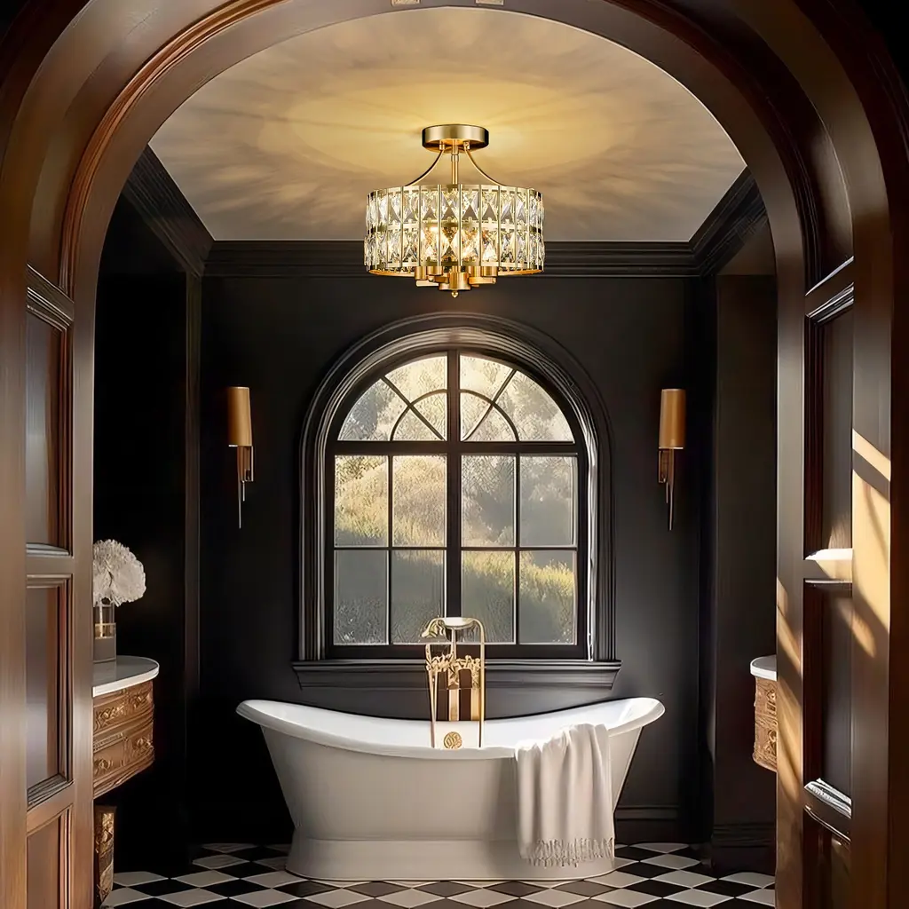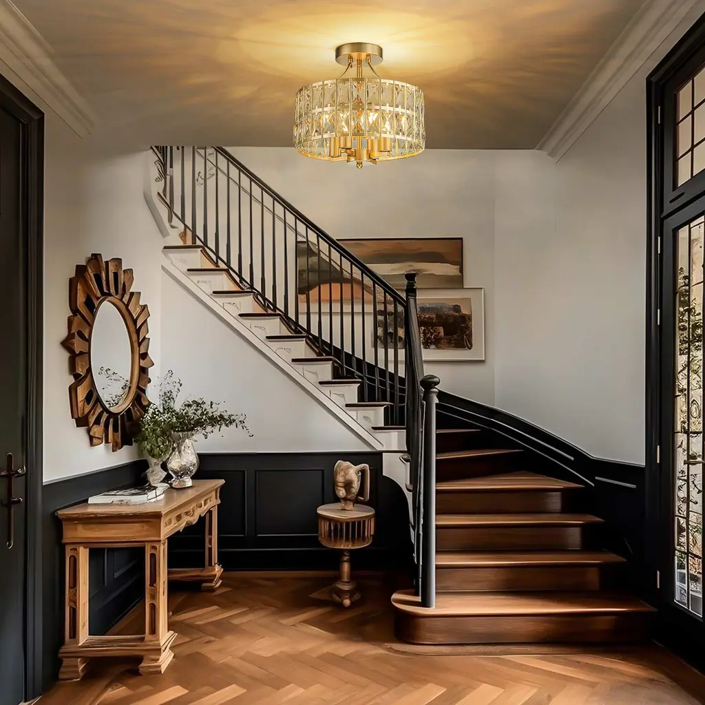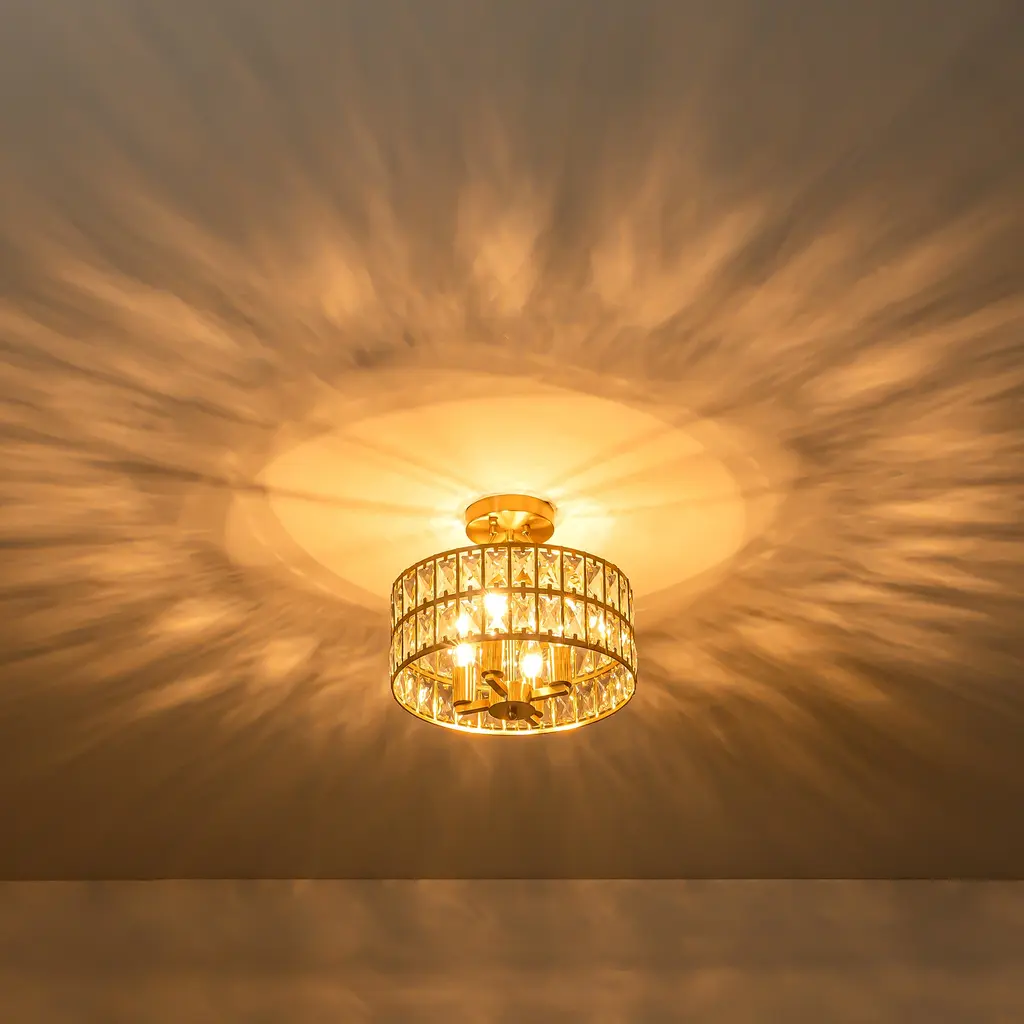 Transform your space into a luxurious haven with our 4-light mid-century modern glam crystal drum semi-flush mount light. Crafted from exquisite square crystals elegantly nestled within a sturdy metal lantern frame, this modern industrial crystal cage lantern ceiling light exudes resplendent opulence while casting a romantic and ethereal glow and shadow across the ceiling. Its striking cone drum-shaped design adds architectural intrigue and unparalleled brilliance to your living environment. Features: Product Details: Dimensions: (see image gallery for dimensional drawing)