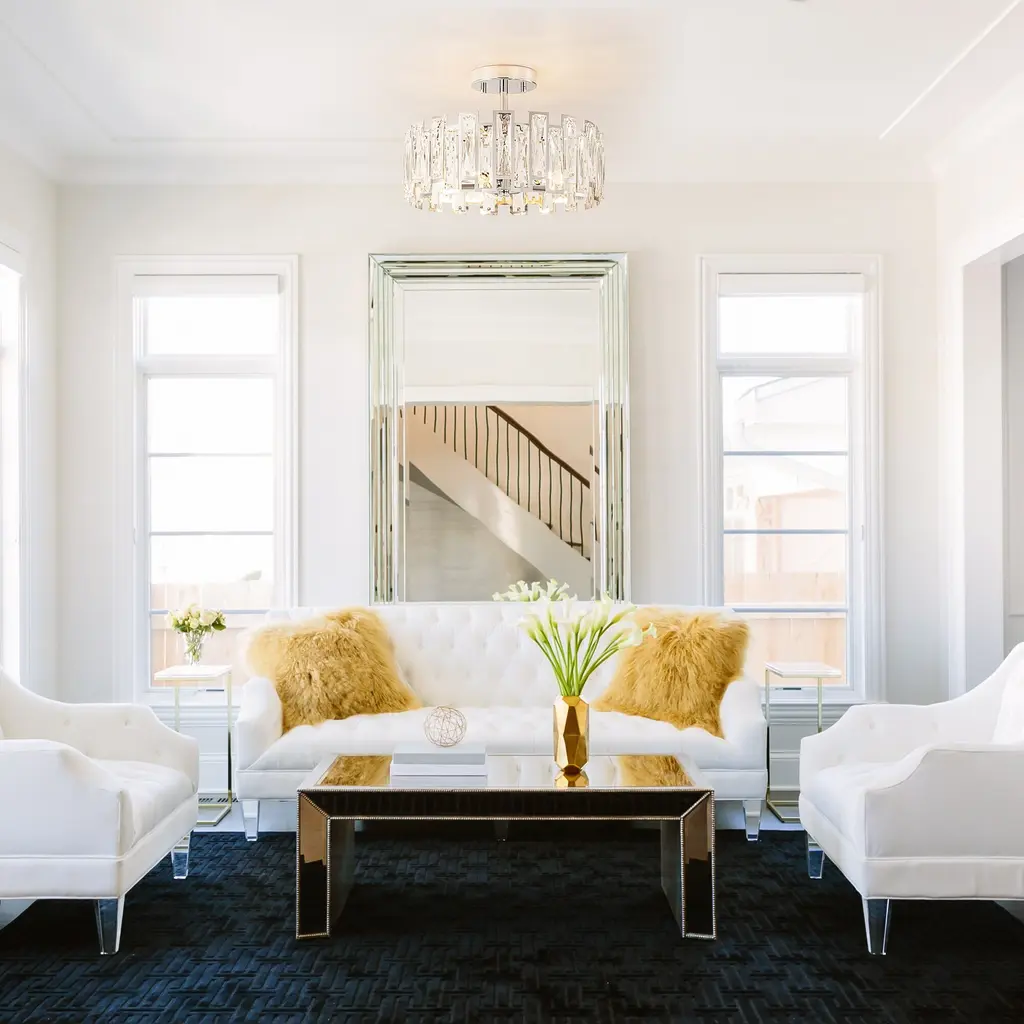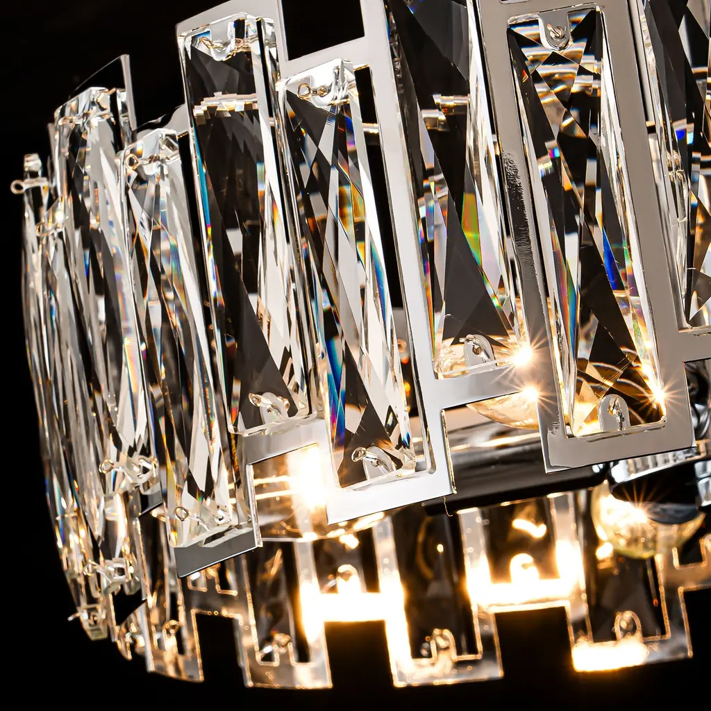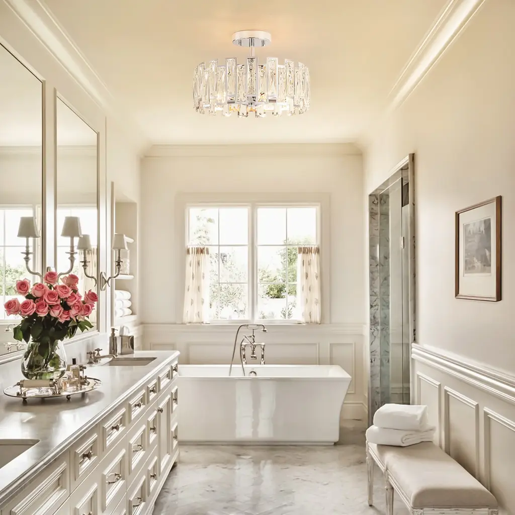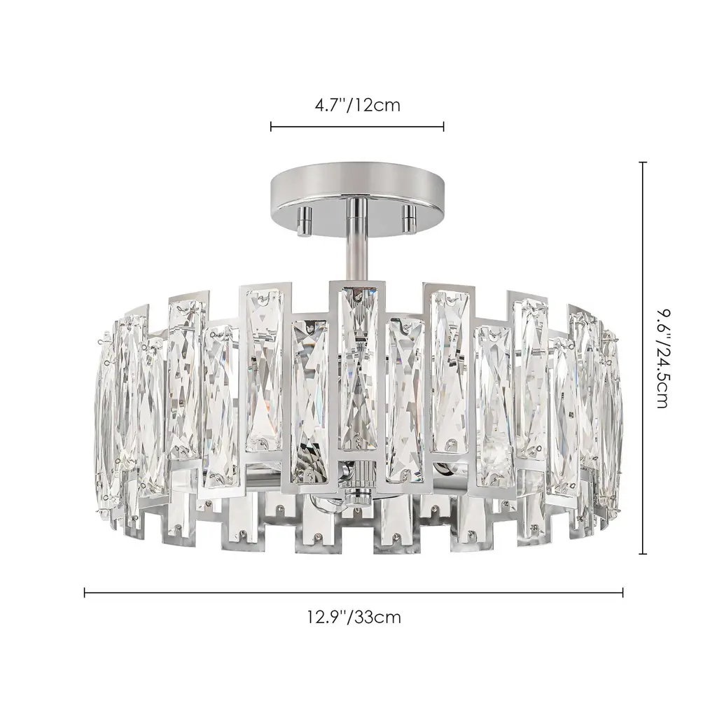 Experience the perfect blend of modern and industrial styles with our 5-light 13" Crystal Ceiling Light. Crafted from flawless K9 crystals, this mid-century modern drum ceiling light can add a luxurious but unassuming touch to your space while meeting your daily lighting needs. The gleaming crystal bar accents and metal finish make this semi-flush mount light blend seamlessly the traditional to contemporary decor. This crystal drum flush mount light brings instant beauty and warm lighting wherever you hang it. Features: Product Details: Dimensions: (see image gallery for dimensional drawing)