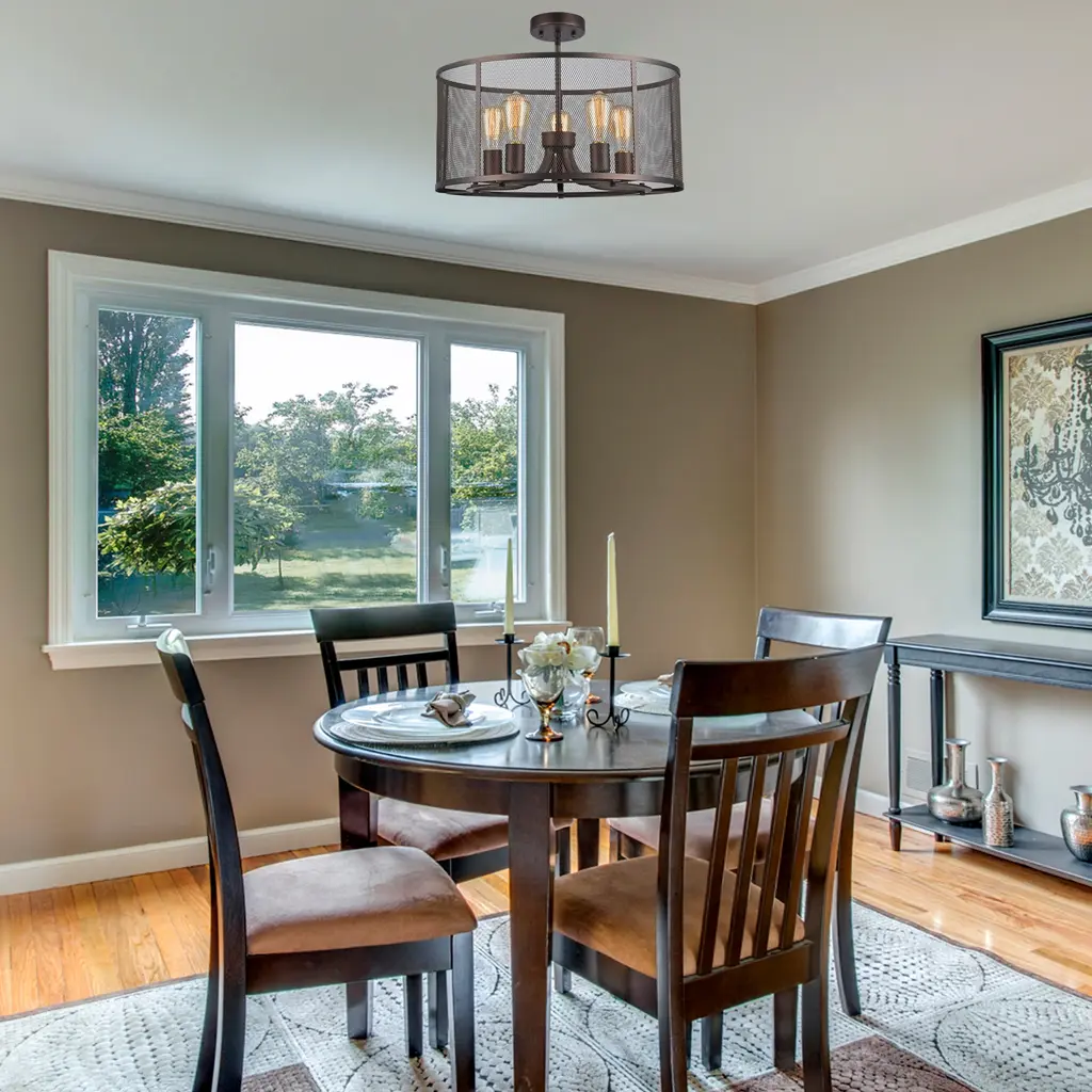 This 5-light semi-flush mount fixture features an oil rubbed bronze finish that will complement a variety of industrial, rustic, or transitional decors throughout your home. The clean lines of the steel mesh frame add interest while the exposed bulbs provided ample light for many spaces. Requires: Five (5) 100 Watt max E26 Type A Bulbs (Not Included). Product Care: Wipe clean with a dry cloth. Mounting hardware is Included. Fixture Dimensions: 9.45 inches high x 20 inch diameter.