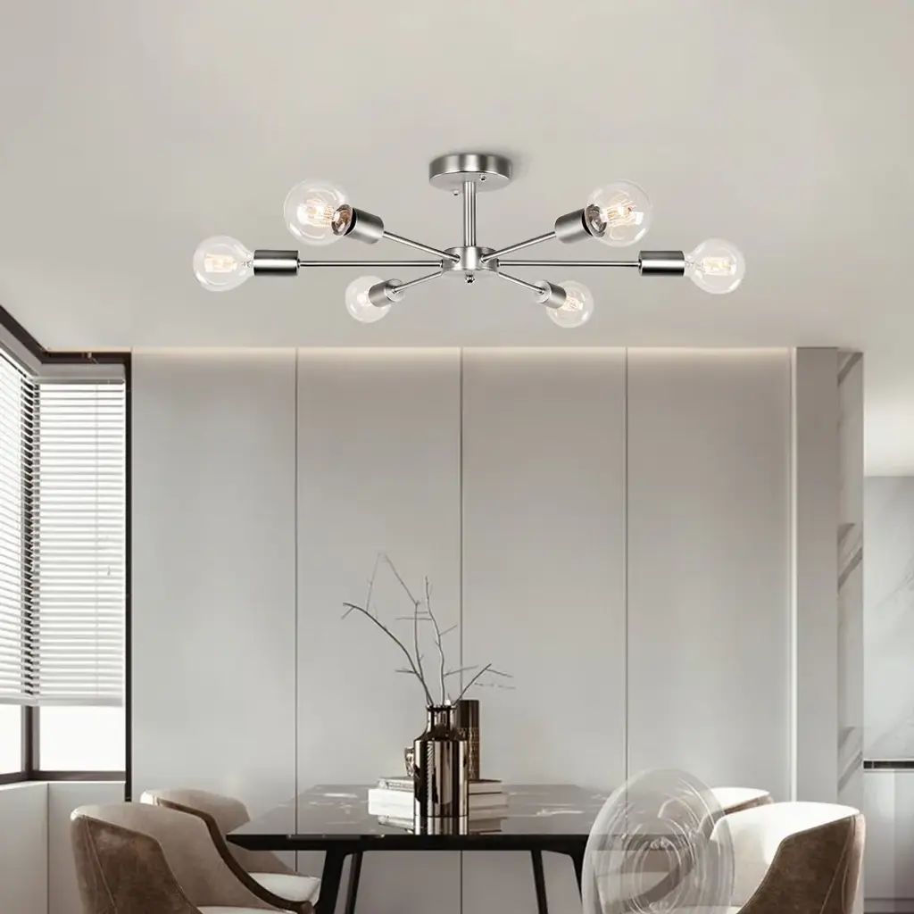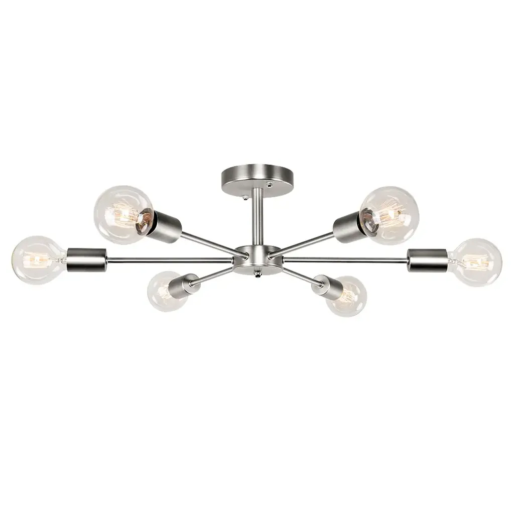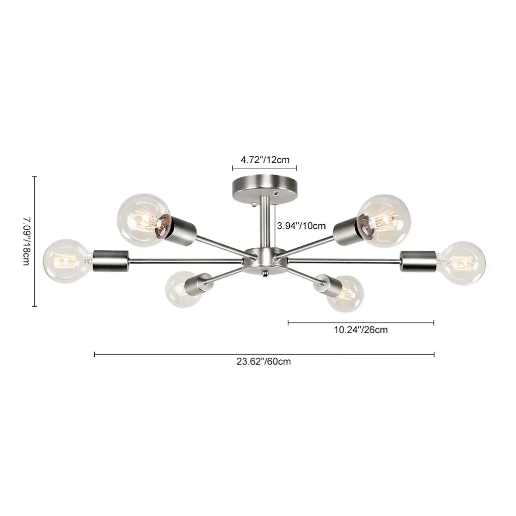 This 6-light metal industrial semi-flush mount light has a mid-century appeal defined by an array of arms extending outward from a rounded central support. The Sputnik linear semi-flush ceiling light elaborates with a polished nickel/ black/ gold finish for an extraordinarily long service life. Keeping the cluster shape of the flush mount lighting for a long time and is not easy to bend. Uses 6 x E26 base 40-watt max bulbs(not included) to give you enough illumination. With a contemporary vibe and exposed bulbs, this light fixture is sure to be an eye-catching decor. Features: Product Details: Dimensions: (see image gallery for dimensional drawing)