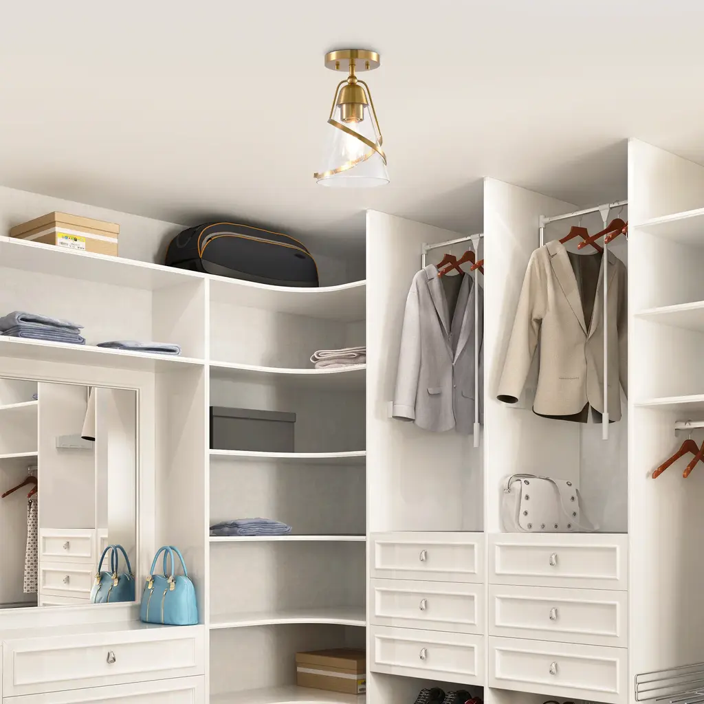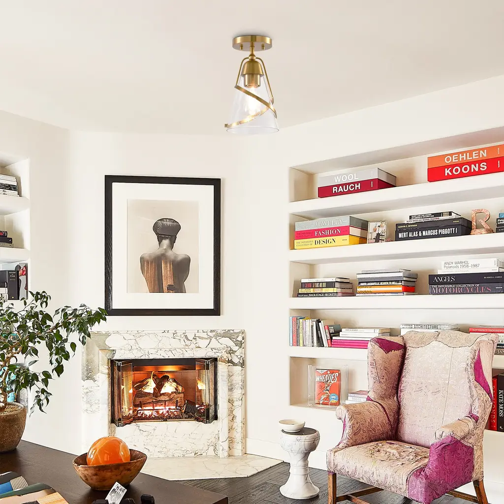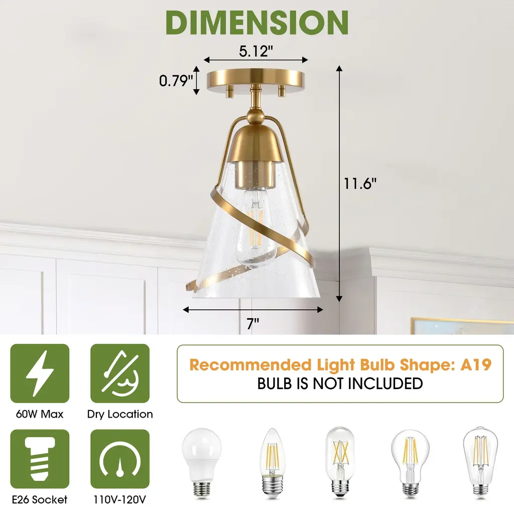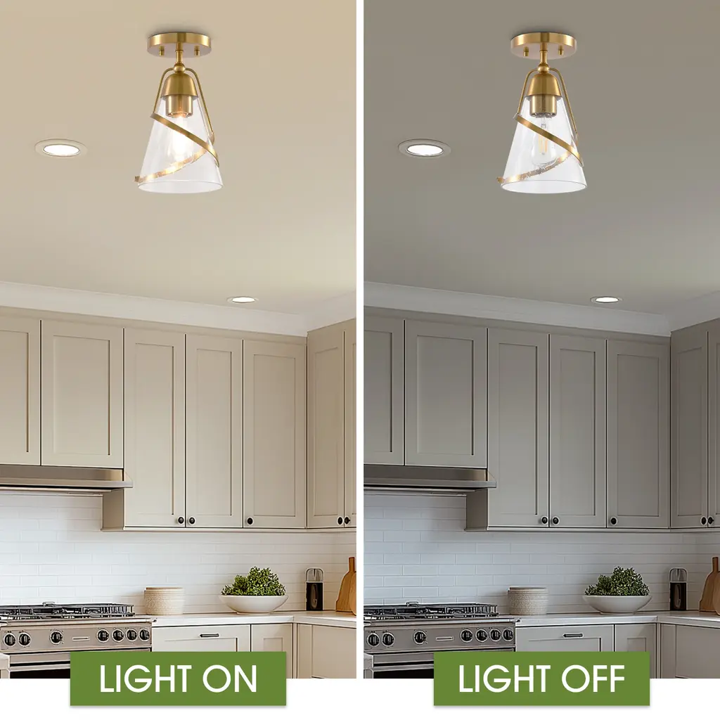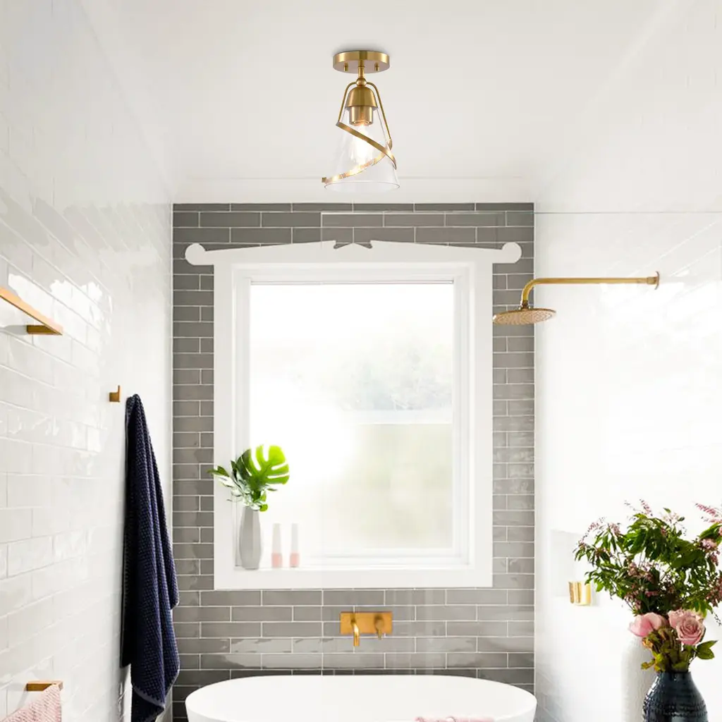 Elevate your interior with this modern 7-inch ceiling light, featuring a sleek golden finish and clear glass for a touch of versatile elegance.【Modern Design】: Features a sleek, modern style with a golden finish and is constructed from durable iron and clear glass.【Versatile Placement】: Includes all necessary hardware and user manual for semi-flush mounting, ideal for bedrooms, dining rooms, and living rooms.【Certified Safe】: ETL certified for safety and a 1-year warranty is reliable.