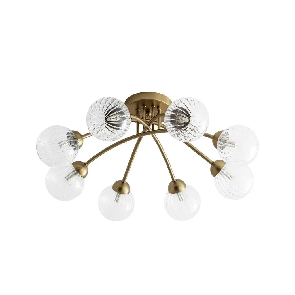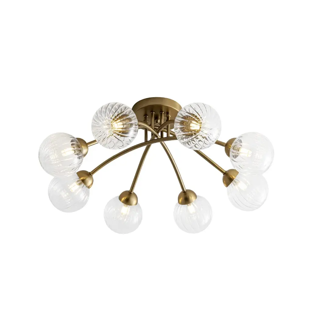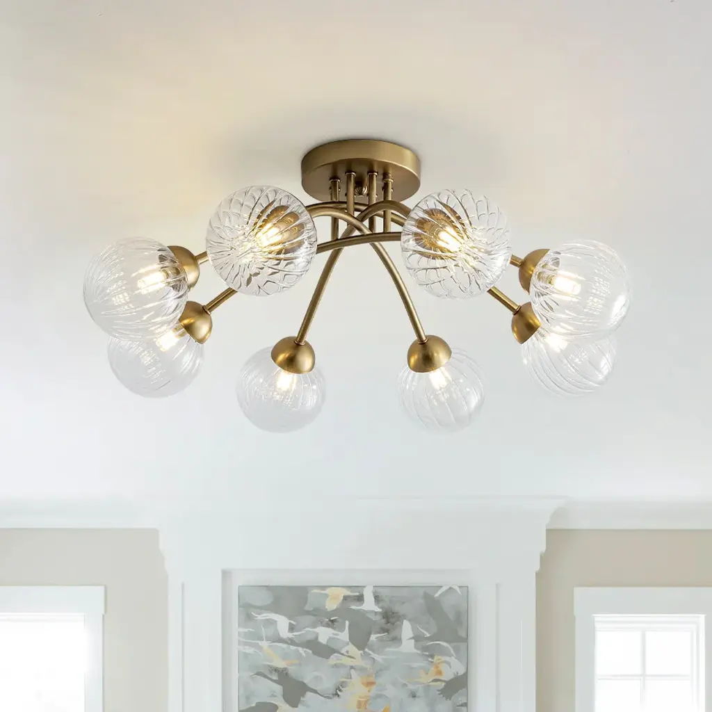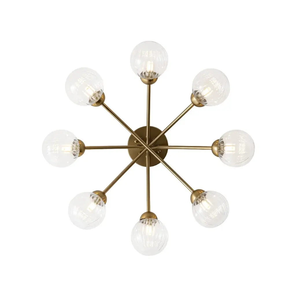 Upgrade your interiors with the radiant charm of the 8-light modern pleated glass globe semi-flush mount, where sleek modernity meets timeless elegance. Its symmetrical sputnik silhouette boasts gracefully curved arms extending from a brushed gold centerpiece, creating a striking visual balance that adds sophistication to any space. Each pleated glass globe is meticulously crafted to diffuse light in soft, shimmering patterns, casting a warm and inviting glow across your room. The brushed gold finish enhances its luxurious appeal, making it a perfect fit for modern, contemporary, or mid-century-inspired décor. Designed to dazzle in living rooms, bedrooms, or entryways, this semi-flush mount combines functionality with a chic aesthetic, ensuring your space shines with effortless style. Let this fixture be the crowning jewel of your home lighting ensemble.Features:Dimensions: