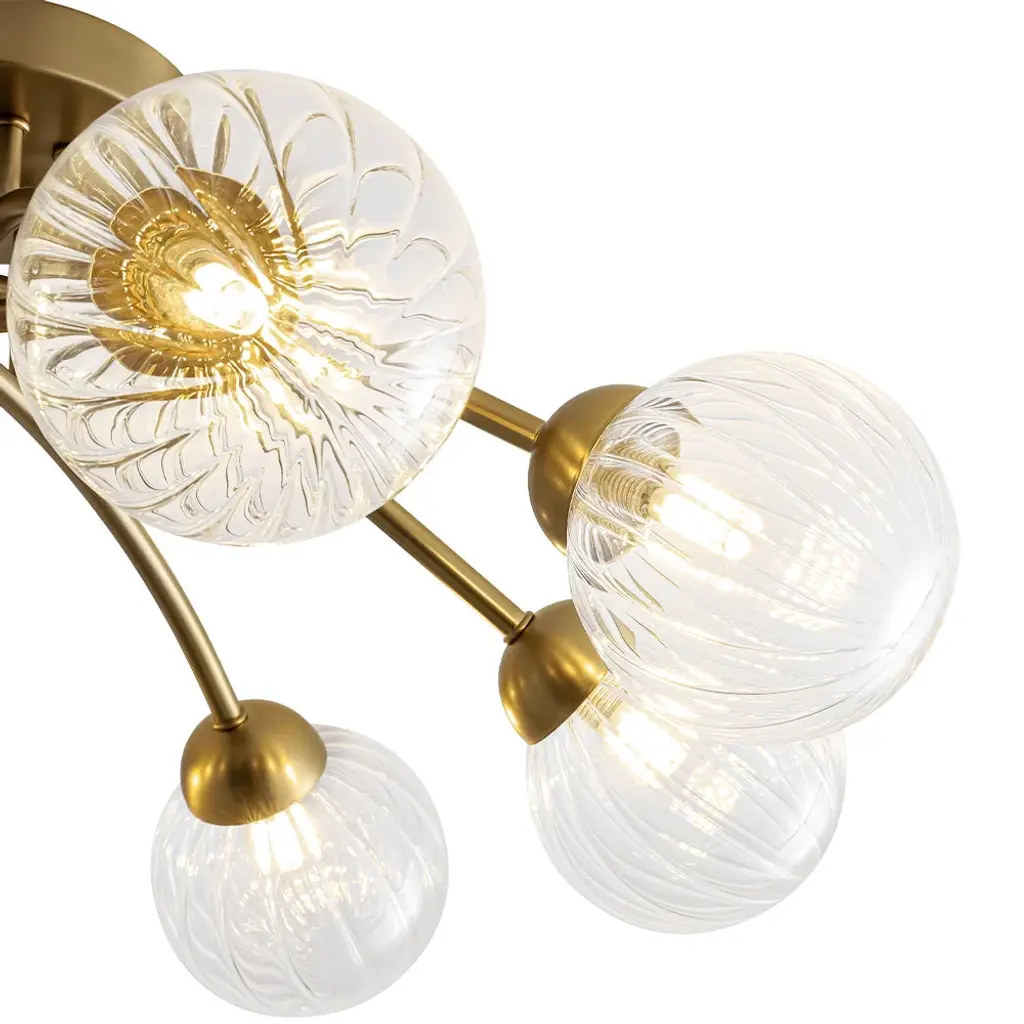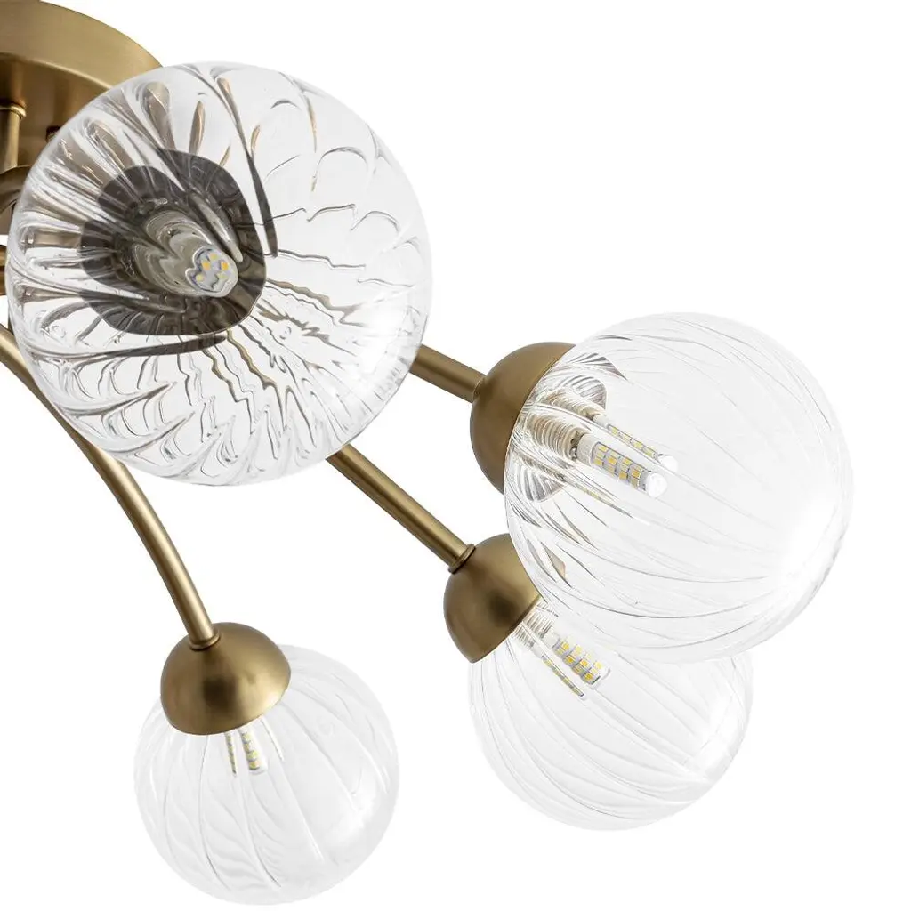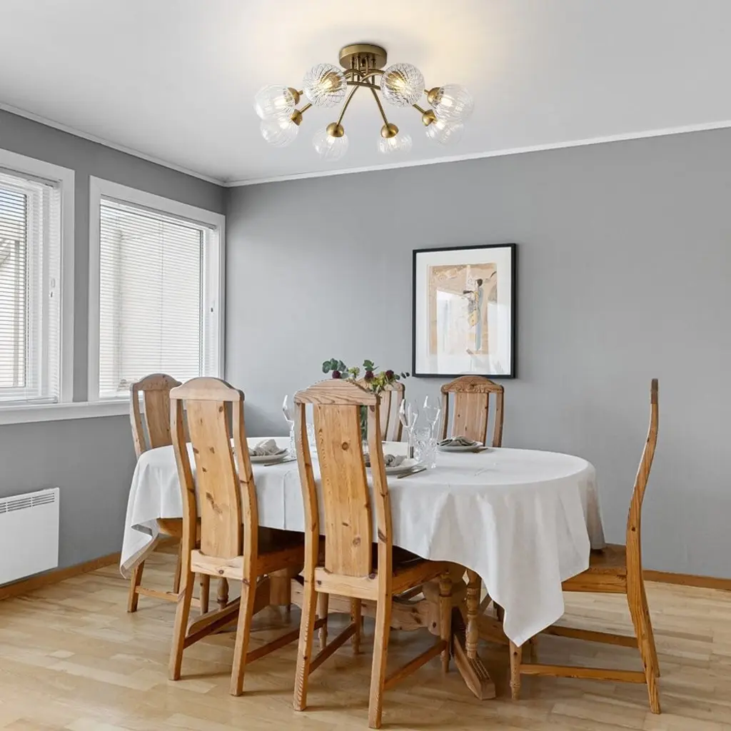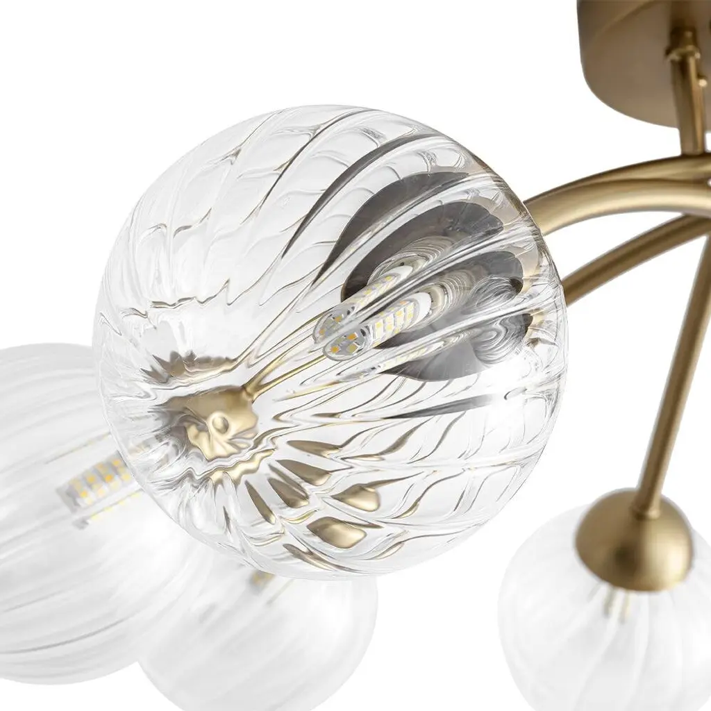 Upgrade your interiors with the radiant charm of the 8-light modern pleated glass globe semi-flush mount, where sleek modernity meets timeless elegance. Its symmetrical sputnik silhouette boasts gracefully curved arms extending from a brushed gold centerpiece, creating a striking visual balance that adds sophistication to any space. Each pleated glass globe is meticulously crafted to diffuse light in soft, shimmering patterns, casting a warm and inviting glow across your room. The brushed gold finish enhances its luxurious appeal, making it a perfect fit for modern, contemporary, or mid-century-inspired décor. Designed to dazzle in living rooms, bedrooms, or entryways, this semi-flush mount combines functionality with a chic aesthetic, ensuring your space shines with effortless style. Let this fixture be the crowning jewel of your home lighting ensemble.Features:Dimensions:
