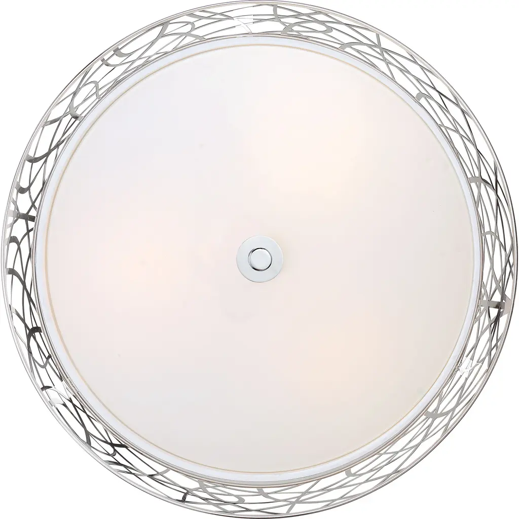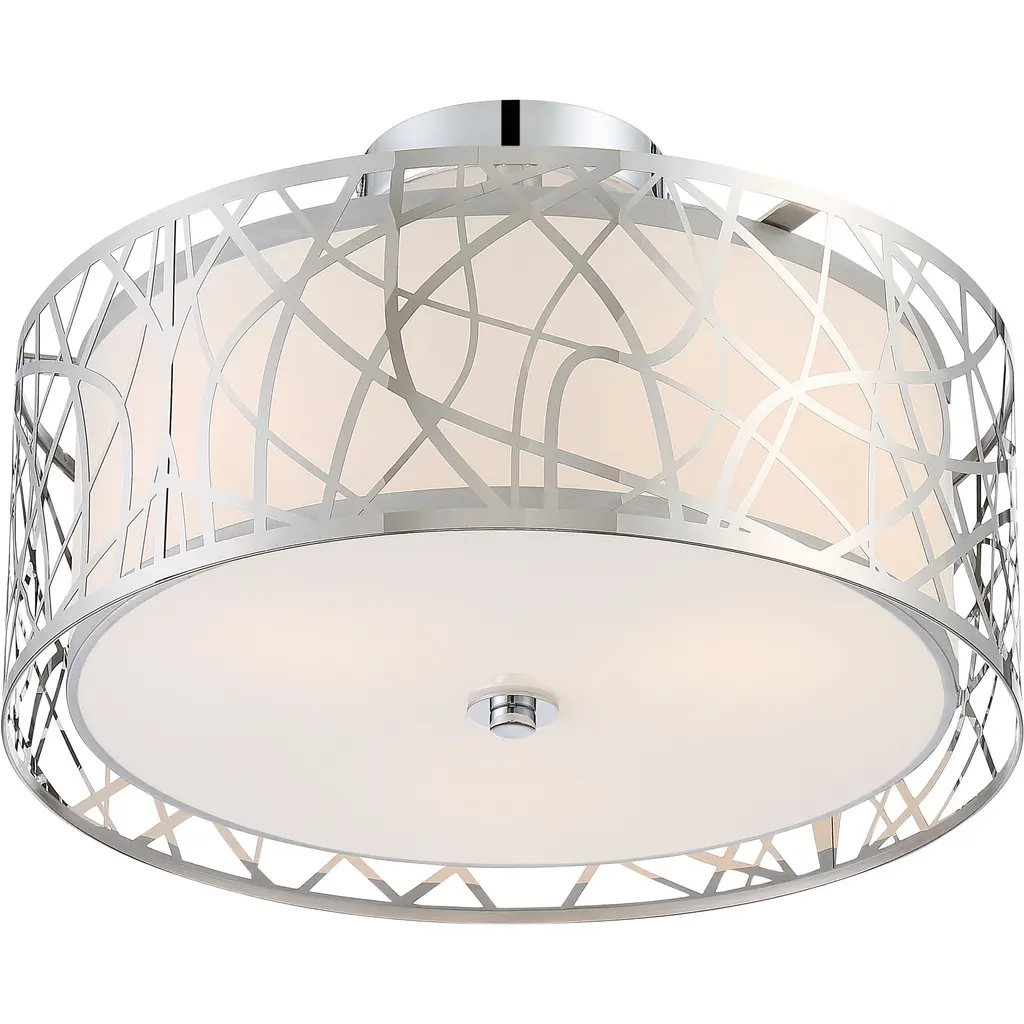 Platinum Collection Abode - C Polished Chrome Finish, Medium Semi Flush Mount: Contemporary diverse and sharp are what makes the Platinum Collections Abode pendant a hit. The dual shades are combined to create a cohesive look with clear organza trimmed in grey under a laser cut metal shade with an intriguing unique design. The sleek polished chrome finish completes the look.