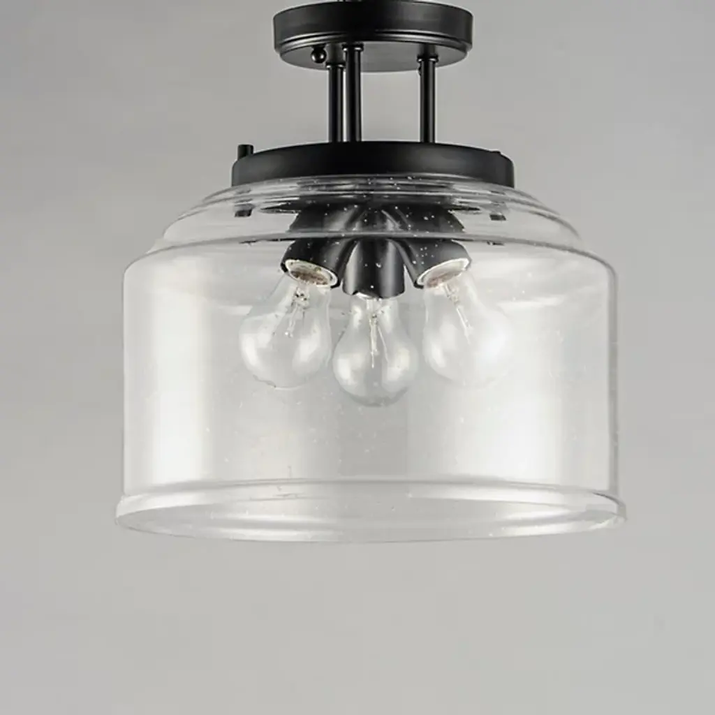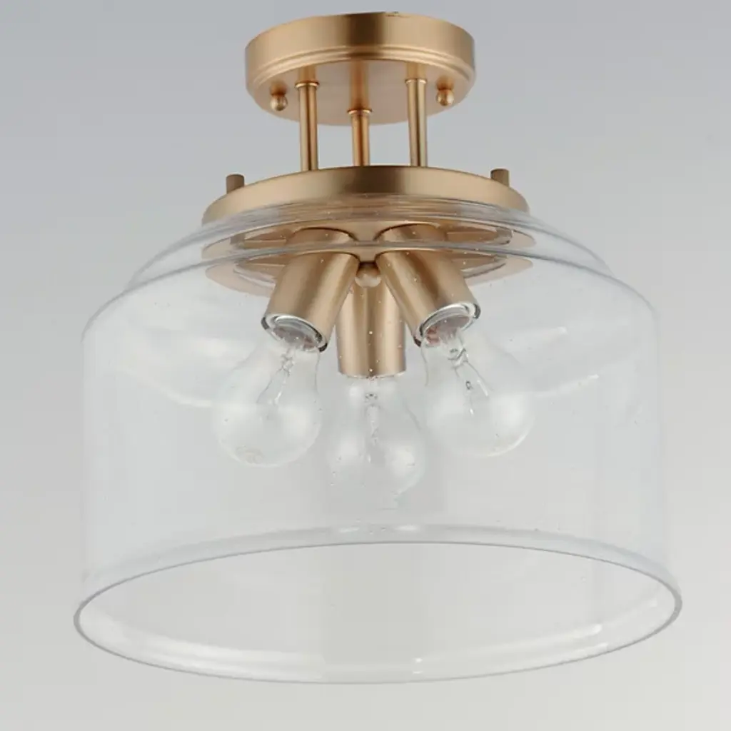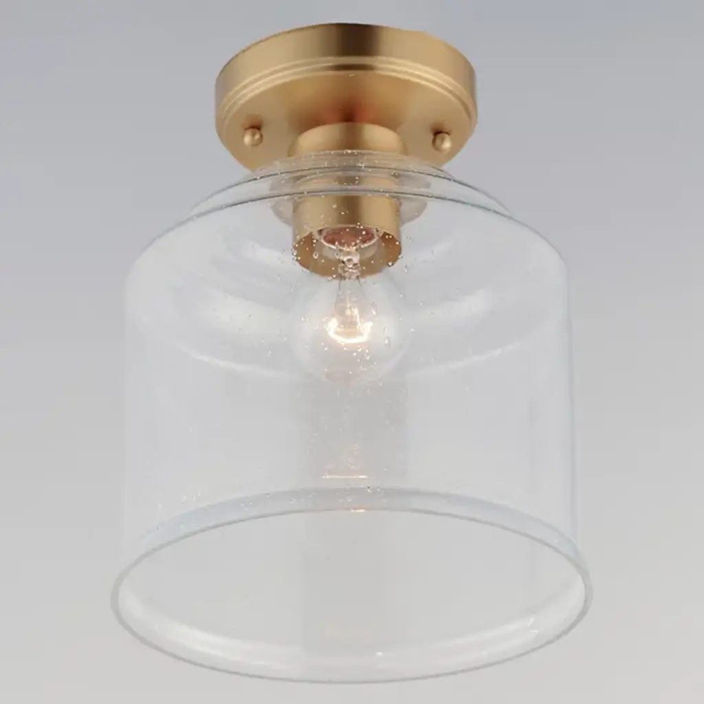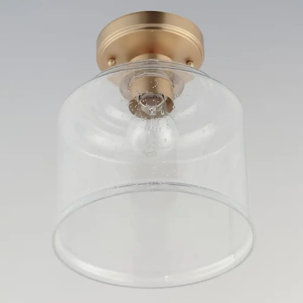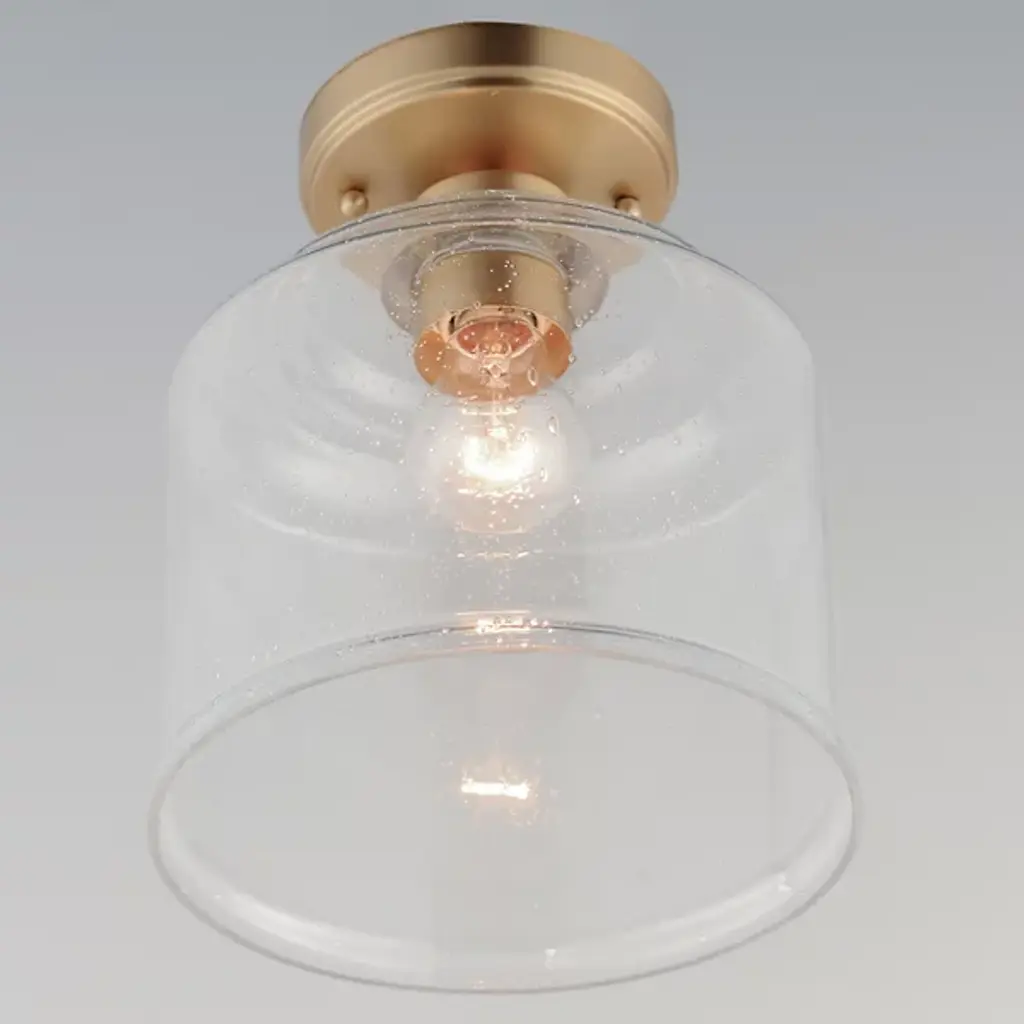 Clean, refined, and handsome. Look up and find the warm, textured glow of the Acadia Semi-Flushmount from Maxim Lighting glazing across your room. A steel circular canopy brings an elegant hint of traditional accenting in its dotted details. Like a cascading waterfall, its glass shade drops down, brimming with a timeless clear-seeded design. Clear bulbs add to the enduring character of the piece; their glowing filaments create dazzling highlights that catch onto the seeded texture.