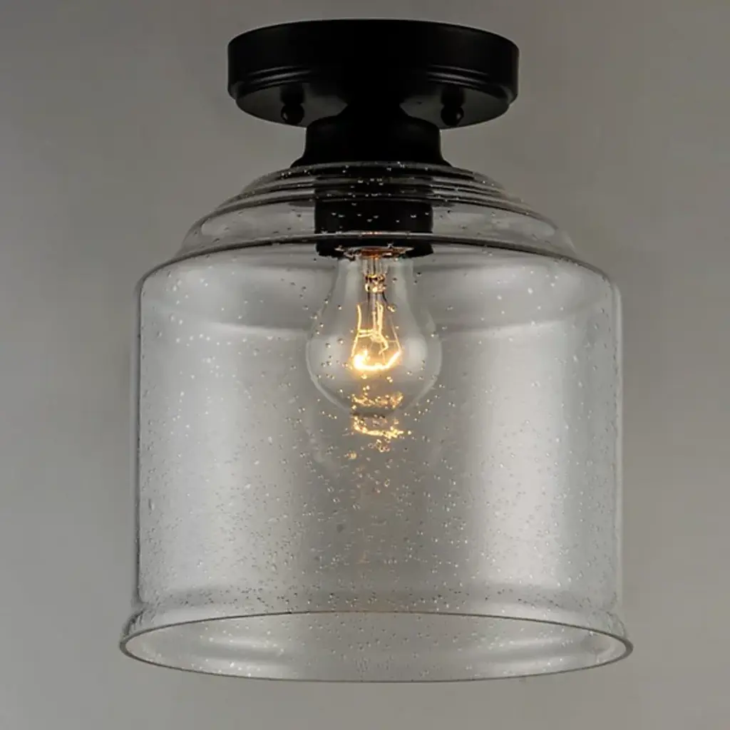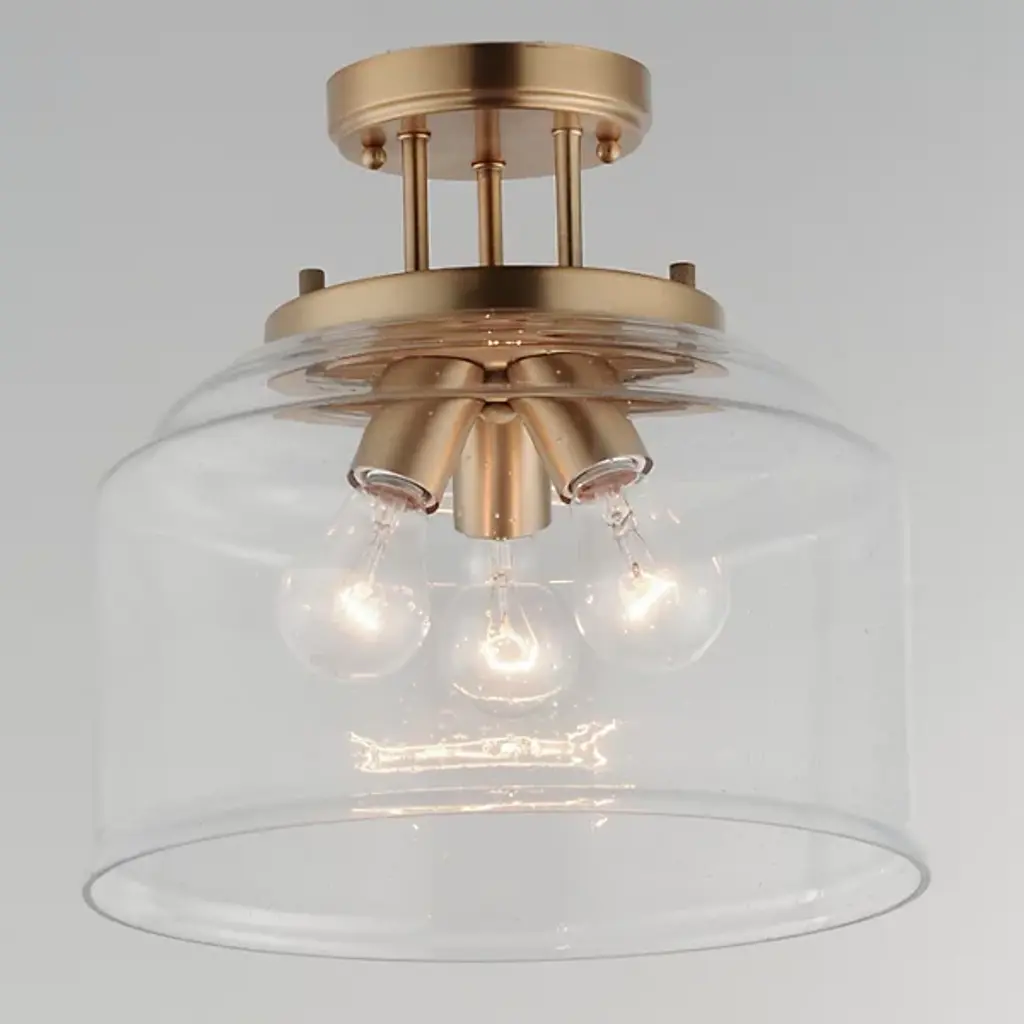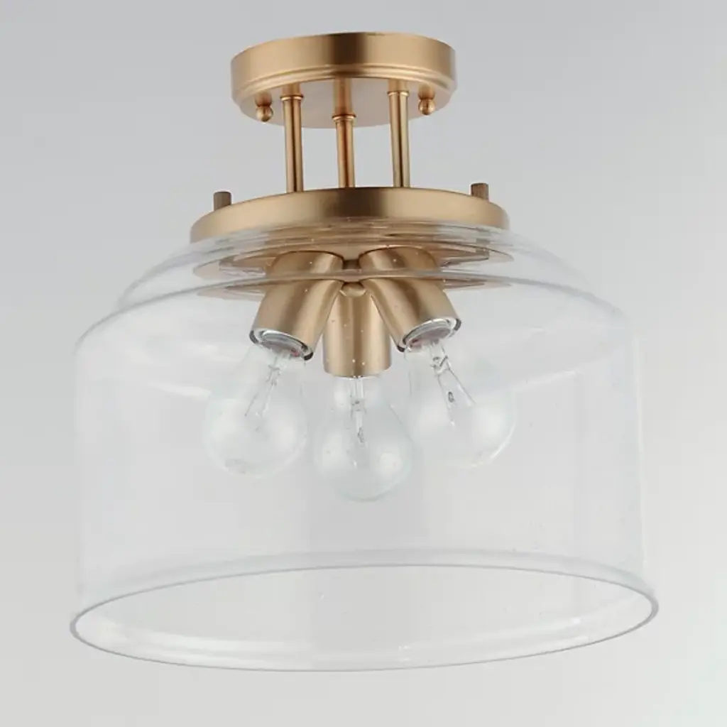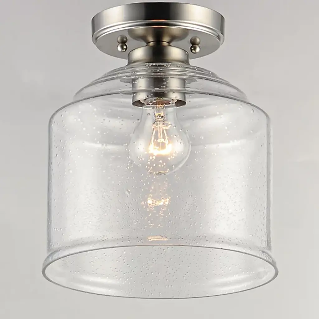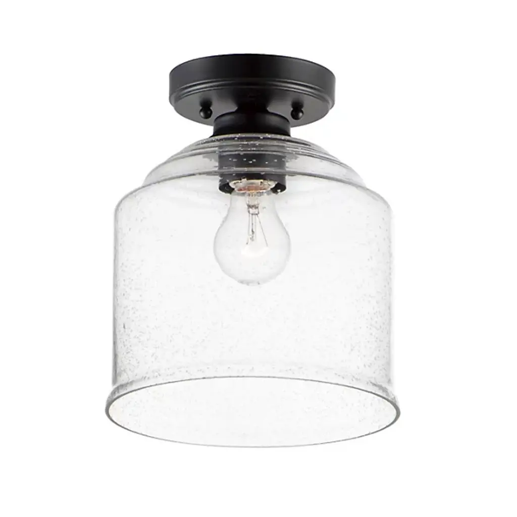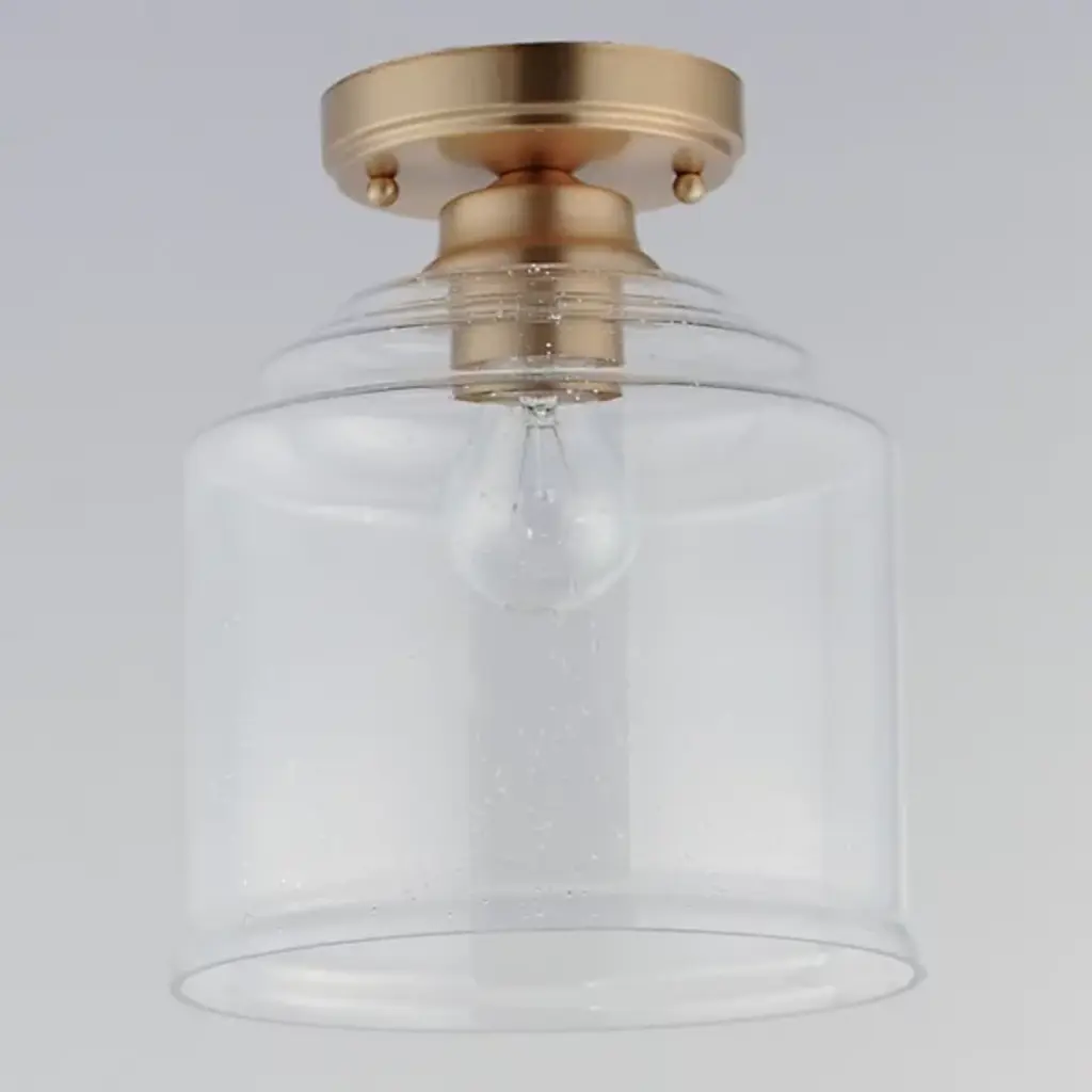 Clean, refined, and handsome. Look up and find the warm, textured glow of the Acadia Semi-Flushmount from Maxim Lighting glazing across your room. A steel circular canopy brings an elegant hint of traditional accenting in its dotted details. Like a cascading waterfall, its glass shade drops down, brimming with a timeless clear-seeded design. Clear bulbs add to the enduring character of the piece; their glowing filaments create dazzling highlights that catch onto the seeded texture.