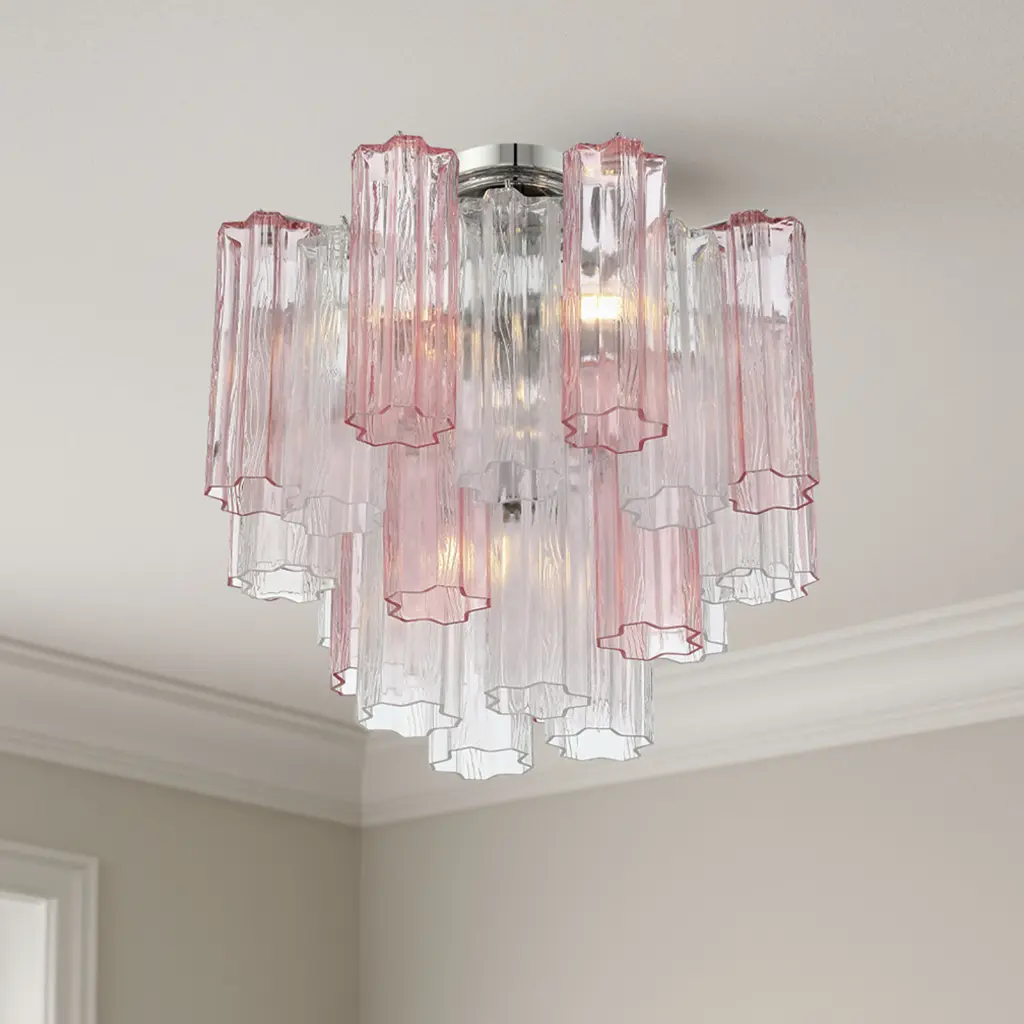 The captivating Addis Lighting Collection is a modern-day interpretation of the iconic mid-century Tronchi chandelier. Inspired by its predecessor's sleek lines and geometric shapes, the Addis features a polished Chrome or Aged Brass metal frame that exudes sophistication and style. Its unique design showcases transparent tiers of textured Tronchi glass tubes, forming a mesmerizing 5-point rounded star shape. Choose from a range of glass colors, including clear, amber, smoke, and white, or the stunning Autumn option, which features a captivating multicolor disposition of amber, clear, and smoke Tronchi glass. The Addis Lighting Collection offers various sizes and finishes, allowing you to find the perfect fit for your space while adding a touch of timeless elegance.