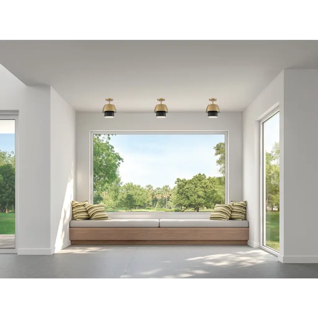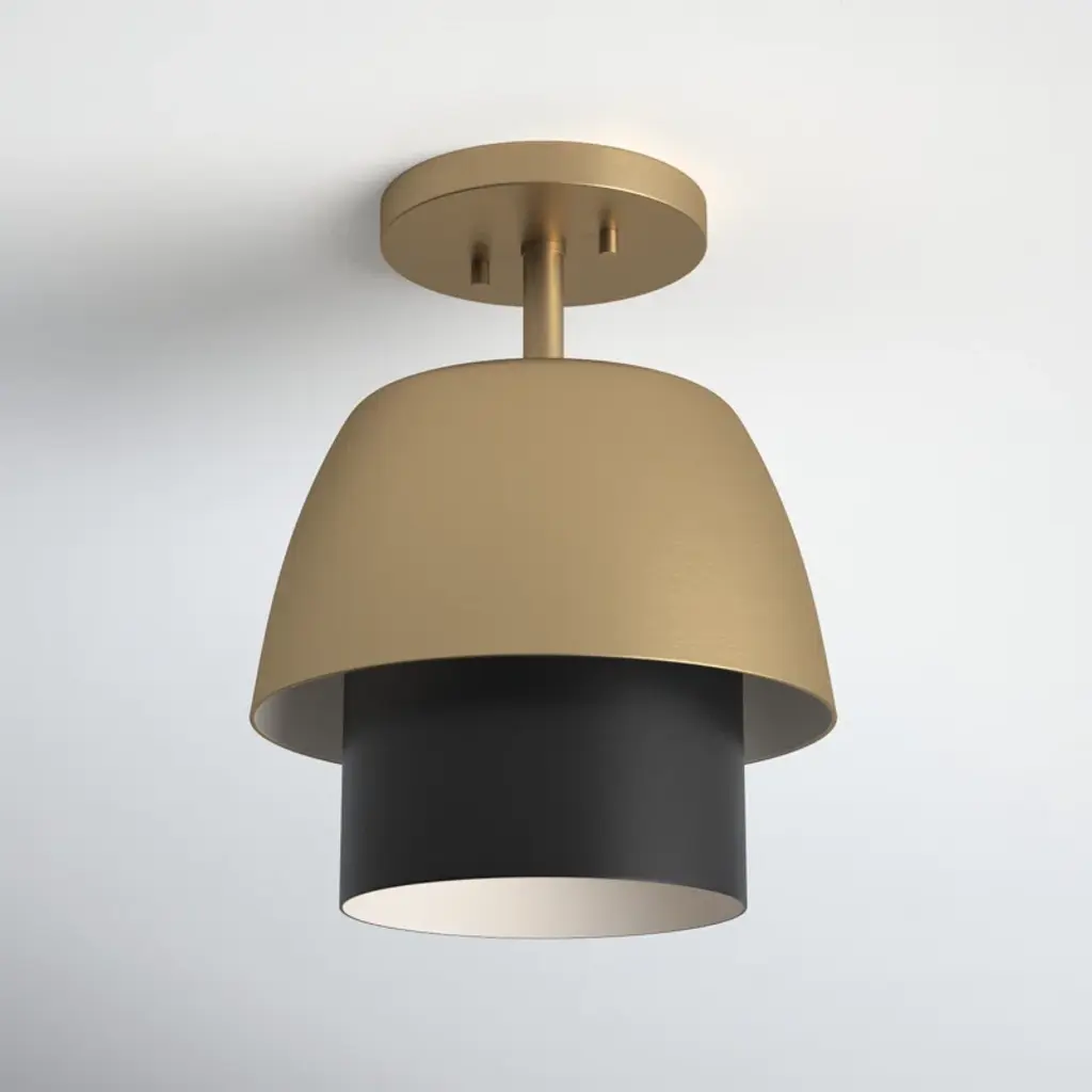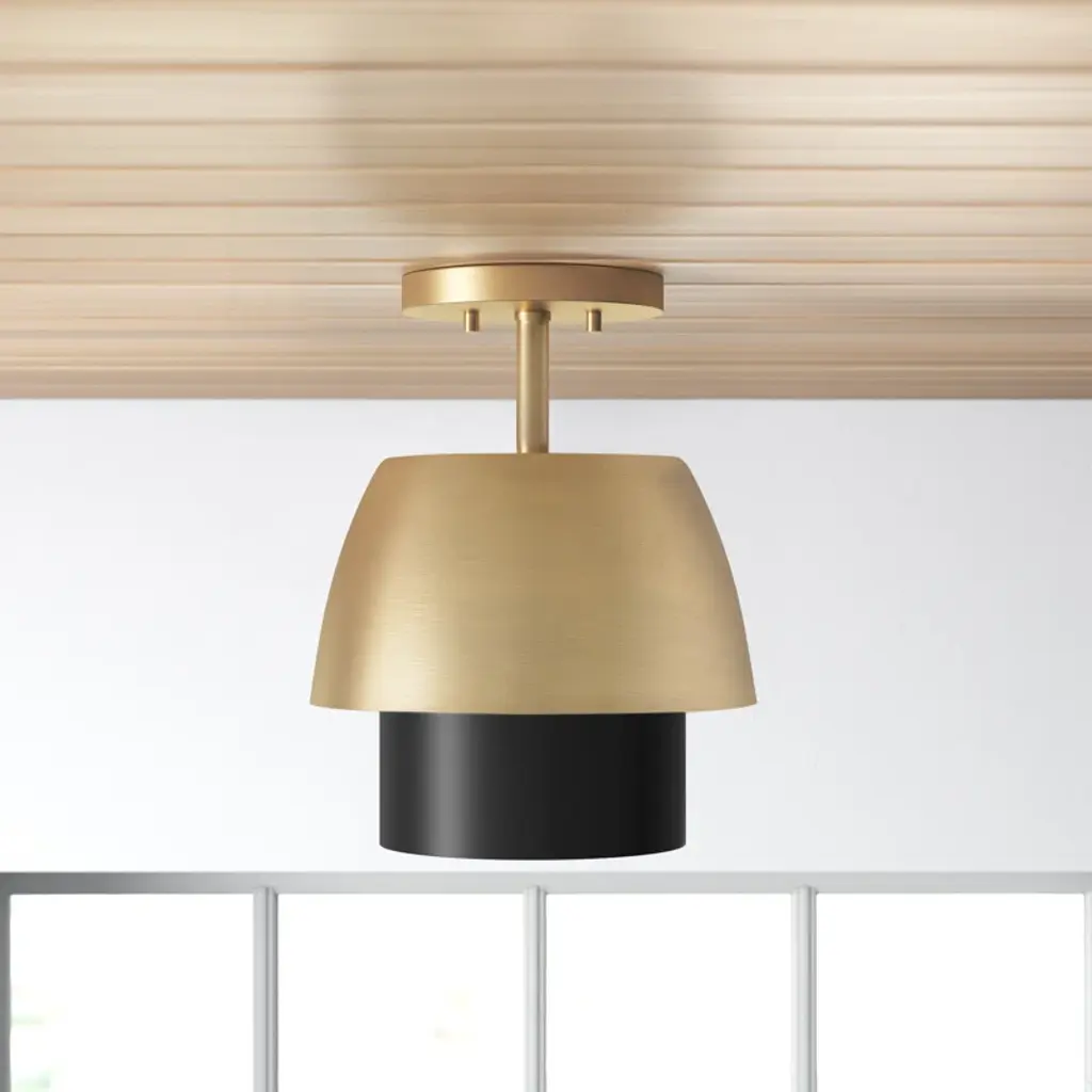 This streamlined semi-flush mount light features a bold silhouette with high-contrast shades for a retro look in your space. Crafted from metal, it features a dome shade in a satin brass finish with a circular backplate and a slim downrod. Beneath the dome shade, a secondary black cylinder shade directs the light of the 60W bulb (sold separately) downward, and layers in some visual dimension thanks to the contrasting finishes. This fixture is rated for damp spaces and is compatible with sloped ceilings and dimmer switches.