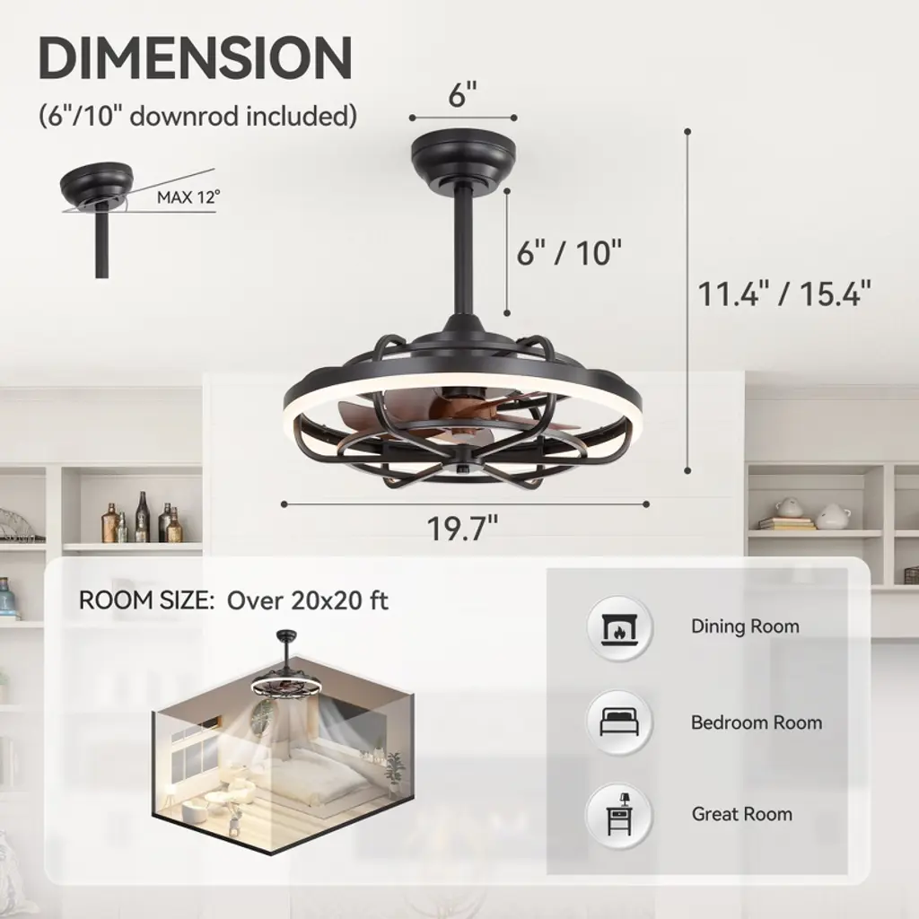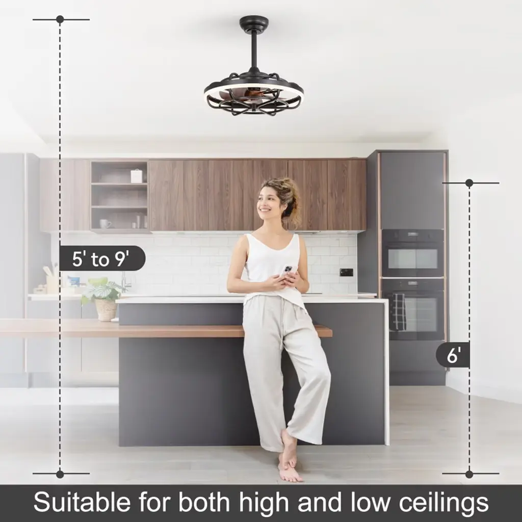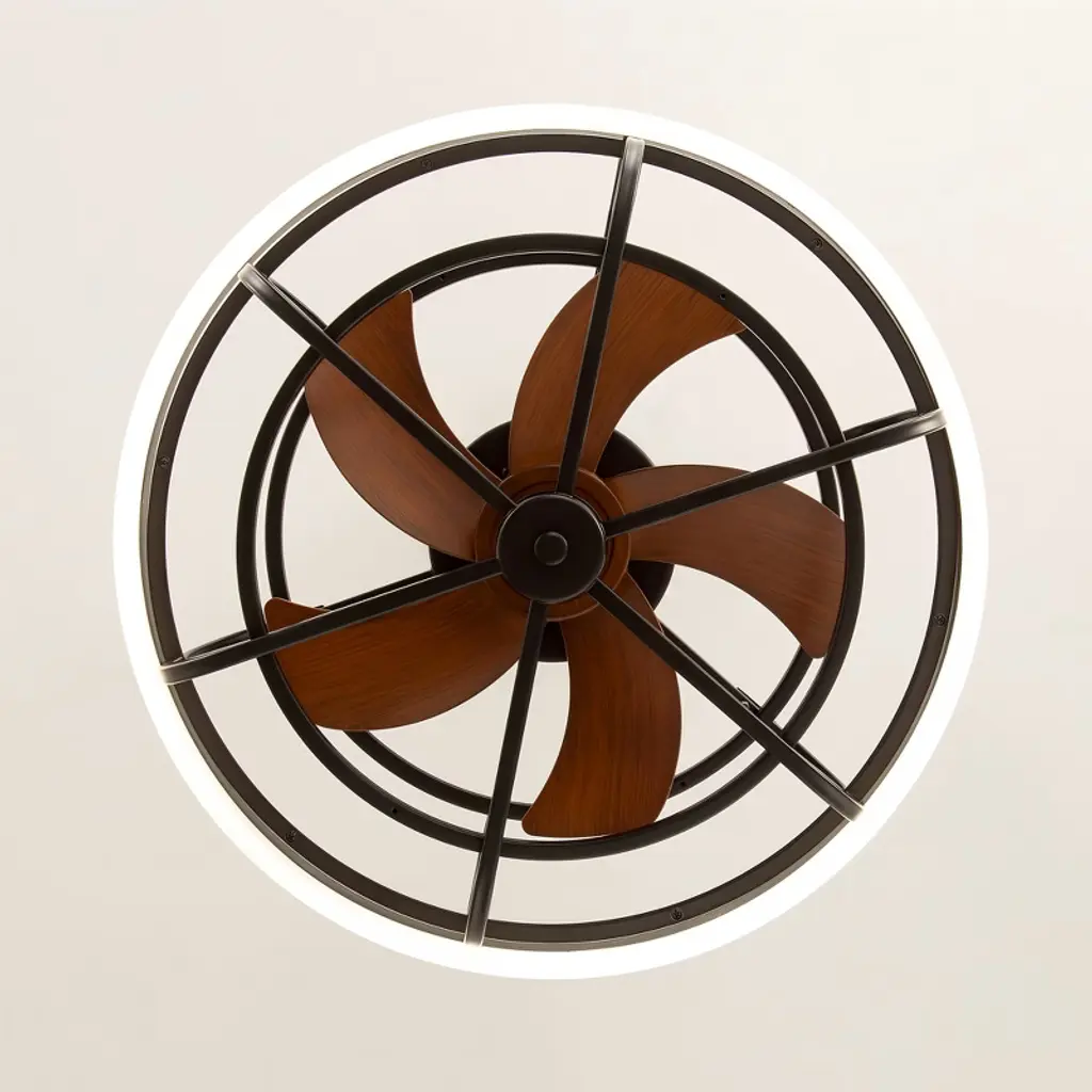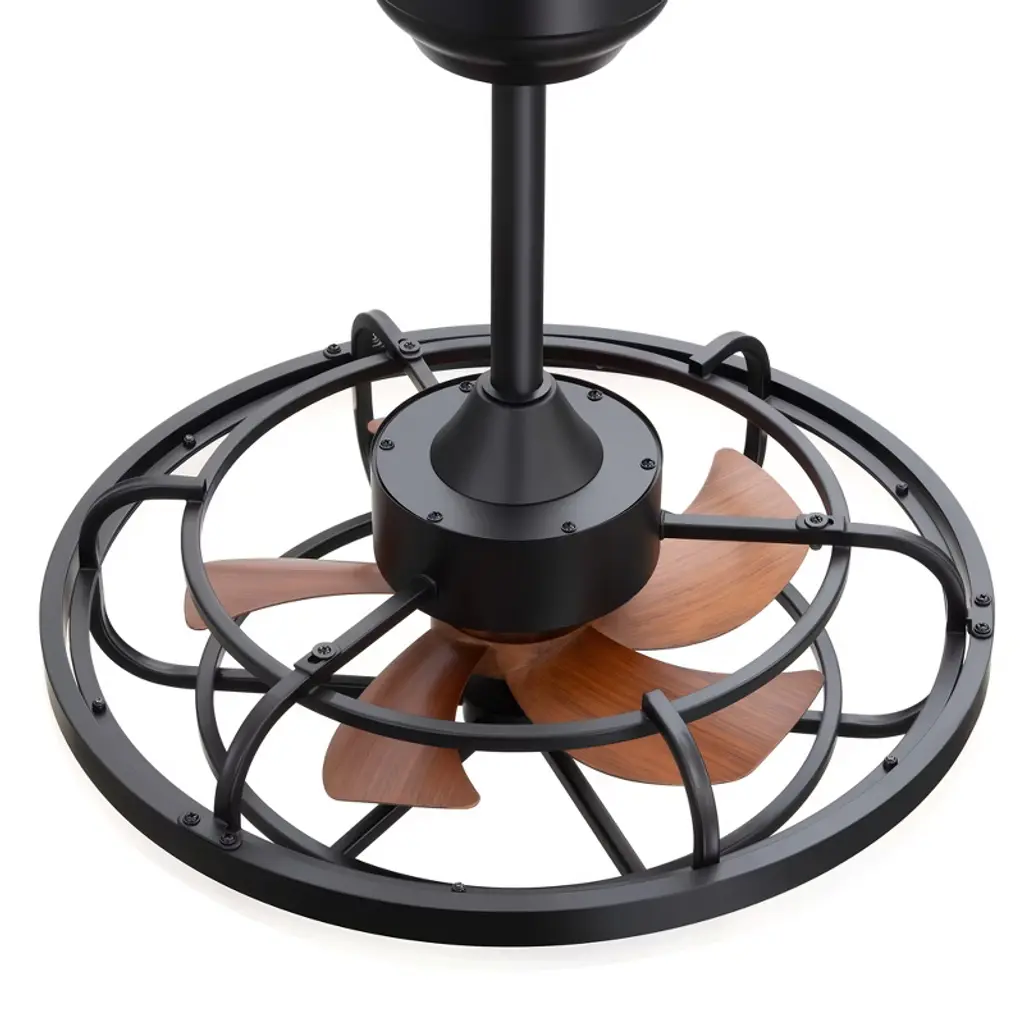 The Airsurfer 20" semi-flush mount ceiling fan is designed to deliver both comfort and style in a compact form. Featuring a modern caged design with matte black finish and wood-grain ABS blades, this fan fits perfectly in smaller rooms or low-ceiling areas. The energy-efficient LED light ring supports a memory function that retains your last brightness and color temperature settings after power loss. Controlled by a handy remote, this fan is ideal for bedrooms, kitchens, and hallways.