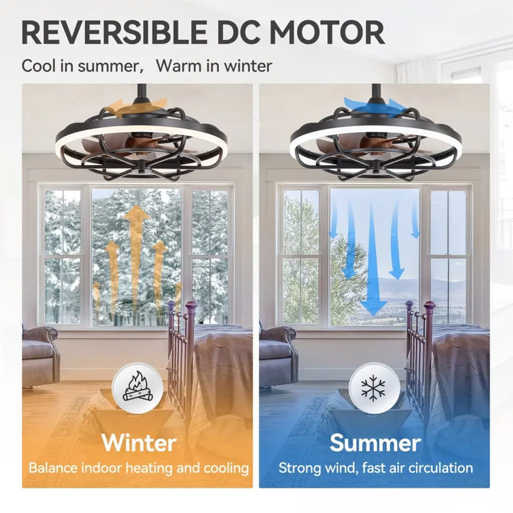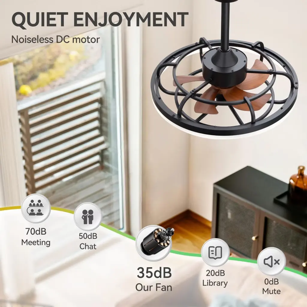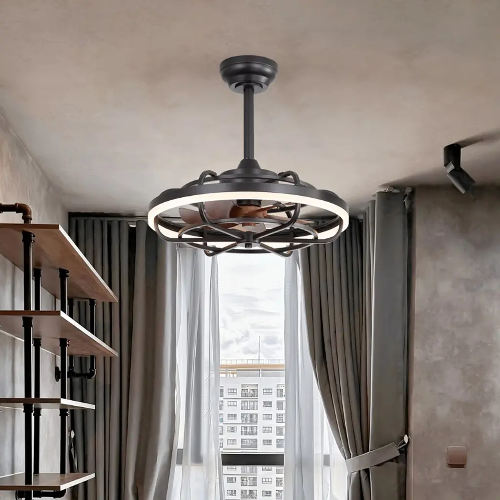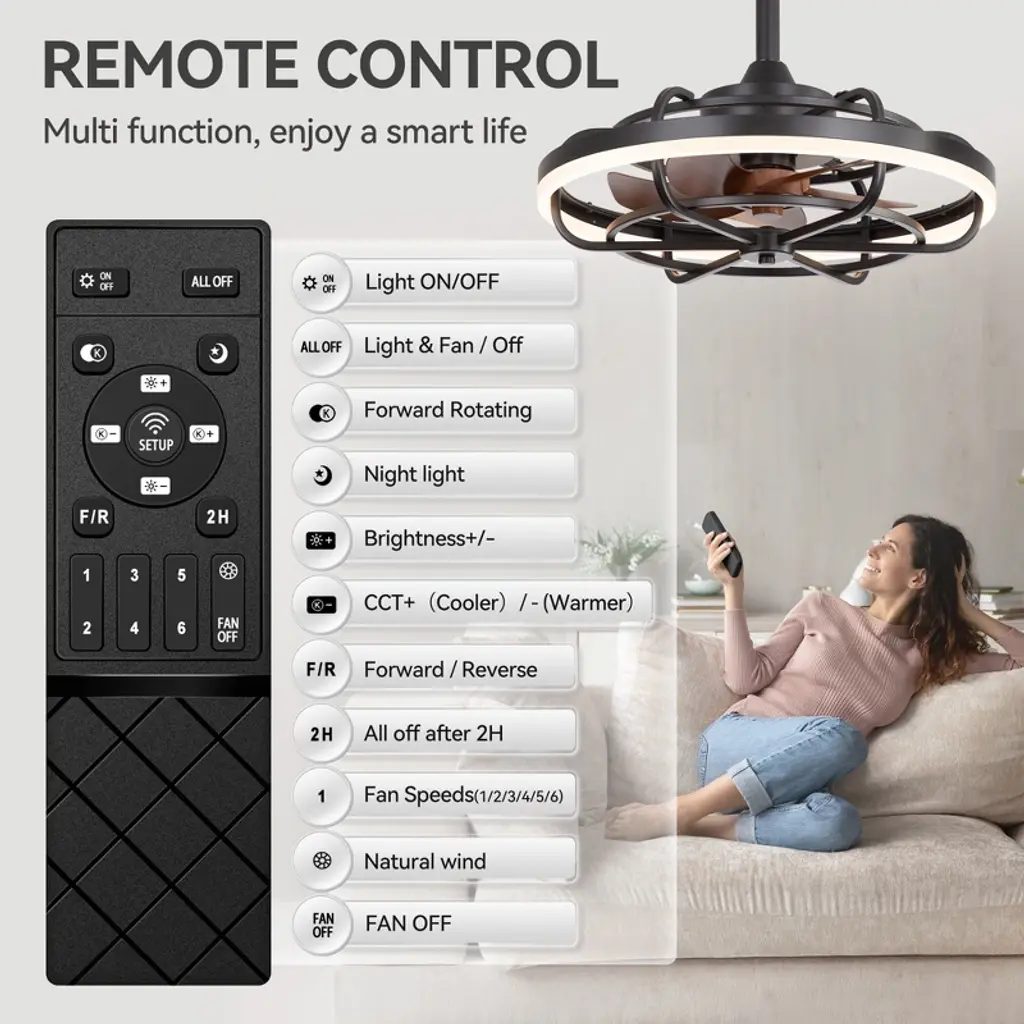 The Airsurfer 20" semi-flush mount ceiling fan is designed to deliver both comfort and style in a compact form. Featuring a modern caged design with matte black finish and wood-grain ABS blades, this fan fits perfectly in smaller rooms or low-ceiling areas. The energy-efficient LED light ring supports a memory function that retains your last brightness and color temperature settings after power loss. Controlled by a handy remote, this fan is ideal for bedrooms, kitchens, and hallways.