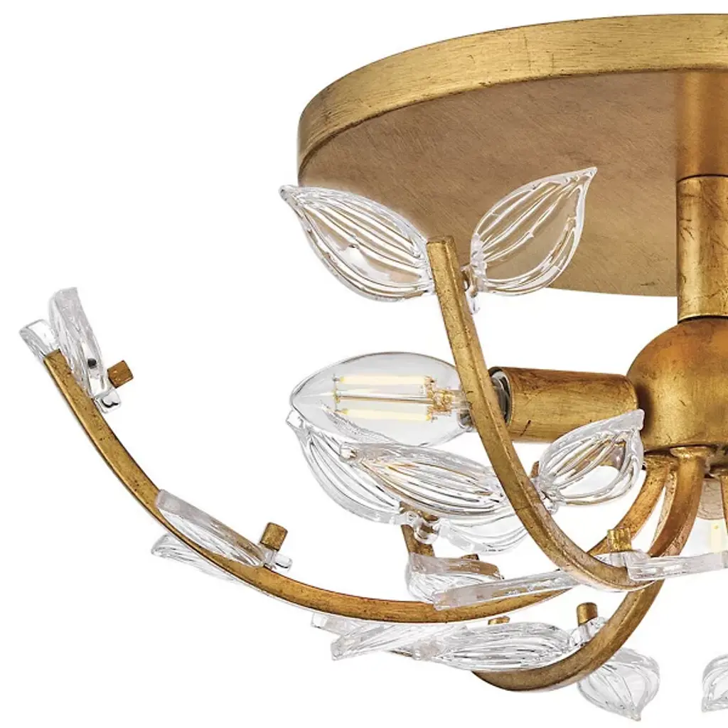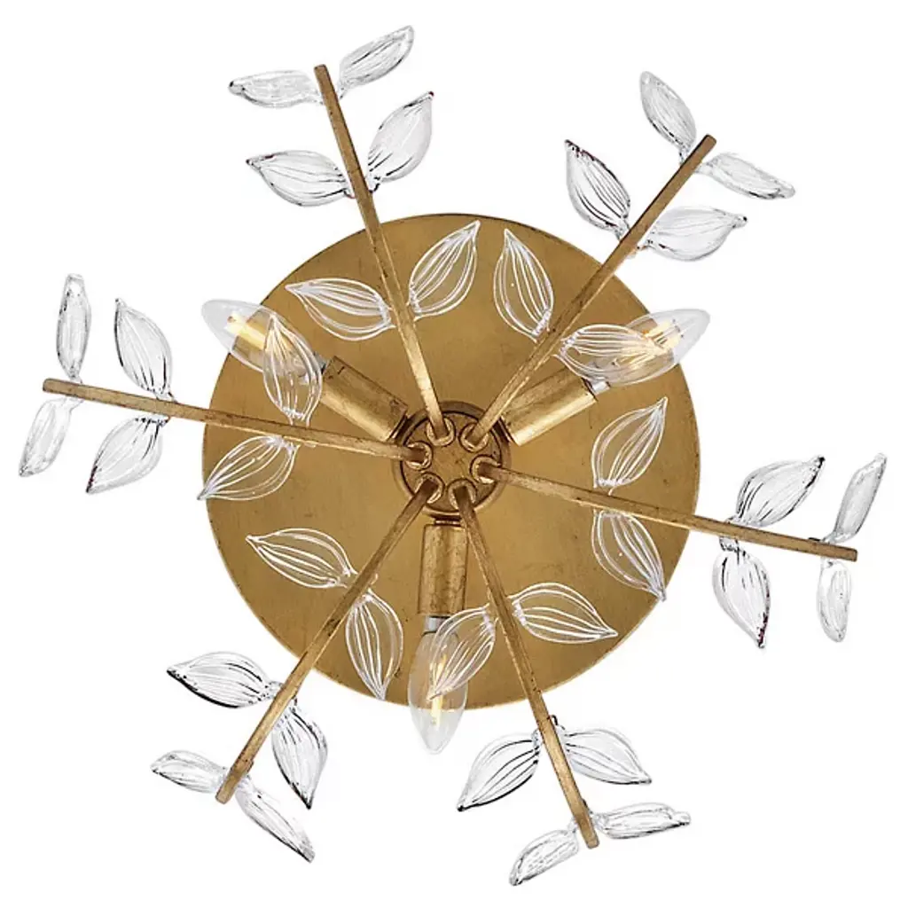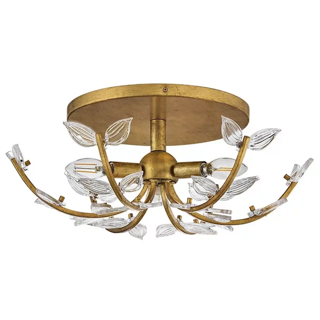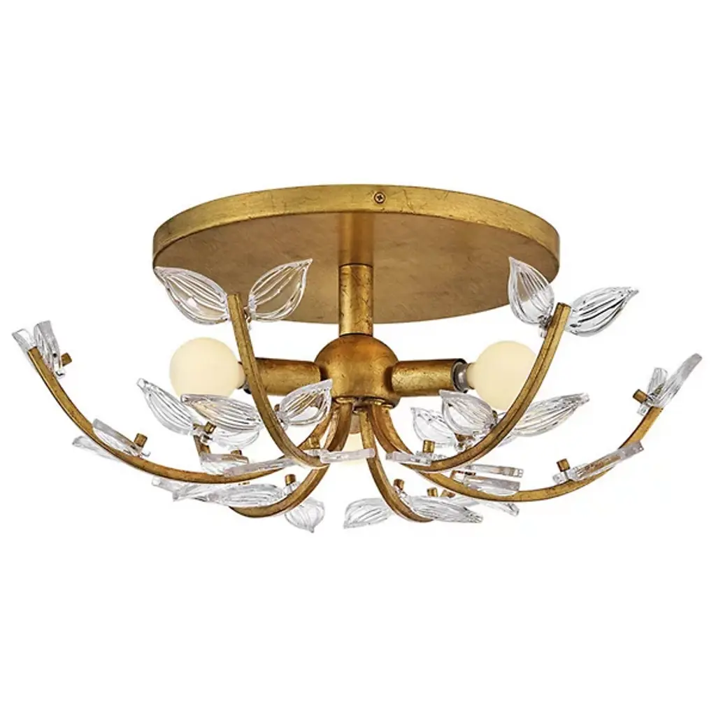 The Aliso Semi-Flushmount from Hinkley creates a garden-inspired canopy with its innovative branching design. Clear pressed glass leaves extend from curved metal stems, creating a naturalistic pattern across the ceiling. Unlike conventional ceiling fixtures that appear static, this design introduces movement through its organic arrangement of stems and leaves. The central light source radiates outward, illuminating each glass element to create a vibrant play of brightness and shadow. The multi-directional arrangement of stems ensures that light distributes evenly throughout the space while maintaining a cohesive design.
