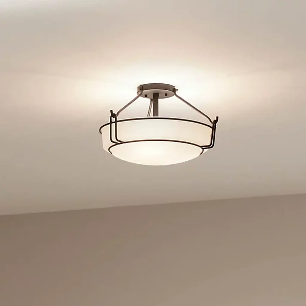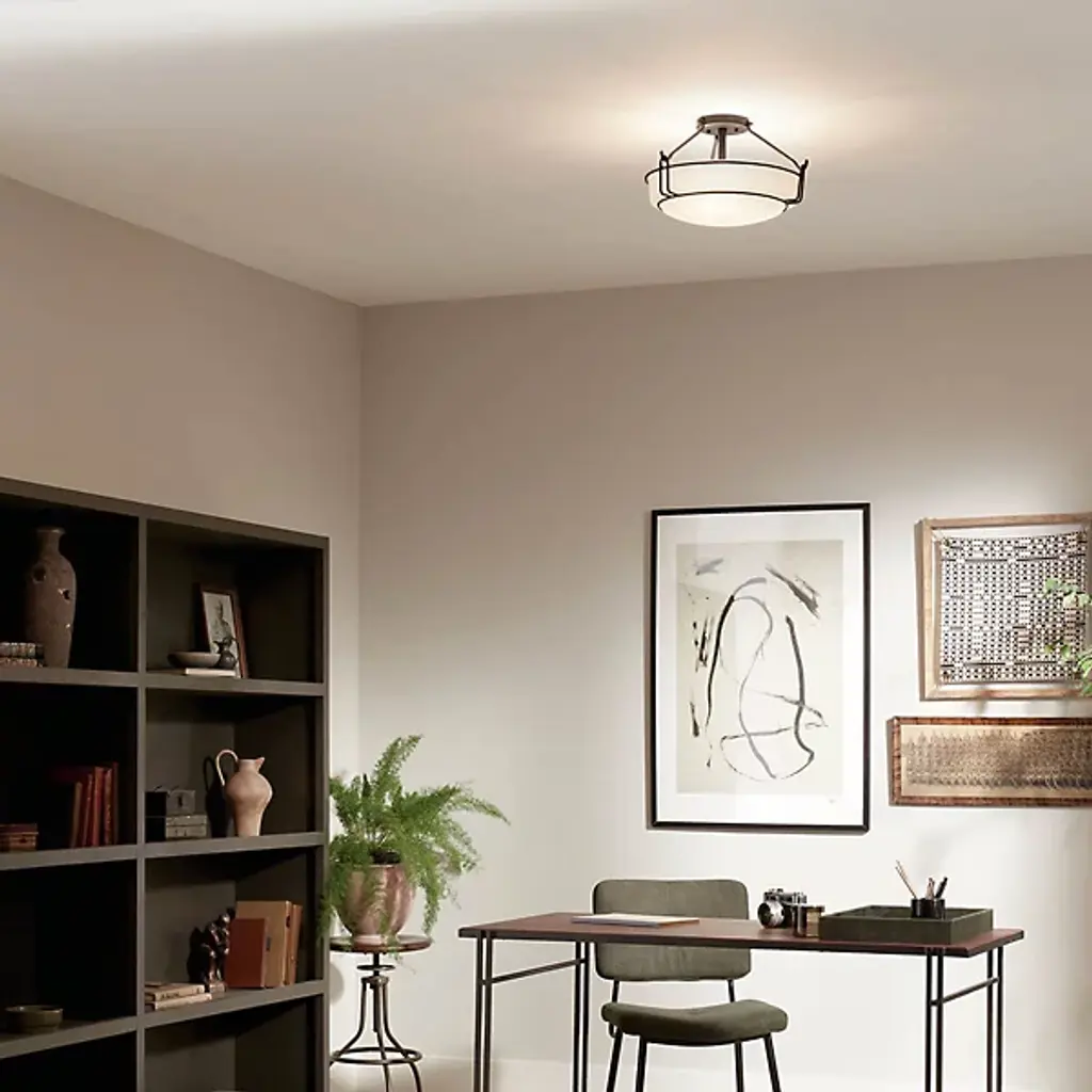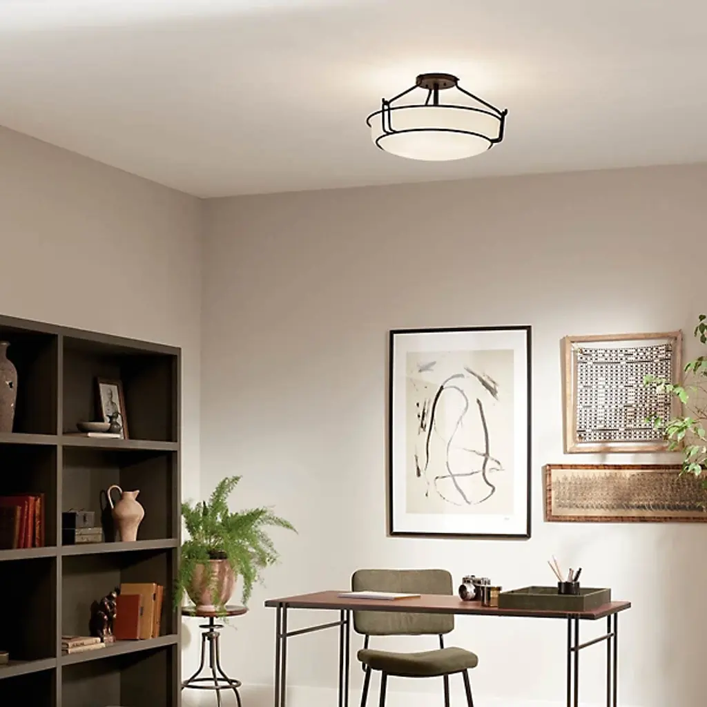 The Alkire Semi-Flushmount form Kichler has transitional style rooted in minimalist tradition. The opaque Glass shade is suspended from the canopy with “hook and eye” style metal work, which adds a dash of rustic flair to your design environment. The light is efficiently diffused by the shade, providing essential ambient light that is needed in every room.